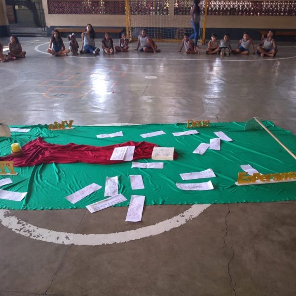Diariamente na quadra coberta do Instituto Imaculado Coração de Maria — Unidade de Serviço Socioassistencial-RJ, realizamos o momento de espiritualidade em ambos turnos: manhã e tarde, para atingirmos todos os usuários.