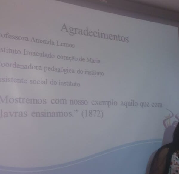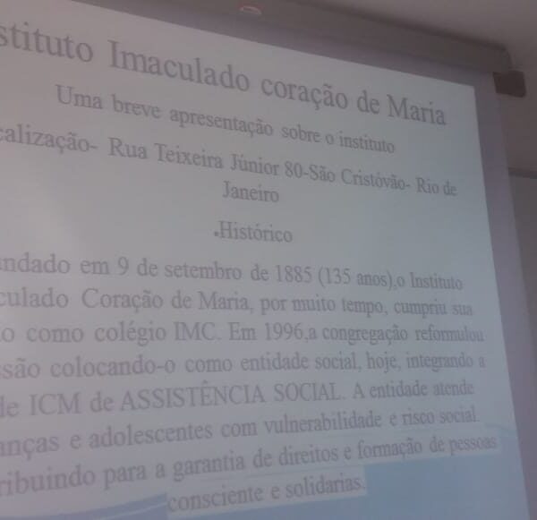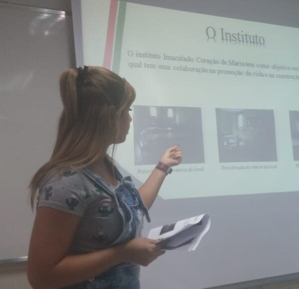 Alunos dos Cursos de Serviço Social e Pedagogia da Universidade Castelo Branco realizaram durante este semestre uma pesquisa sobre as oficinas socioassistenciais aplicadas no Instituto Imaculado Coração de Maria –Unidade de Serviço Socioassistencial. Nesta data 05/12/2018 realizou a apresentação da conclusão do trabalho, com a presença do Assistente Social Sergio de Oliveira Espínola Júnior – Funcionário da Unidade.