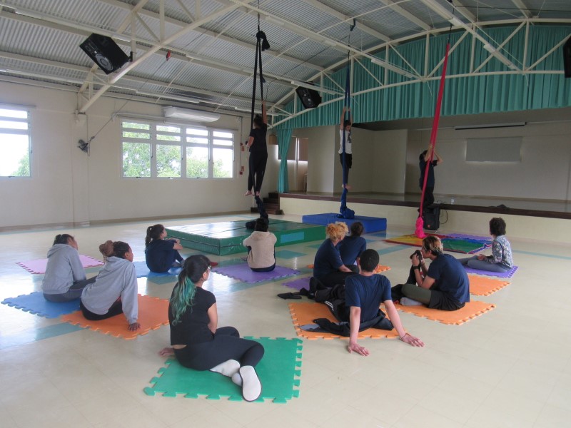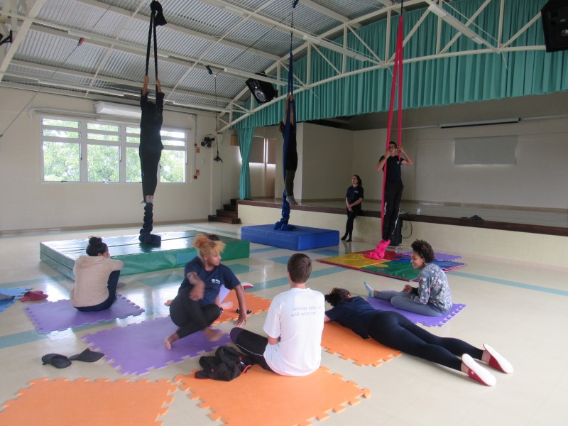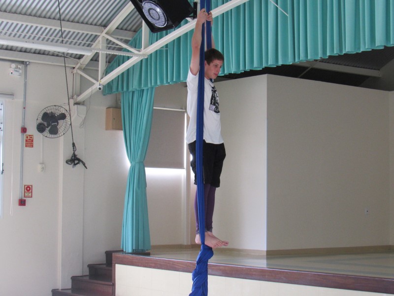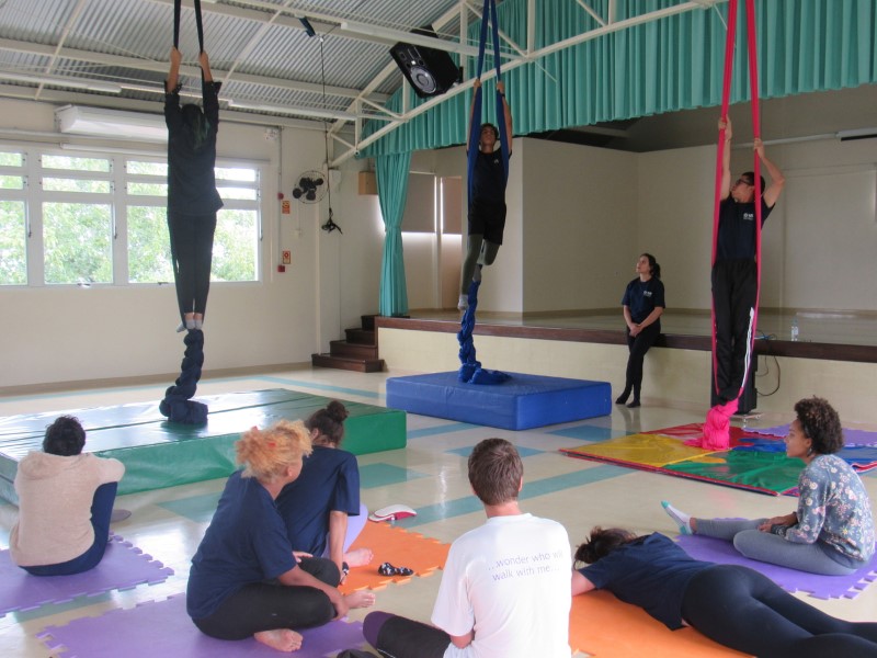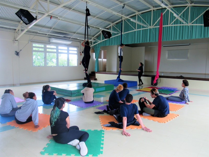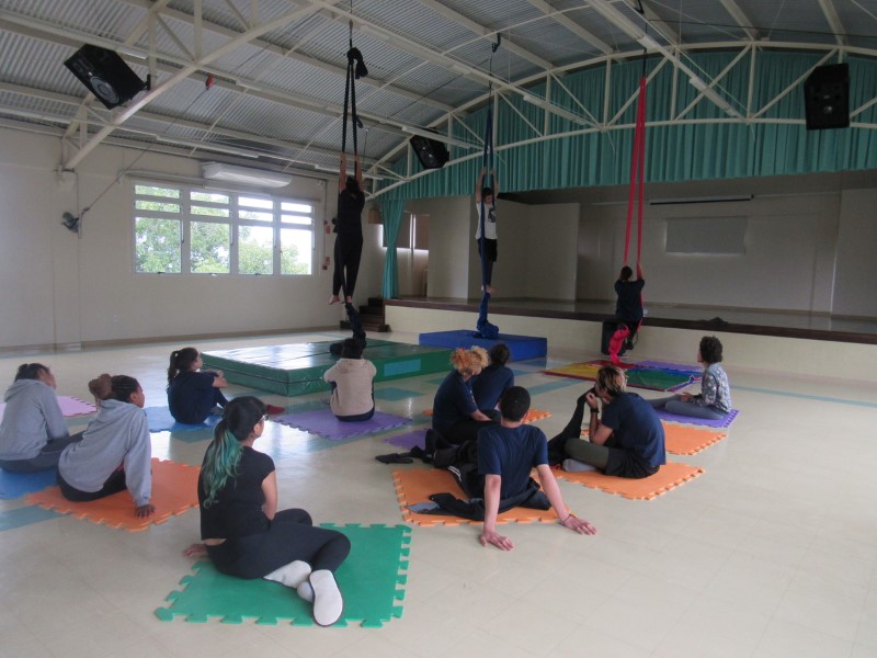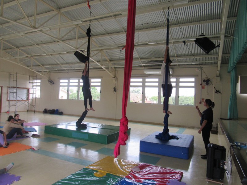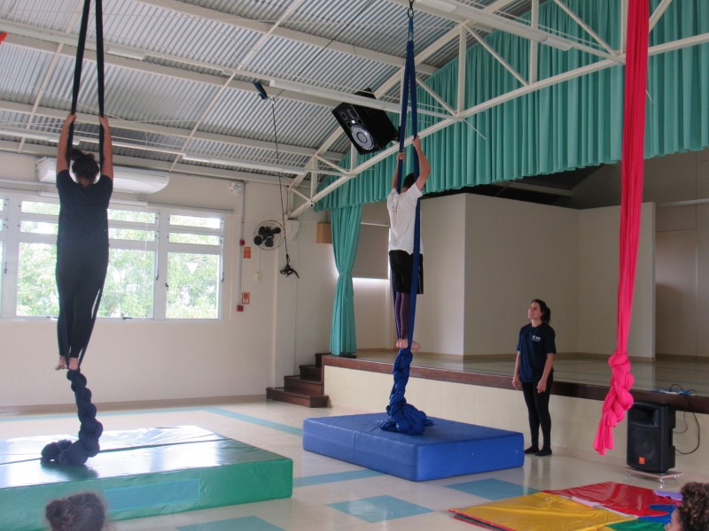 Na modalidade Oficinas Culturais, os jovens estão aprendendo as técnicas de como subir no tecido acrobático.