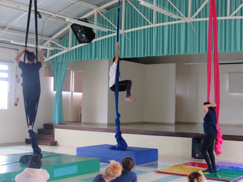 Primeiramente é feito alongamento, como o tecido acrobático usa os músculos extensivamente, então é importante que estejam alongados o suficiente. Após foi feito os exercícios de equilíbrio  testando seus limites e forças, para então começar a subir no tecido. Com o auxílio da educadora Joana, todos seguem passo a passo para poder realizar a atividade com sucesso!
