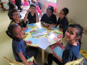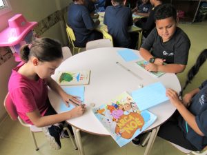 As crianças da Turma A fizeram ontem a atividade de leitura, e interpretação de texto. Cada um escolheu um livro e após fazer a leitura deveriam reescrever a história com suas palavras, eles tiveram o auxílio da educadora Daniela para fazer toda a atividade.