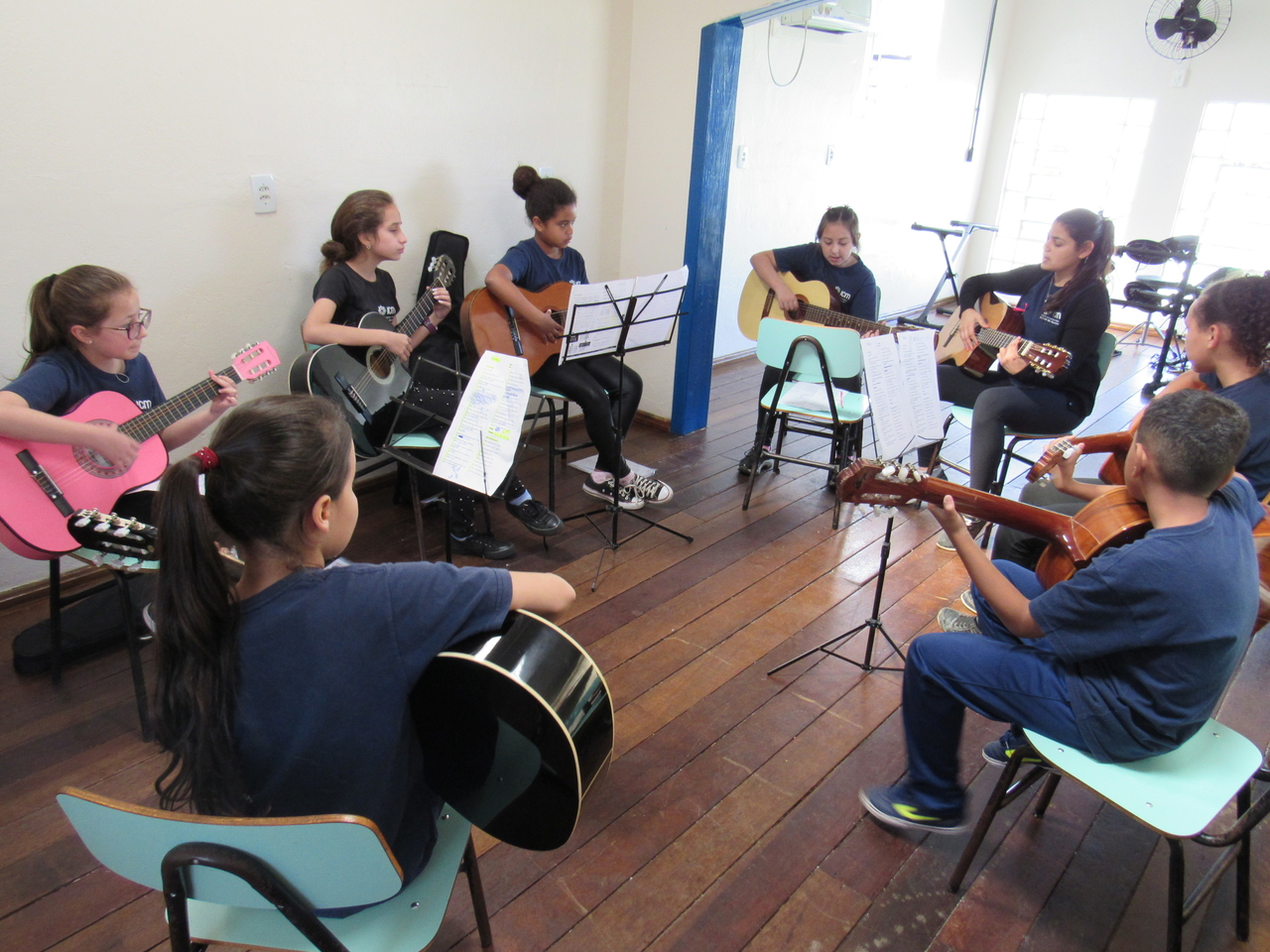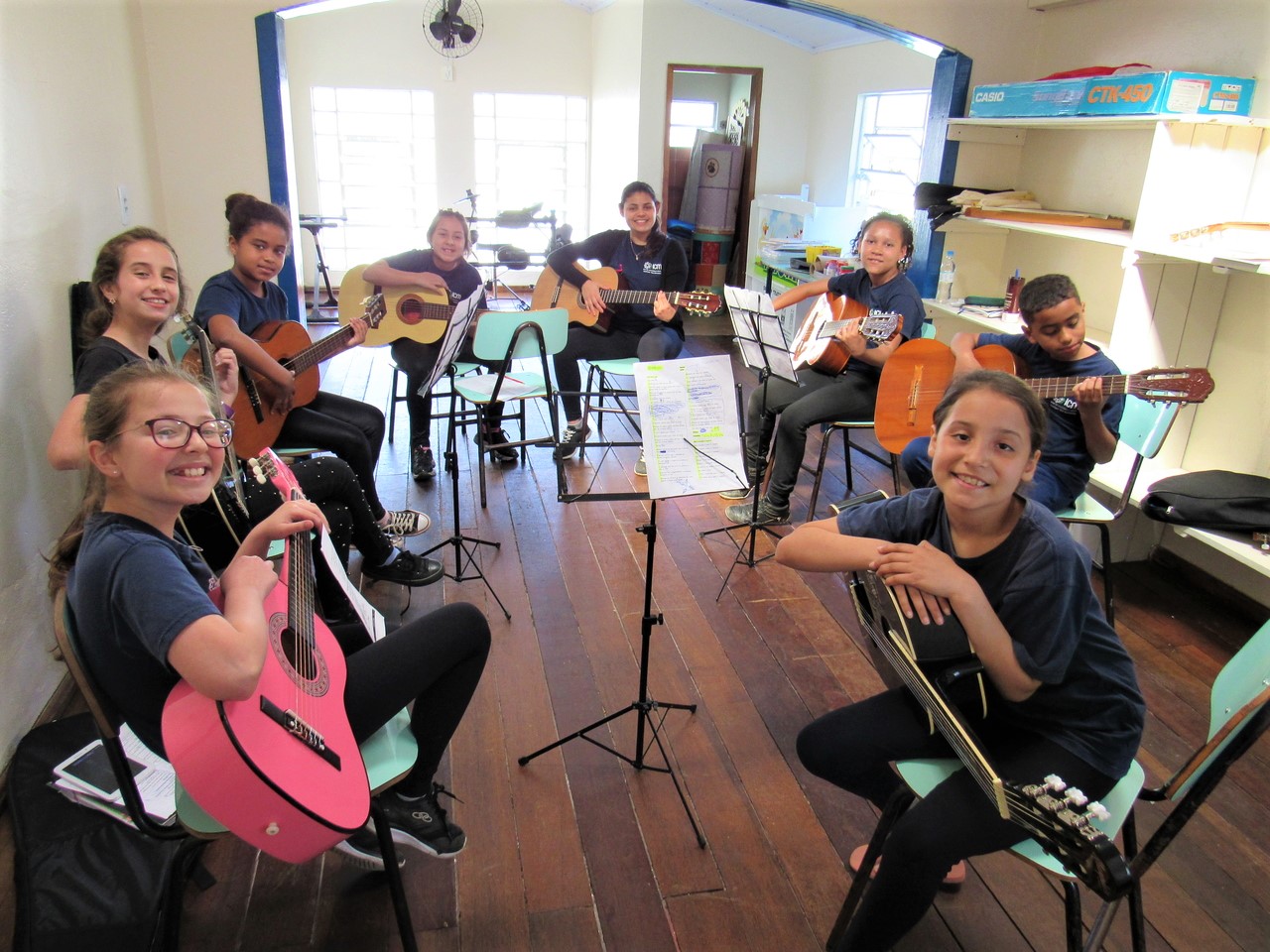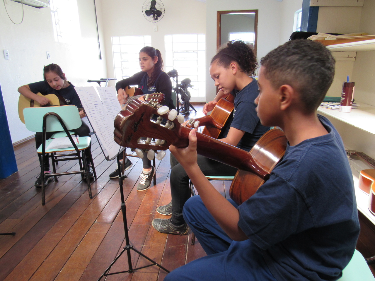 As crianças do Serviço de Convivência e Fortalecimento de Vínculos (SCFV) no Instituto São Benedito, aprendem a tocar diversas músicas na aula de violão que acontece uma vez por semana.