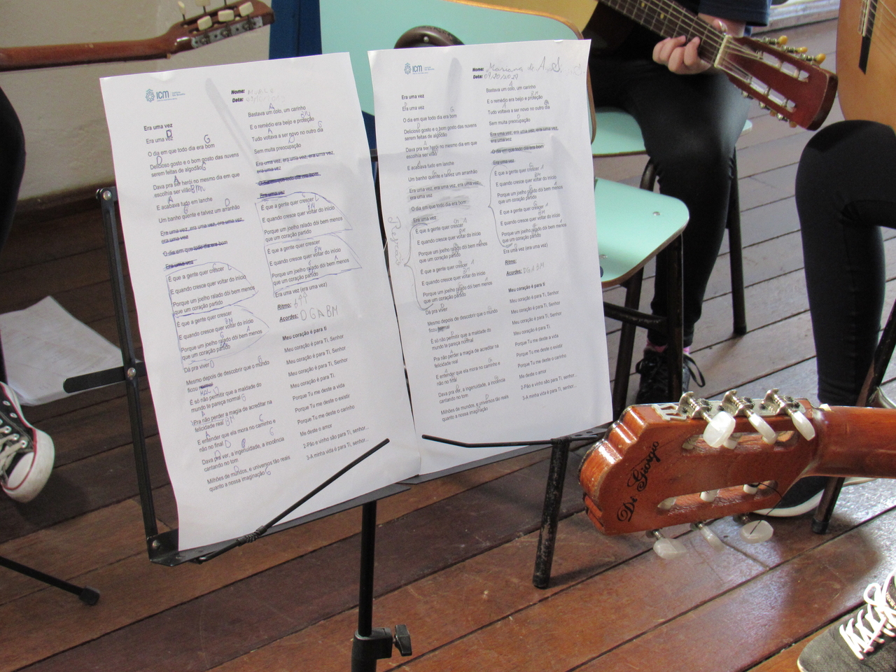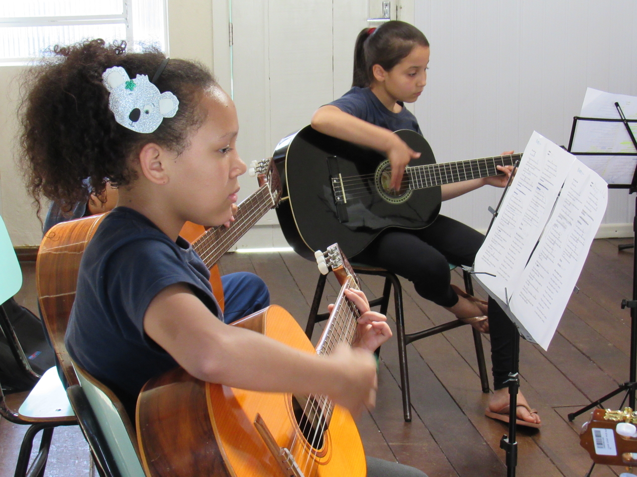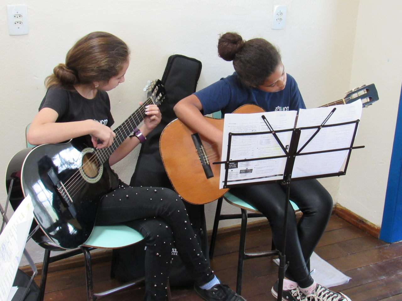 As crianças do Serviço de Convivência e Fortalecimento de Vínculos (SCFV) no Instituto São Benedito, aprendem a tocar diversas músicas na aula de violão que acontece uma vez por semana.