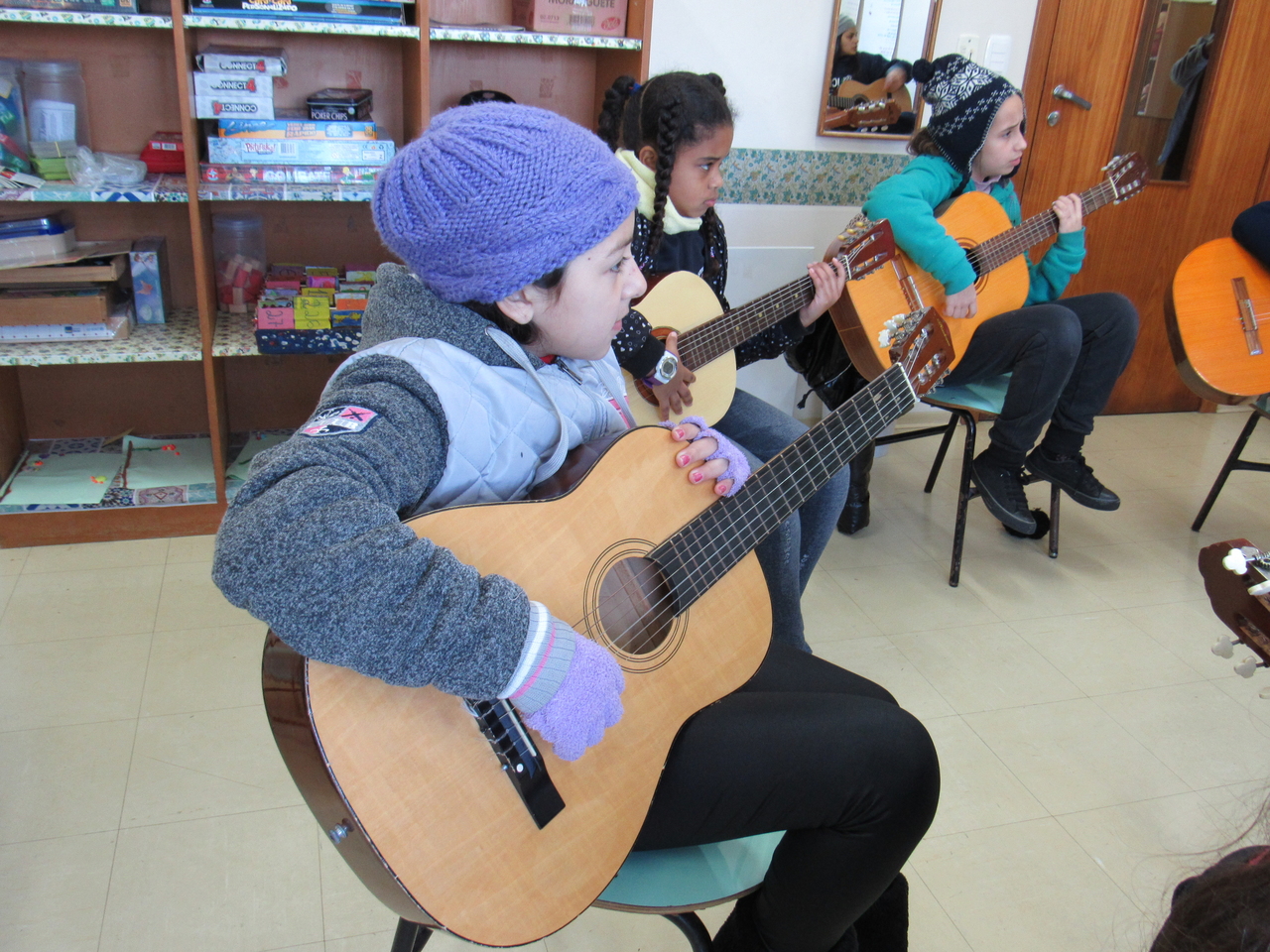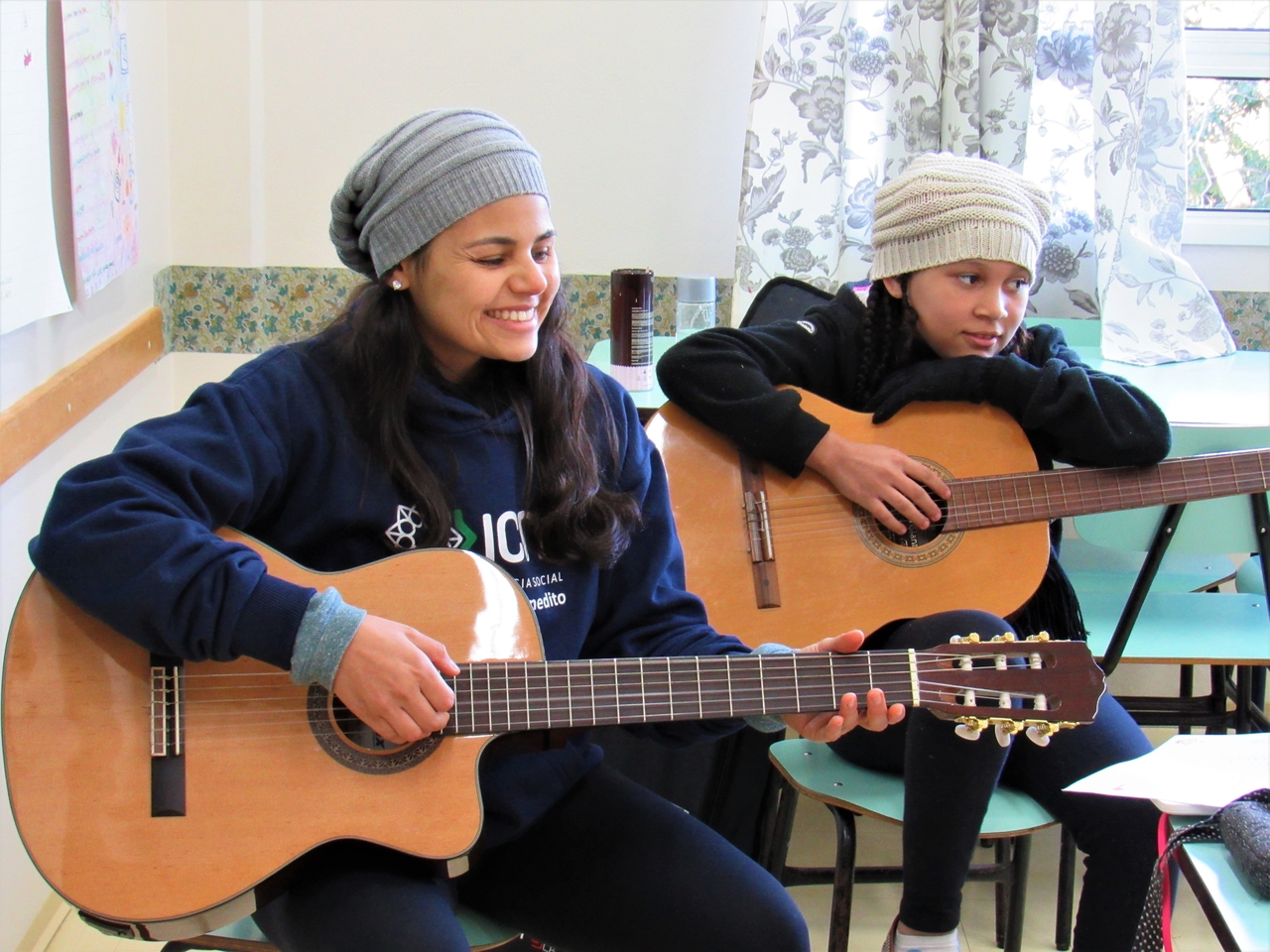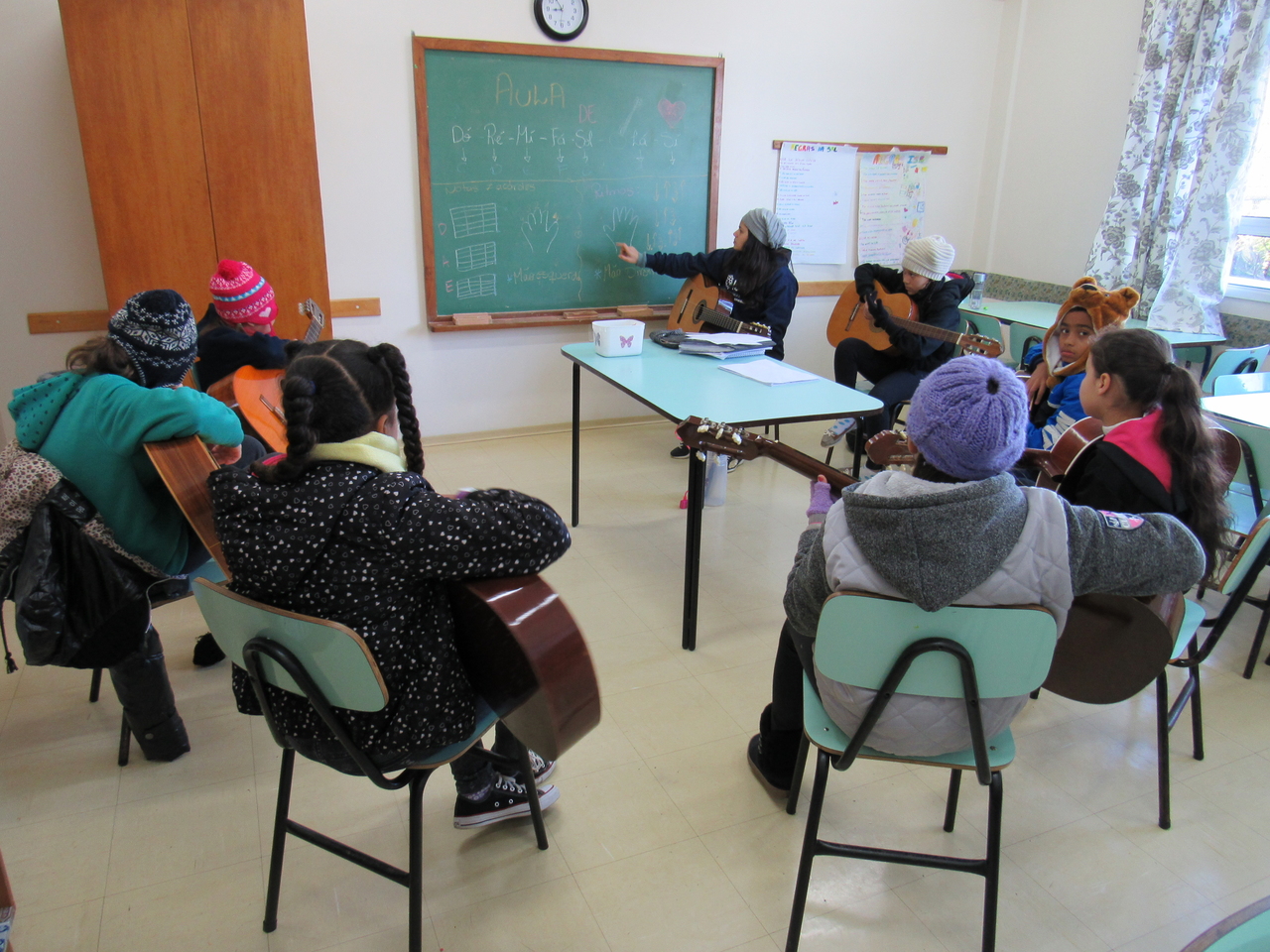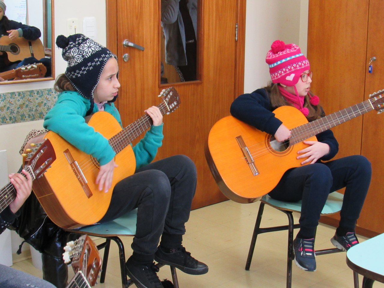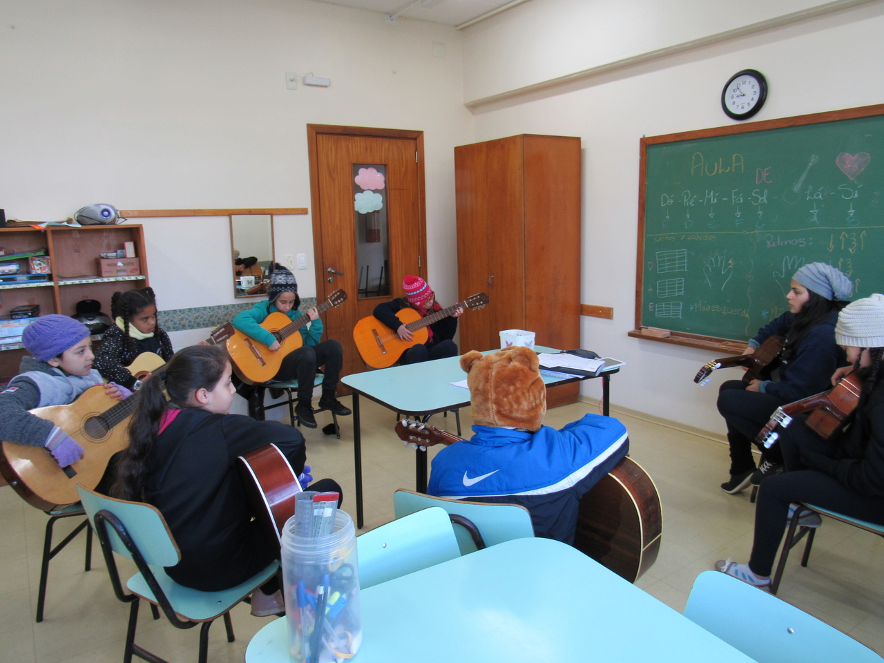 As crianças da Turma B neste dia tiveram aula de violão com a educadora Mariana, começaram a aprender as notas e acordes para tocar violão.