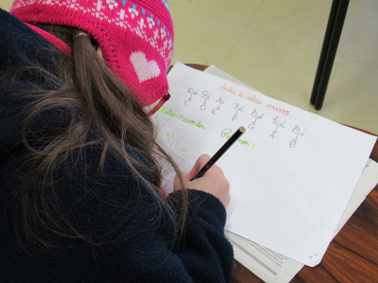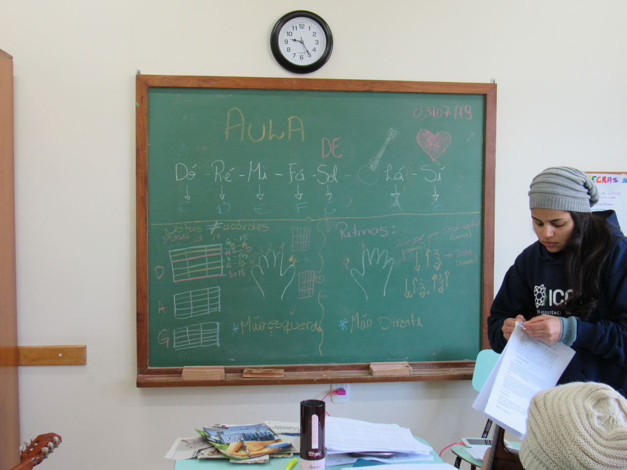 Durante a aula tiveram o momento de aula teórica e prática  anotaram as informações e aprendendo os ritmos tocaram algumas notas musicais.