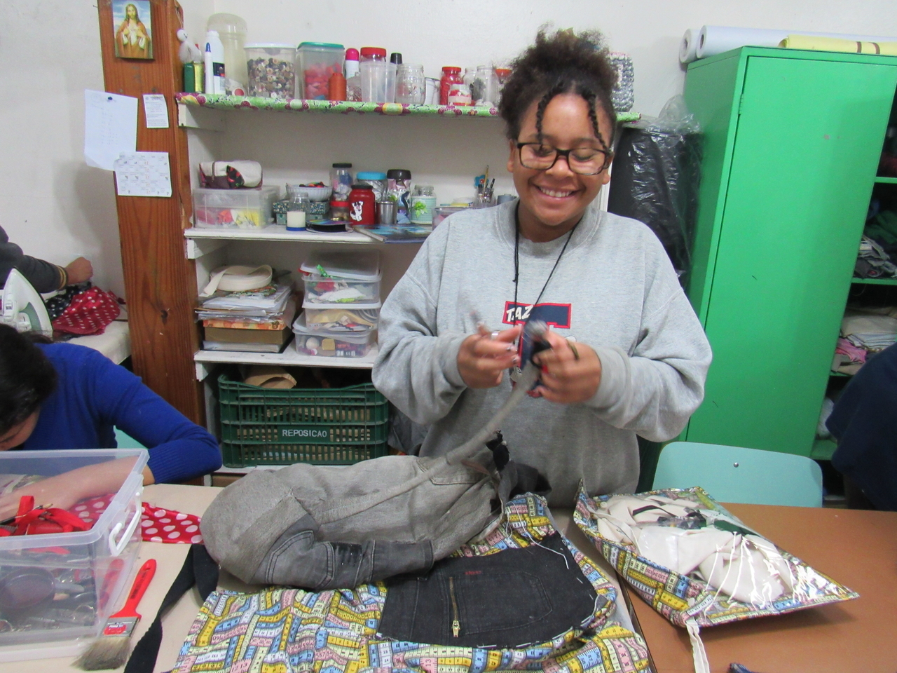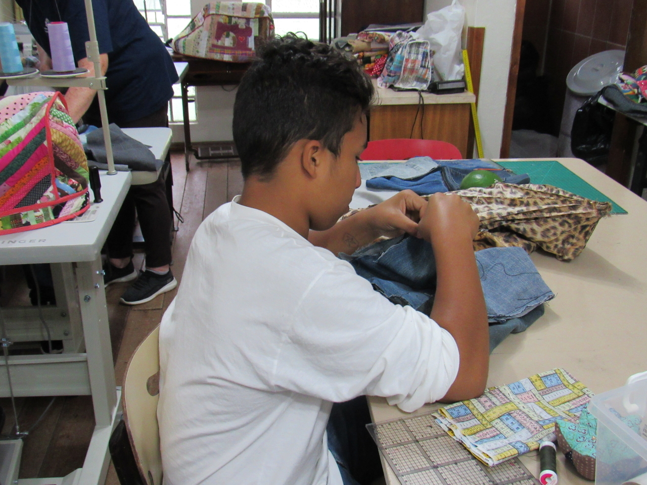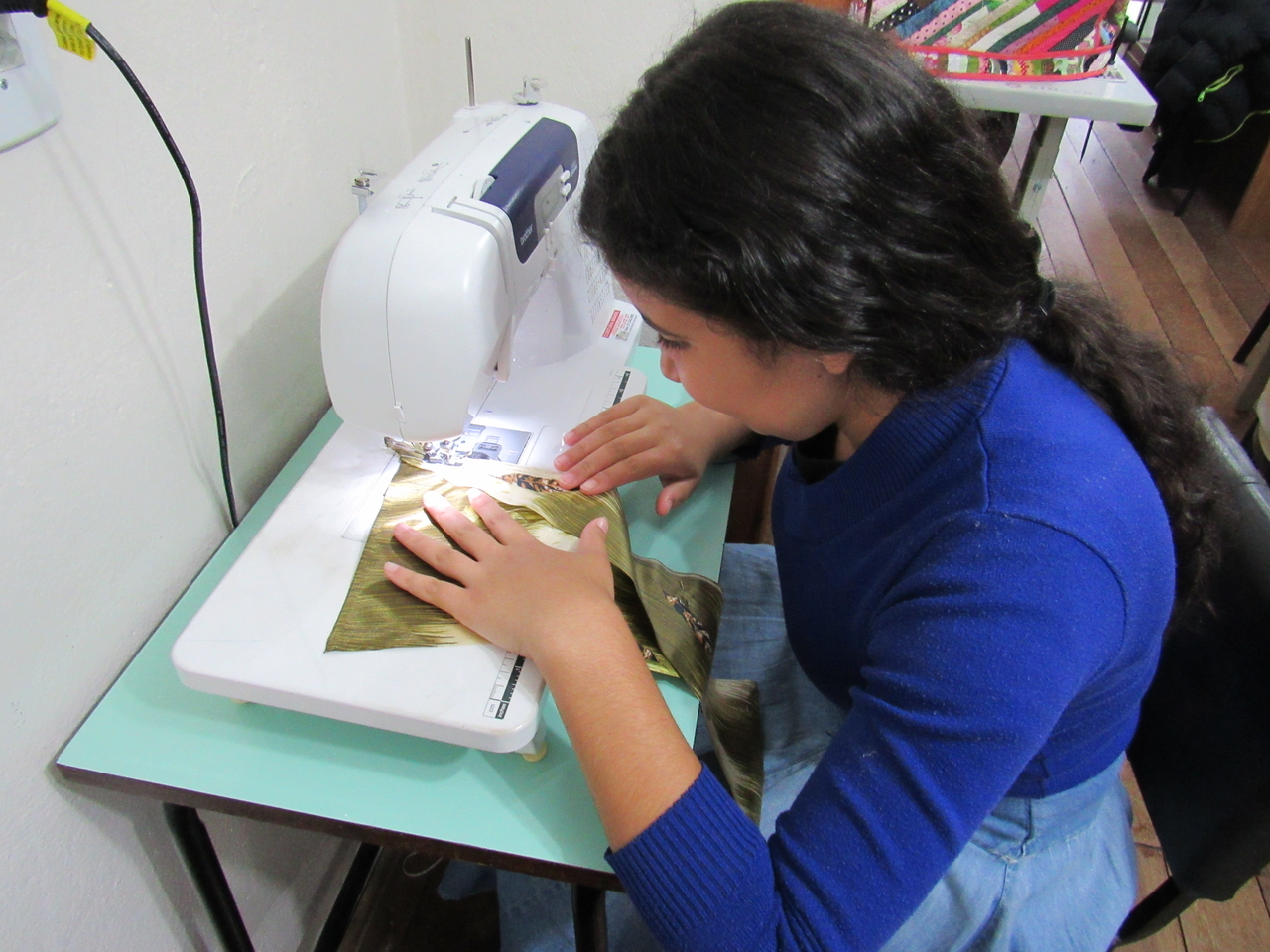 Os jovens da modalidade de Customização aprenderam nesta semana juntamente com a educadora Verônica a utilizar a máquina de costura, para poder então realizar a tarefa de criação e customização de mochilas.