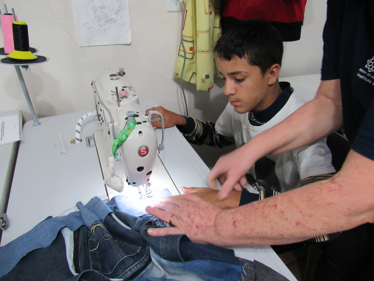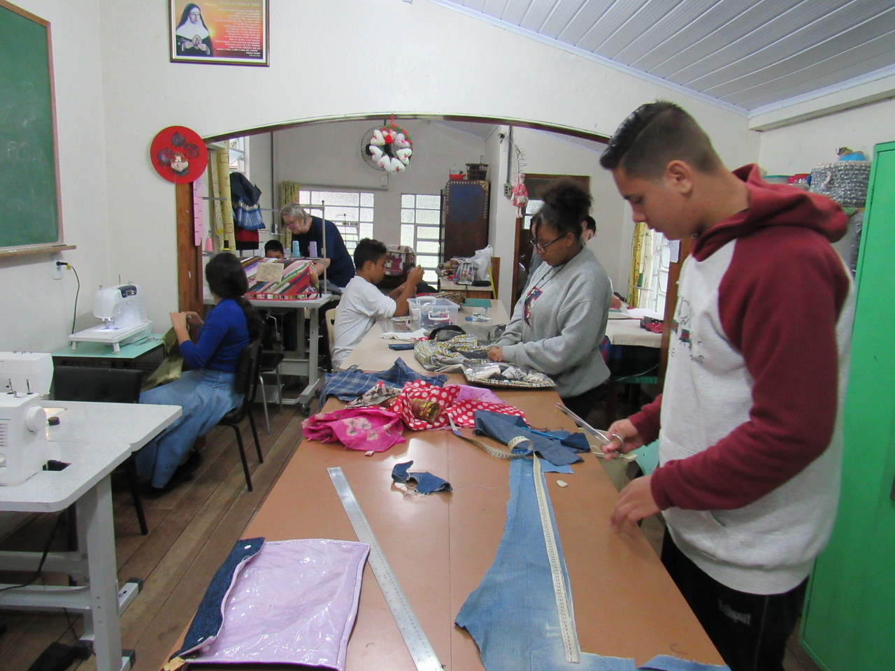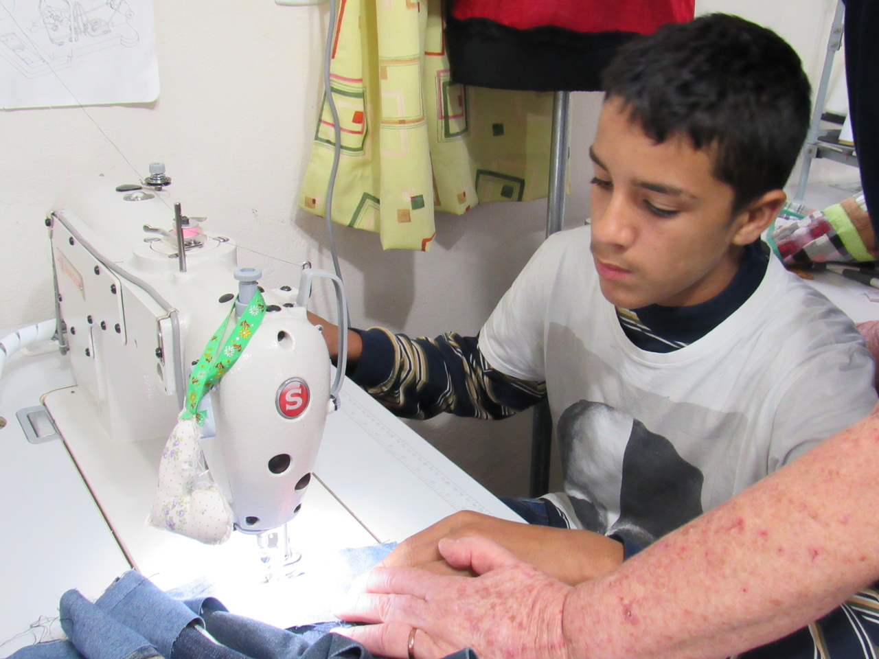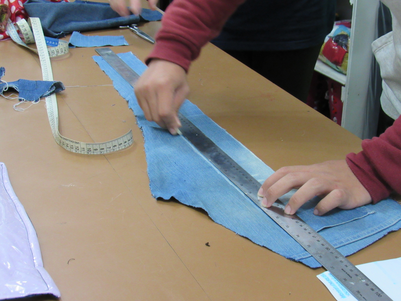 Em momento de concentração, os jovens aprendem primeiro a riscar os moldes  e a fazer o corte dos tecidos antes de ir para a parte da costura.