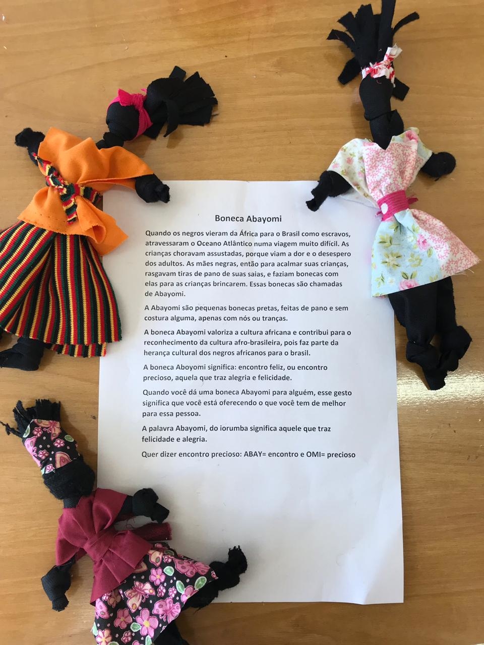 A Abayomi tem como significado “Encontro Precioso” e  “Encontro Feliz”, as bonecas Abayomi são pequenas bonecas pretas, feitas de pano e sem nenhuma costura, feitas apenas com nós ou tranças. A boneca Abayomi valoriza a cultura africana e contribui para o reconhecimento da cultura afro-brasileira, pois faz parte da herança cultural dos negros africanos para o Brasil.