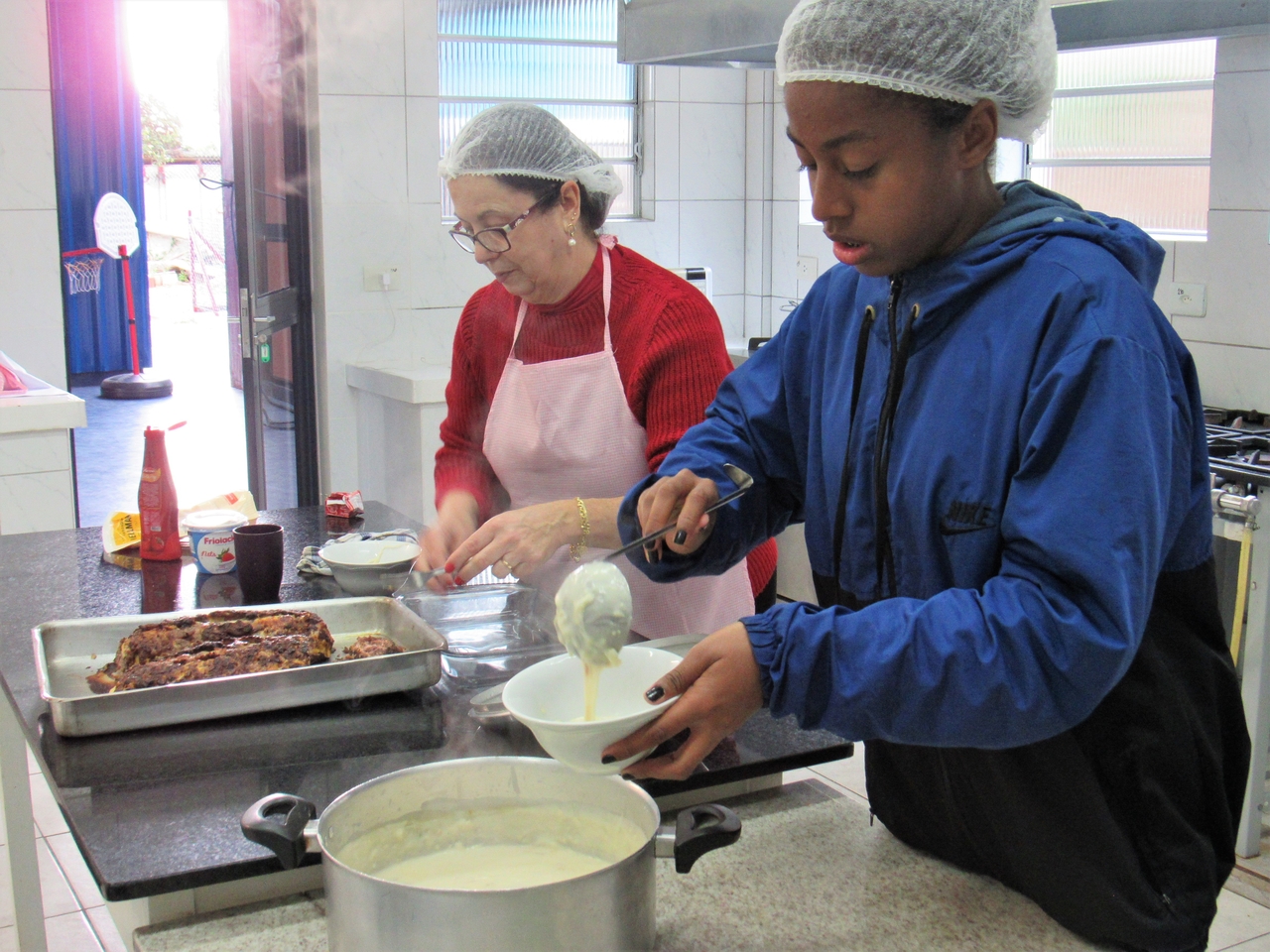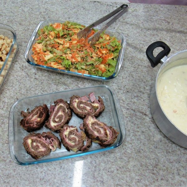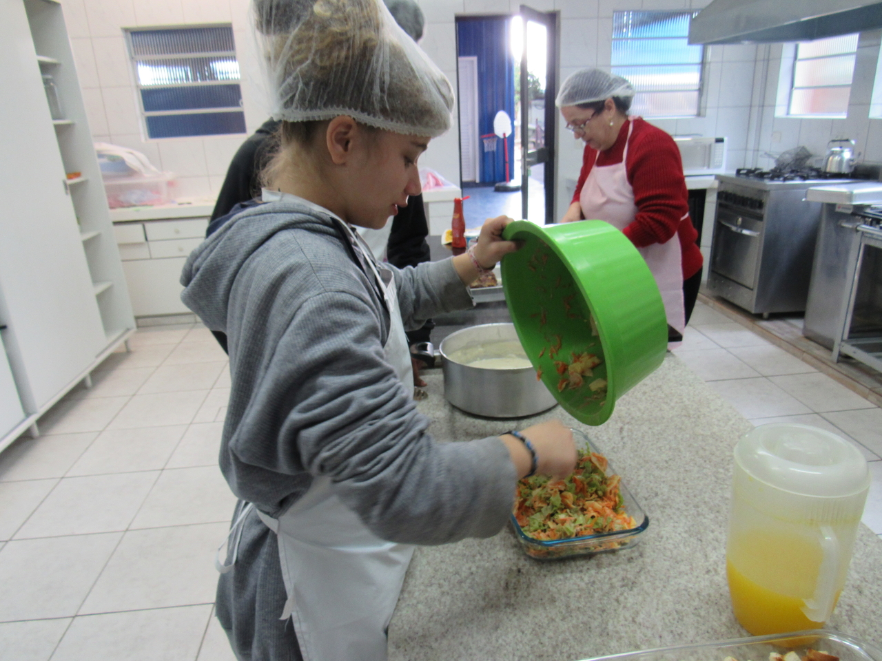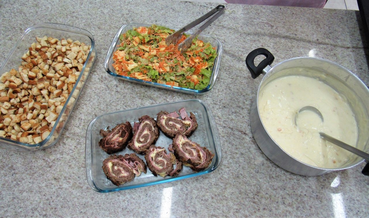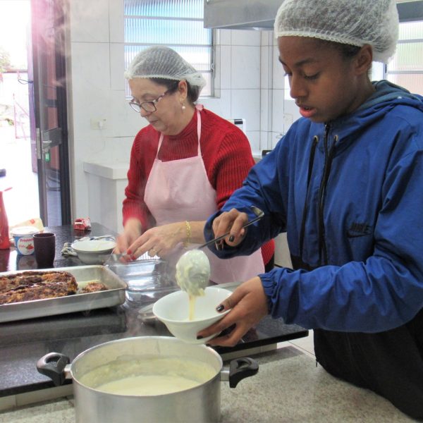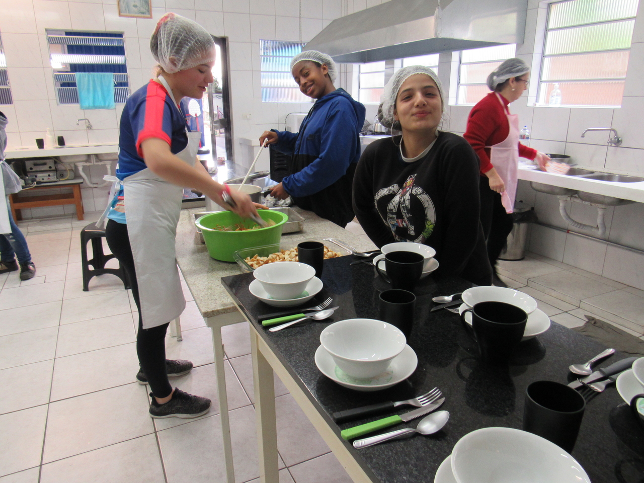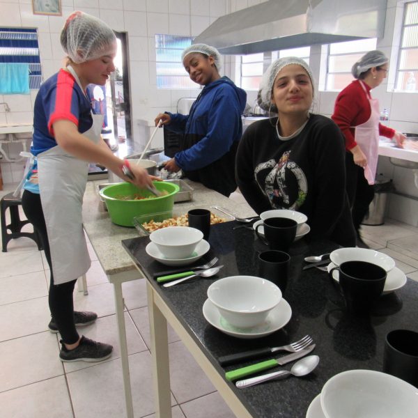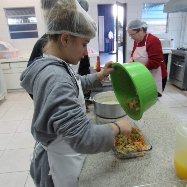 Dia de receita nova na modalidade de culinária, neste dia os adolescentes aprenderam com a educadora Norma o seguinte cardápio: Creme de cebola com croutons, rocambole de guisado e salada de verão.