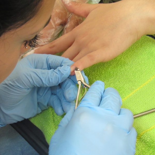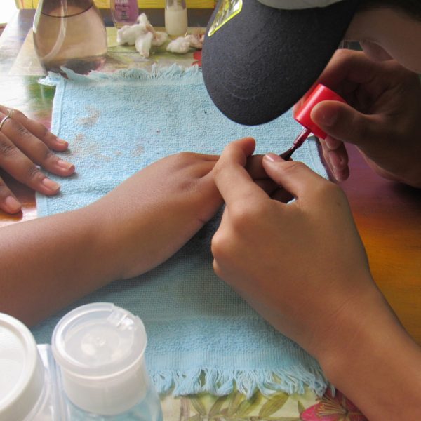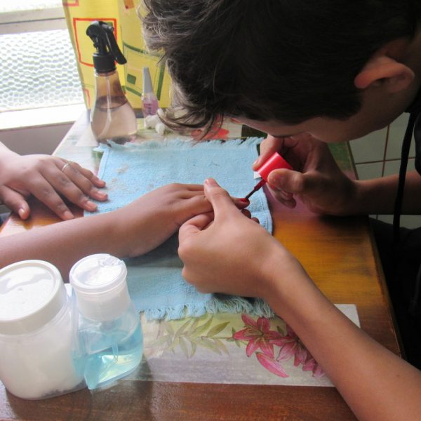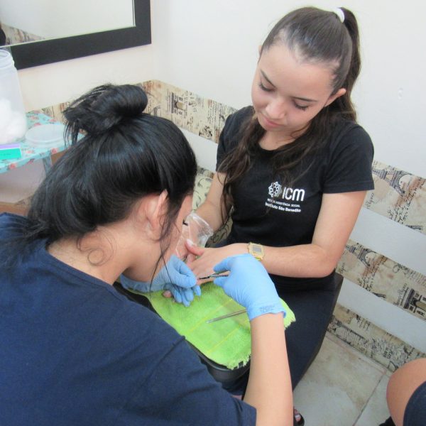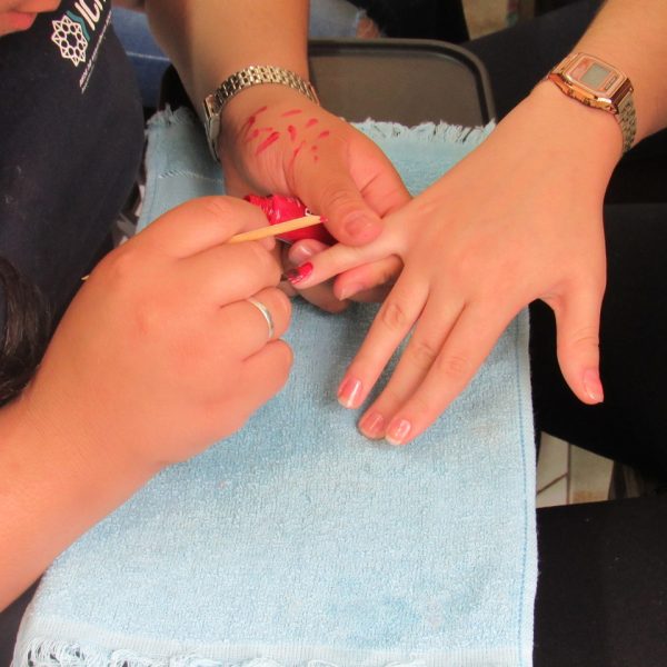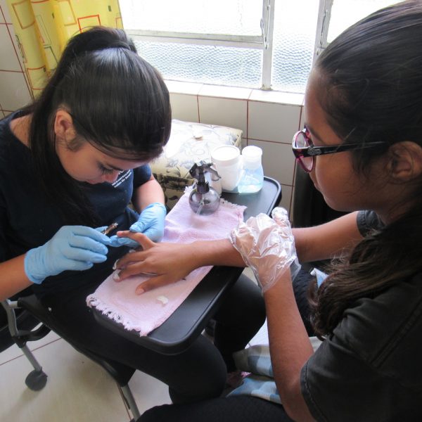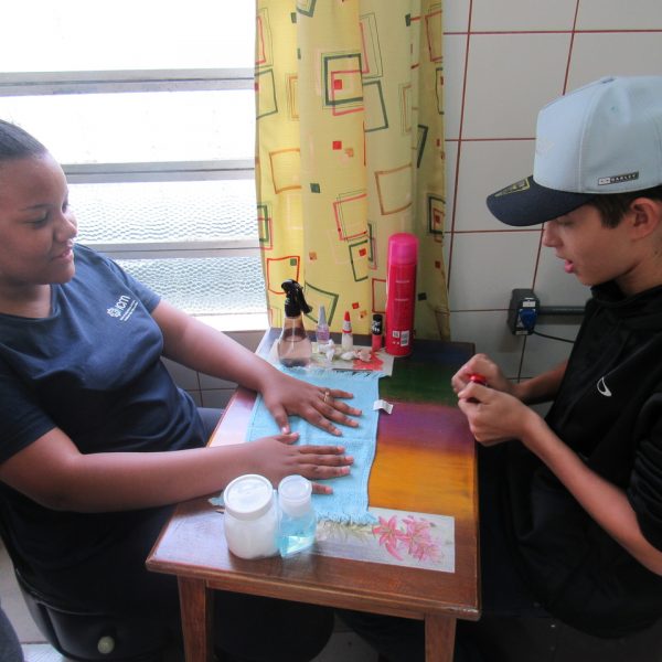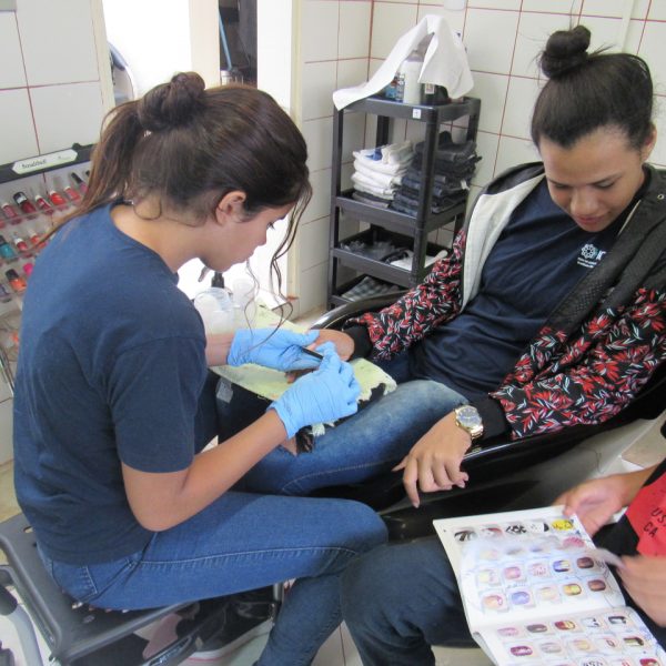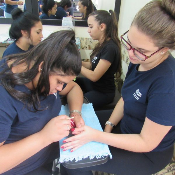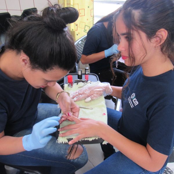 Na modalidade de Embelezamento os jovens seguem treinando as técnicas de unhas nos colegas.