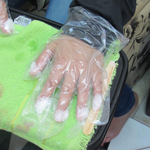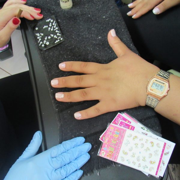 A educadora Ângela ensinou o passo a passo, agora todos já estão tirando as cutículas, esmaltando as unhas e também colocam algumas películas decorativas.