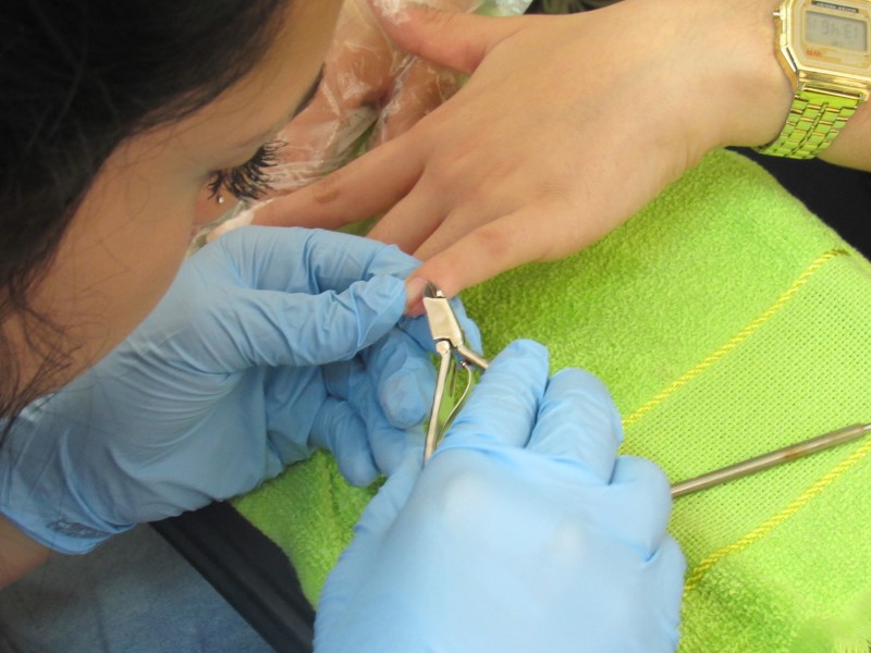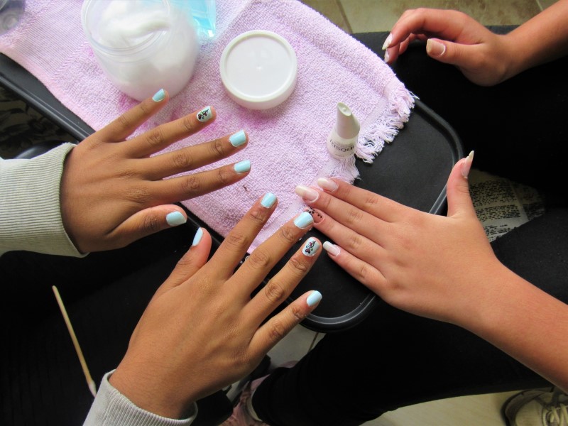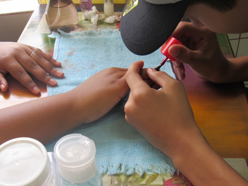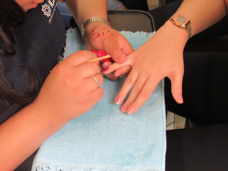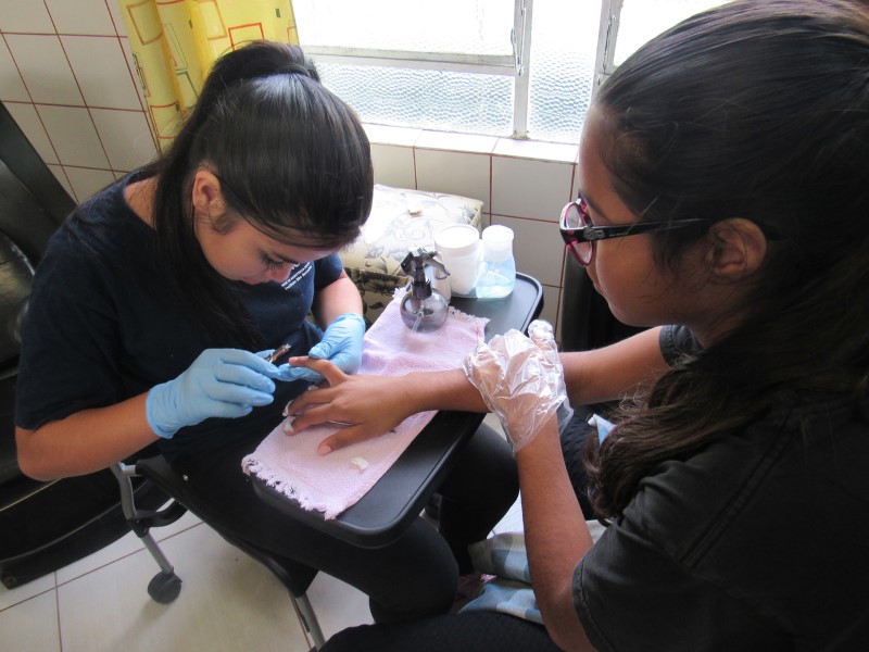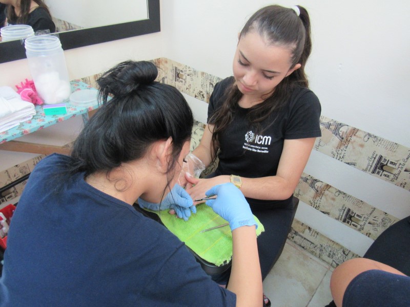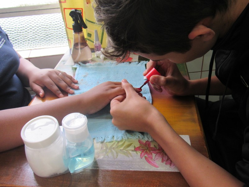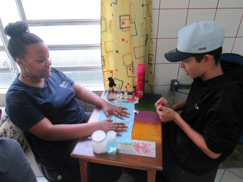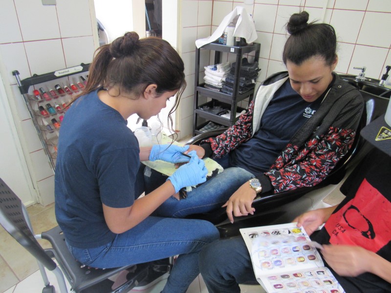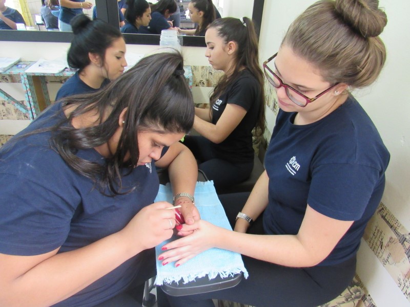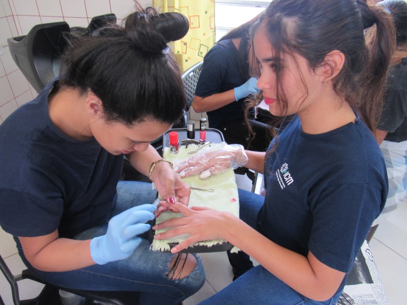 Na modalidade de Embelezamento os jovens seguem treinando as técnicas de unhas nos colegas.