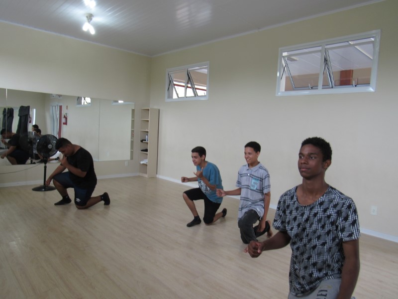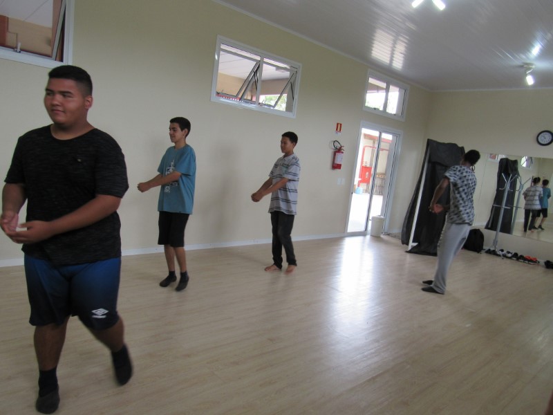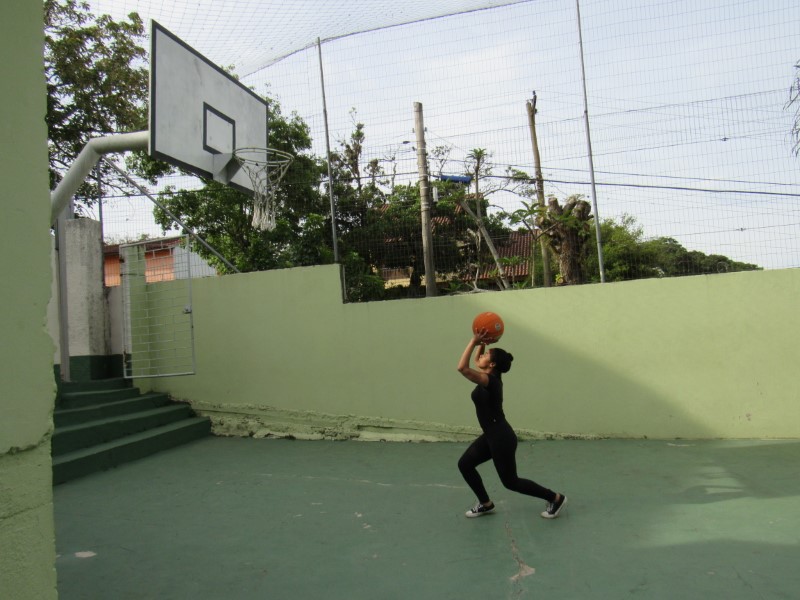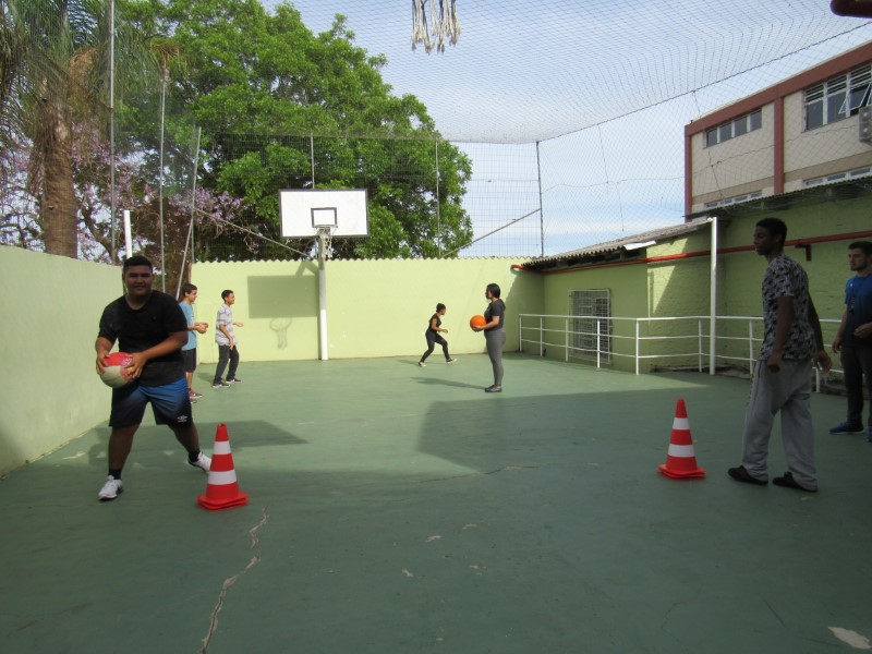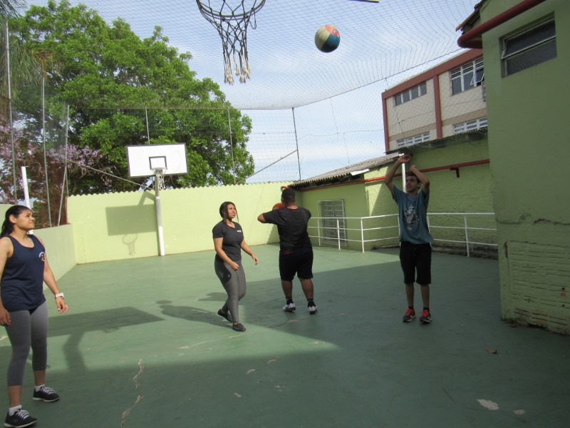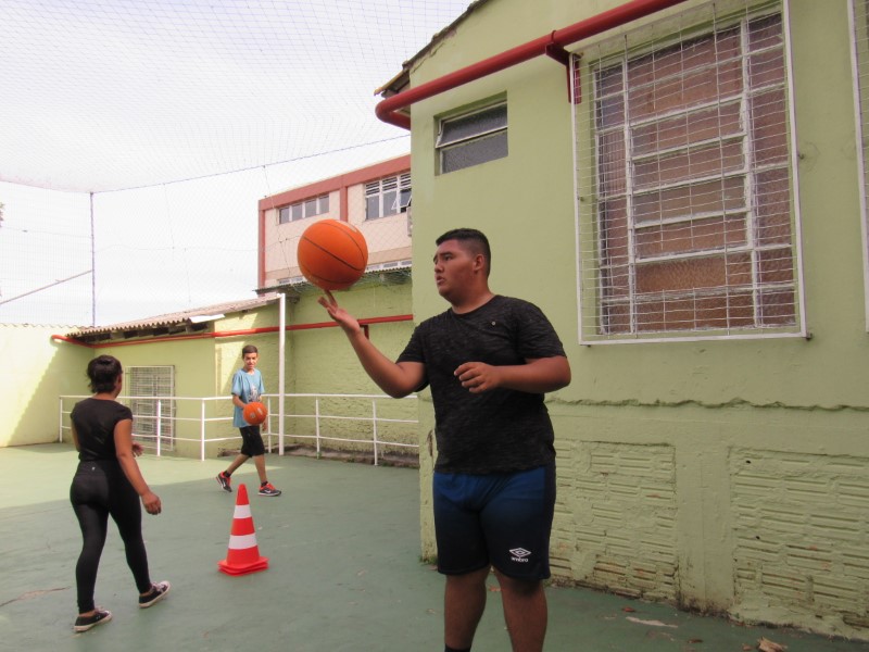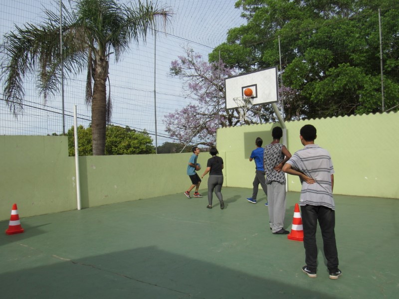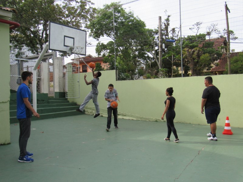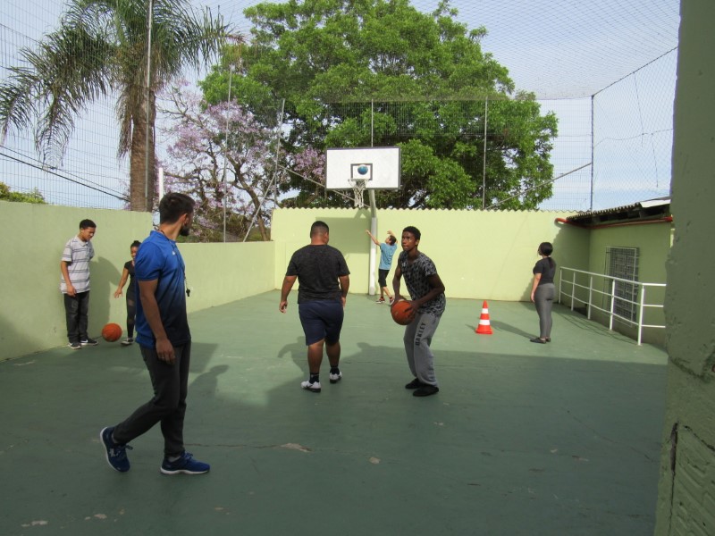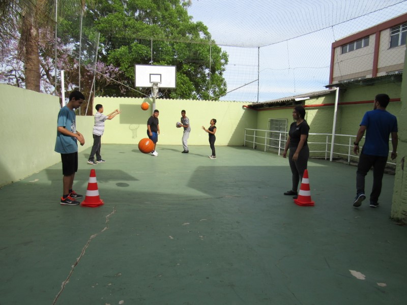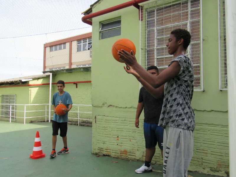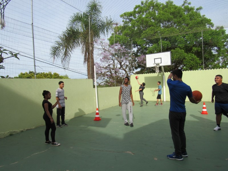 Grupo de jovens praticando o basquete e seus fundamentos na Oficina de Esportes.