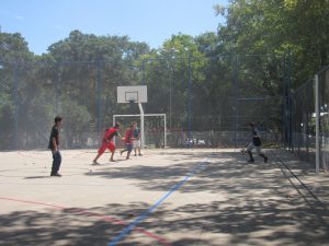 No momento de esportes foi dia de jogar futebol com os colegas, o grupo foi para a quadra de esportes da praça em frente a instituição e aproveitaram!