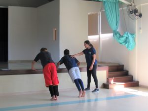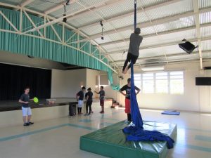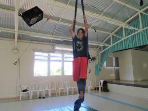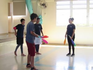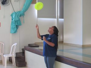 Durante a oficina de circo os jovens que já sabiam fazer as atividades ajudaram quem nunca tinha feito, com o auxilio e supervisão das educadoras, eles aprenderam as técnicas de arte circense e e malabares.
