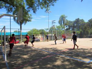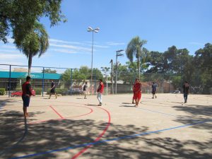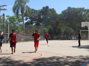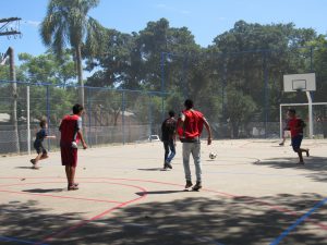 No momento de esportes foi dia de jogar futebol com os colegas, o grupo foi para a quadra de esportes da praça em frente a instituição e aproveitaram!