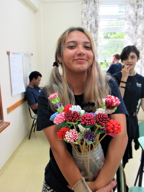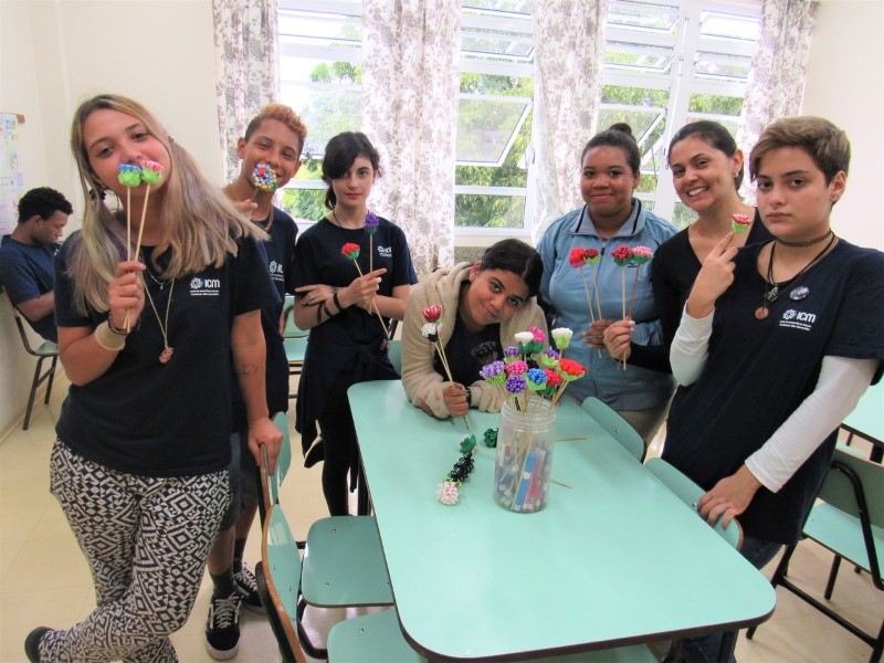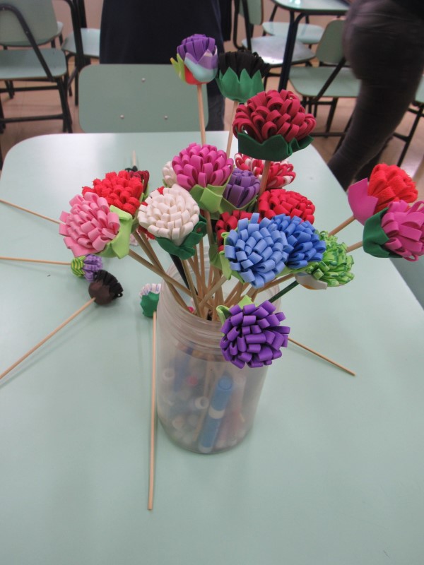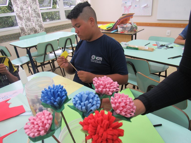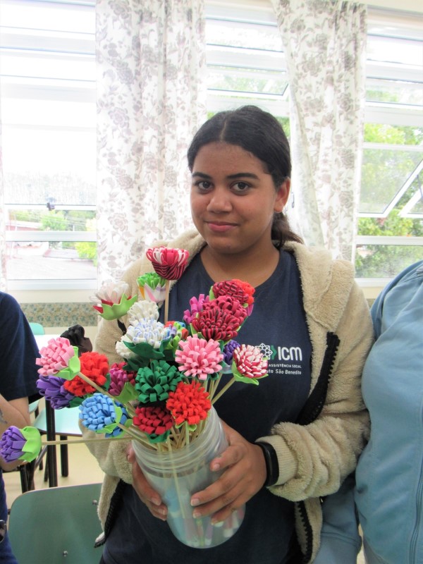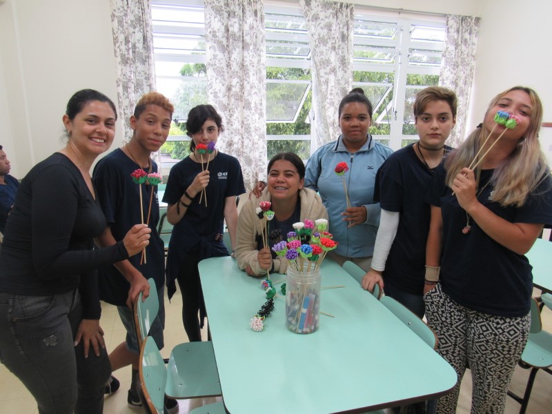 Os jovens fizeram muitas flores de diferentes cores, cada uma de sua preferência e personalizado do seu jeito. Eles levaram para casa para que pudessem presentear alguém especial.