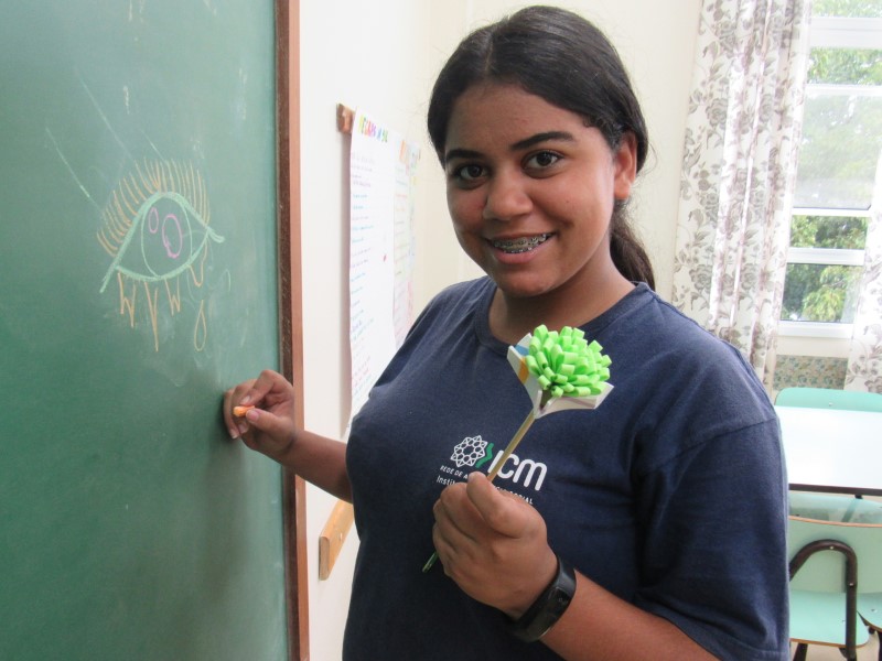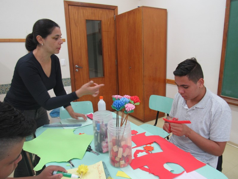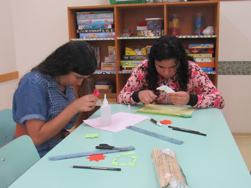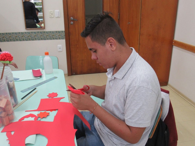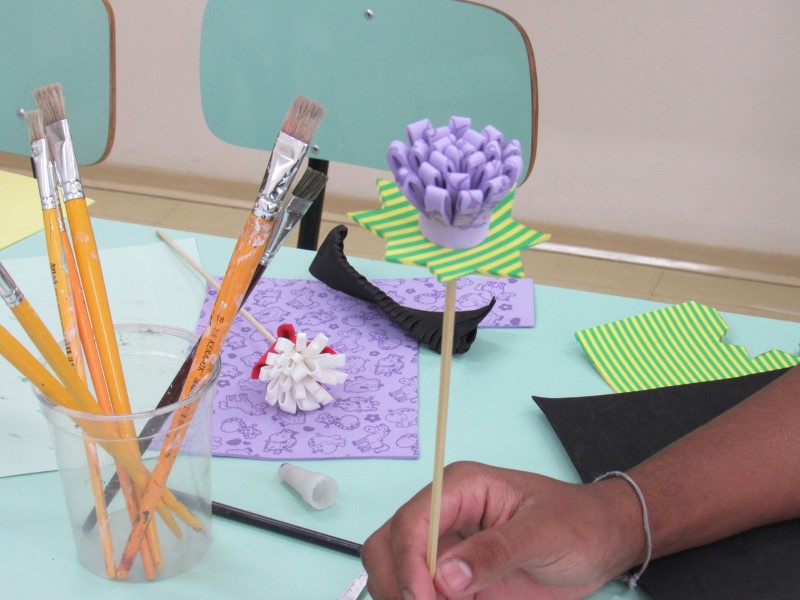 Neste dia os jovens da oficina de customização aprenderam com a educadora Catiani, a construir flores de EVA. Utilizaram além do EVA, palito de churrasco e cola-quente.