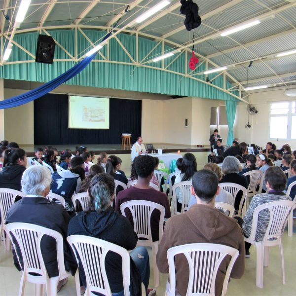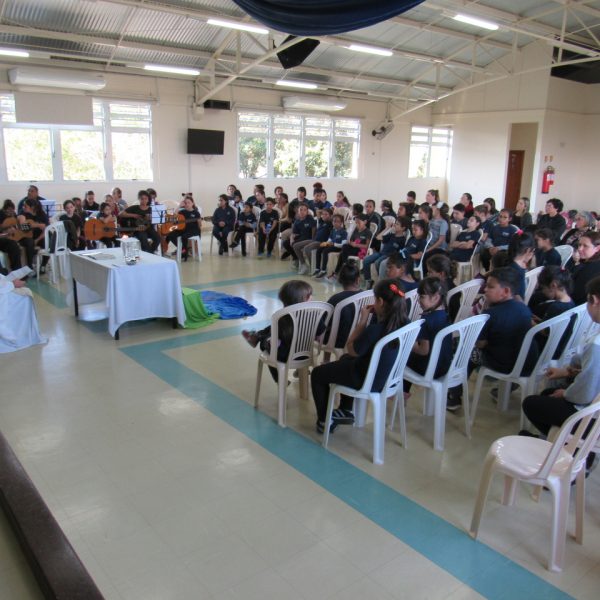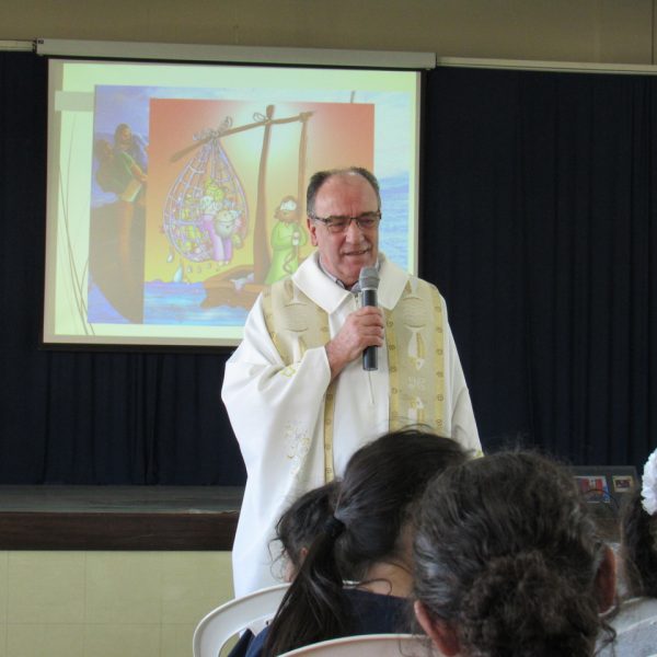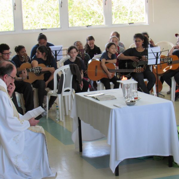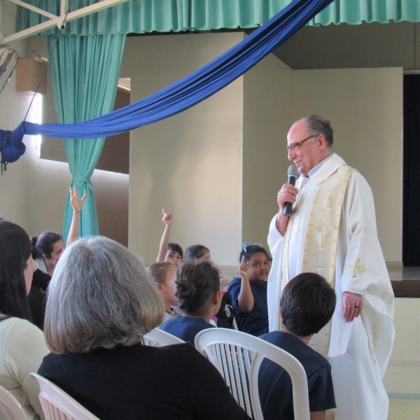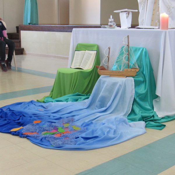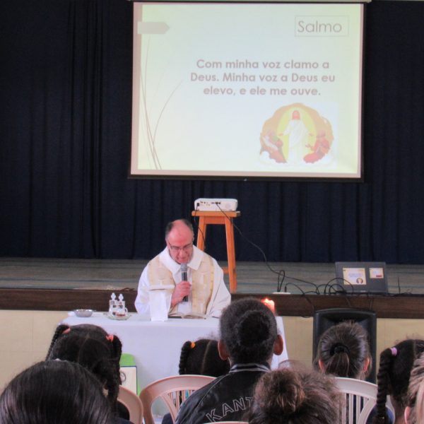 Nossa missa foi ministrada pelo Frei Xavier, que iniciou a missa falando sobre a passagem bíblica Lc 5,1-11, que conta sobre a pesca milagrosa onde Lucas conta como Pedro foi chamado por Jesus e como ele entrou na caminhada. Primeiro, escutou as palavras de Jesus ao povo. Em seguida, presenciou a pesca milagrosa. Foi só depois dessa dupla experiência surpreendente que veio o chamado de Jesus. Pedro atendeu, largou tudo e se tornou “pescador de gente”.