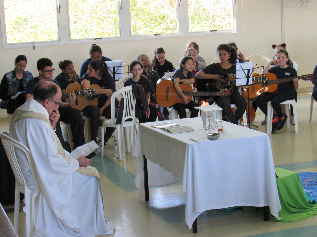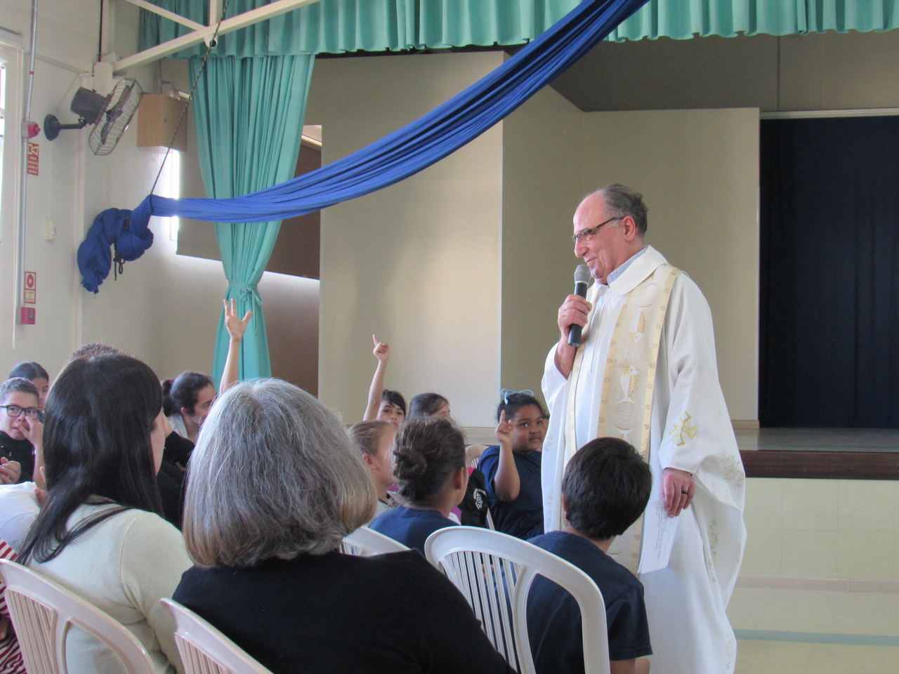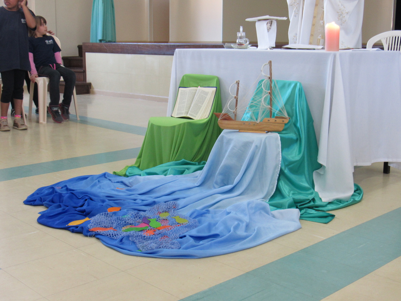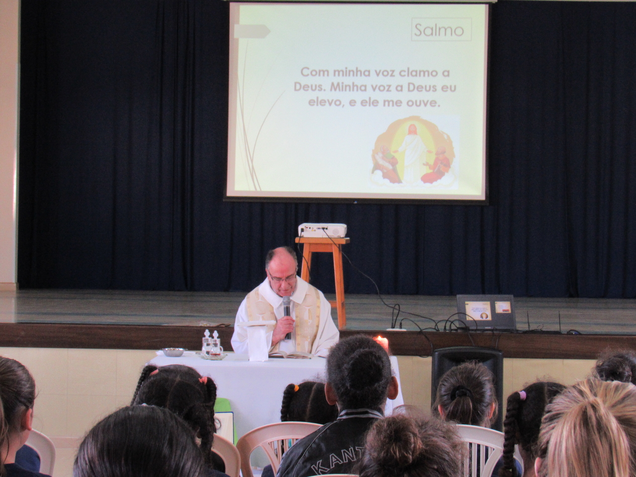 Nossa missa foi ministrada pelo Frei Xavier, que iniciou a missa falando sobre a passagem bíblica Lc 5,1-11, que conta sobre a pesca milagrosa onde Lucas conta como Pedro foi chamado por Jesus e como ele entrou na caminhada. Primeiro, escutou as palavras de Jesus ao povo. Em seguida, presenciou a pesca milagrosa. Foi só depois dessa dupla experiência surpreendente que veio o chamado de Jesus. Pedro atendeu, largou tudo e se tornou “pescador de gente”.