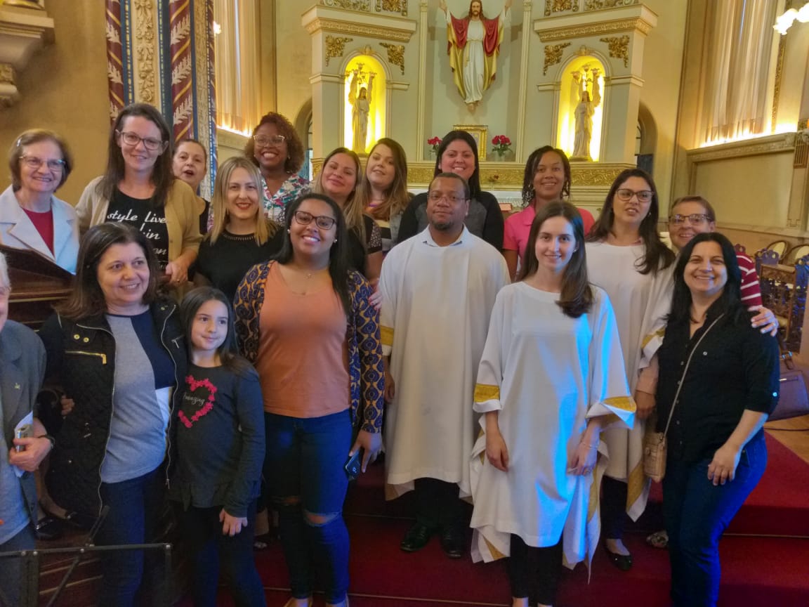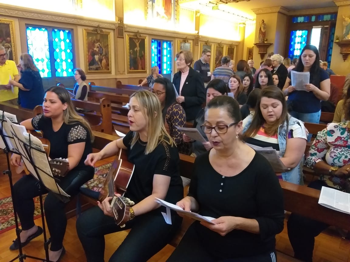 Momento celebrativo que contou com o grupo cantando e fazendo as leituras durante a missa.