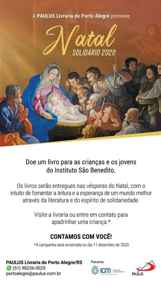 PORTO ALEGRE/RS – O Instituto São Benedito é a entidade beneficiada com a campanha “Natal Solidário 2020”, da Paulus Livraria. A ação quer mobilizar as pessoas para a doação de livros para as crianças e jovens atendidas pela instituição.