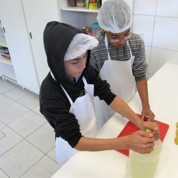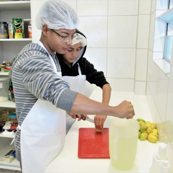 Dividindo as tarefas todos conseguem participar na hora da produção, com o auxílio da educadora Kátia os educandos fizeram os salgadinhos perfeitamente estavam de dar água na boca, e como acompanhamento os jovens fizeram uma limonada.