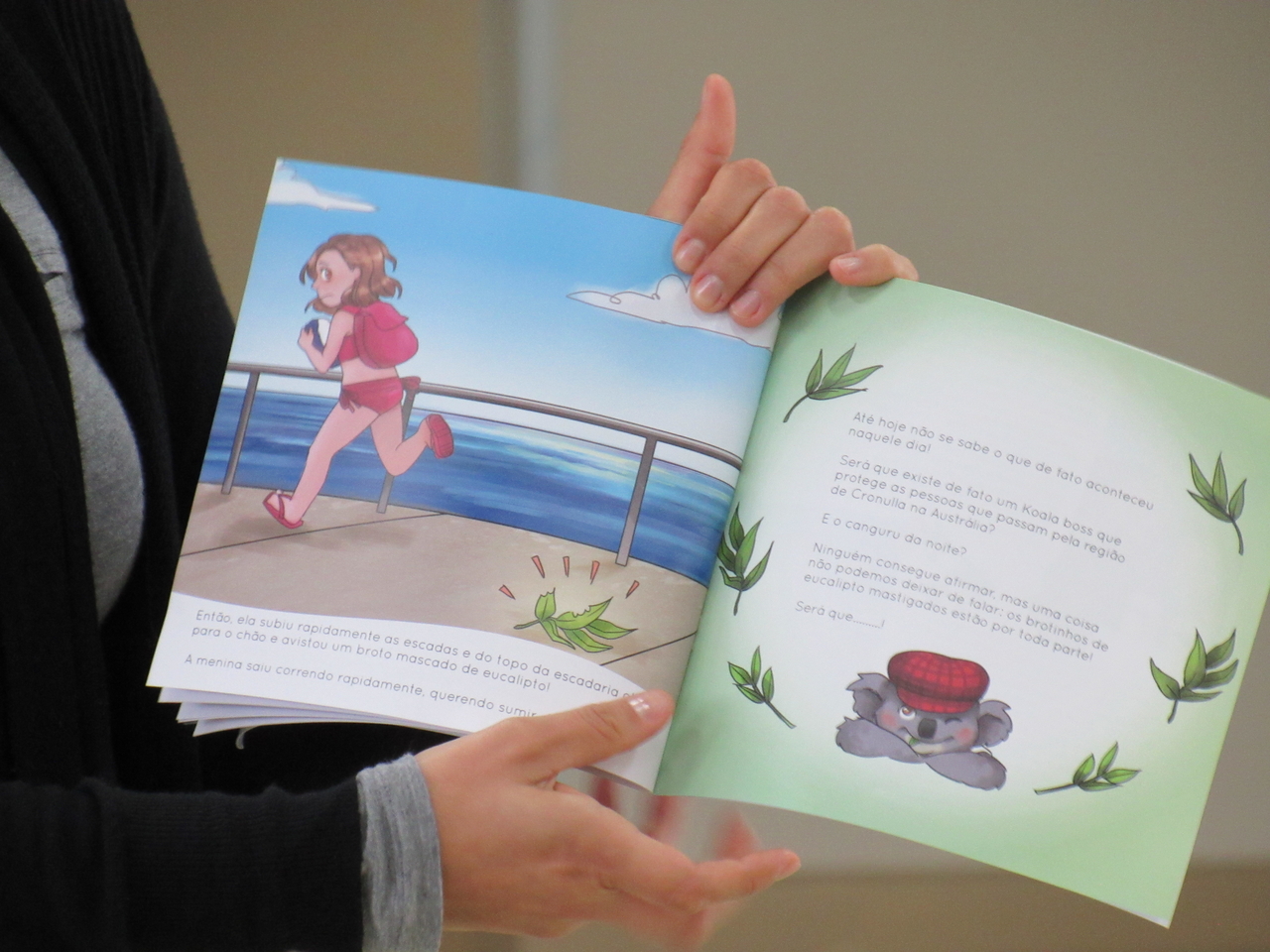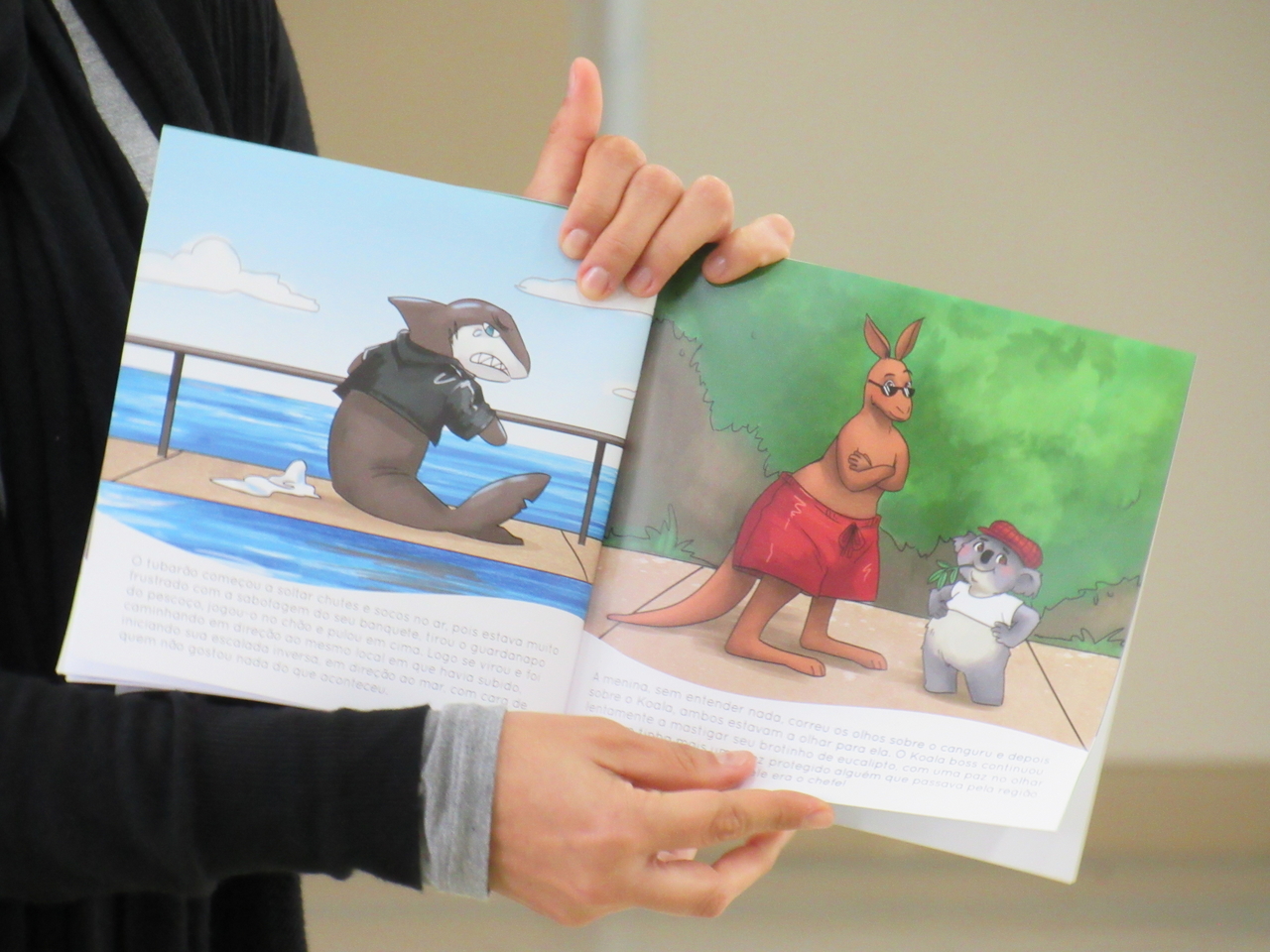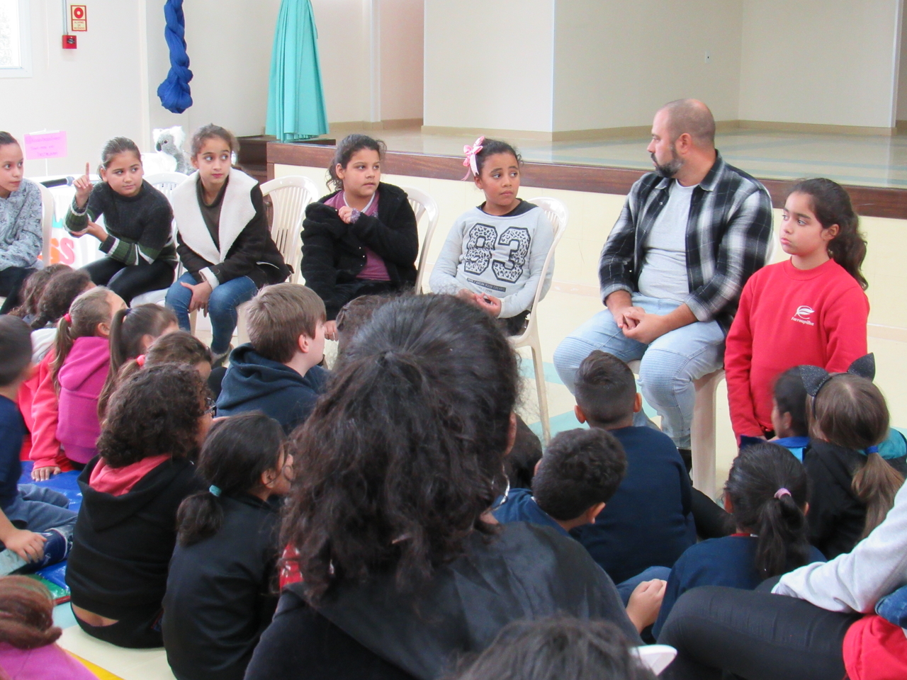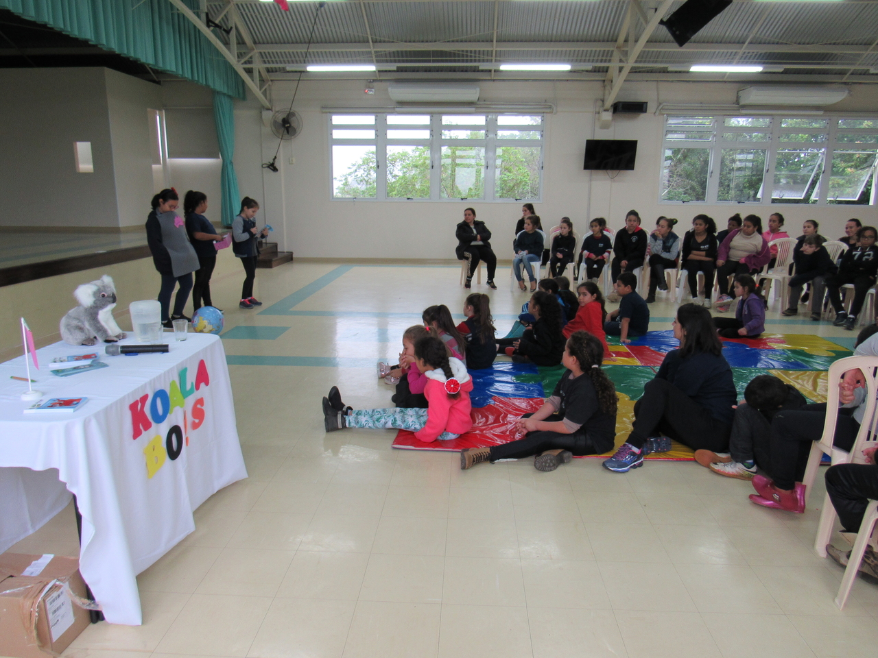 As crianças fizeram a leitura da história Koala Boss para o grande grupo, depois tivemos a roda de conversas para esclarecer algumas dúvidas sobre o livro e sobre a Austrália, que é onde o escritor mora atualmente e onde ele criou a obra.