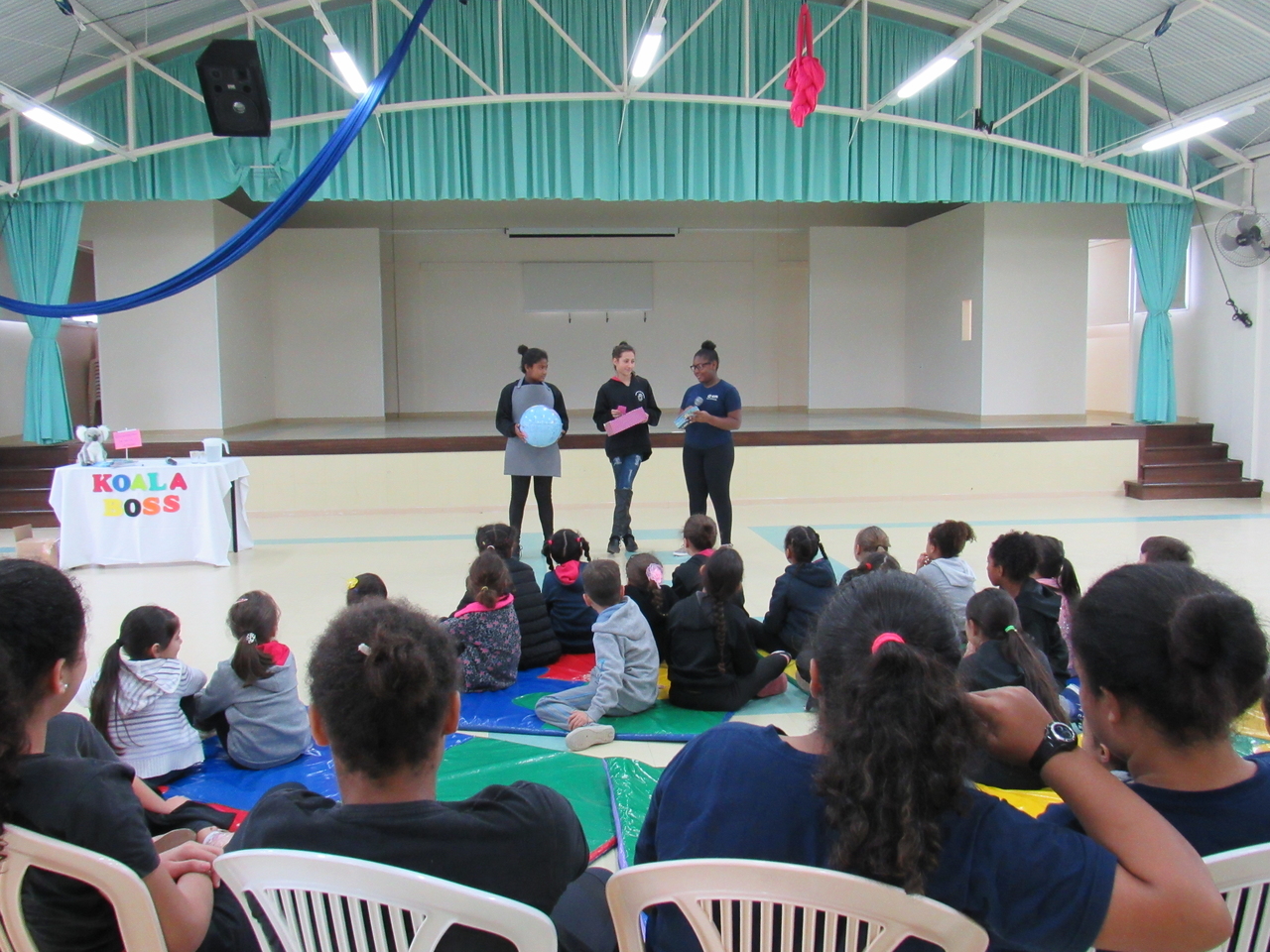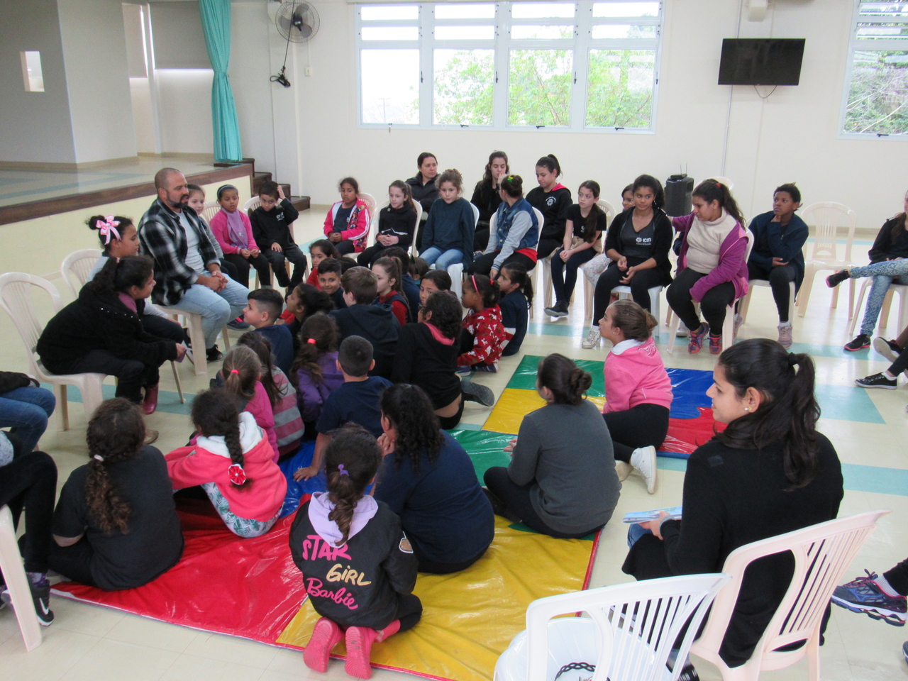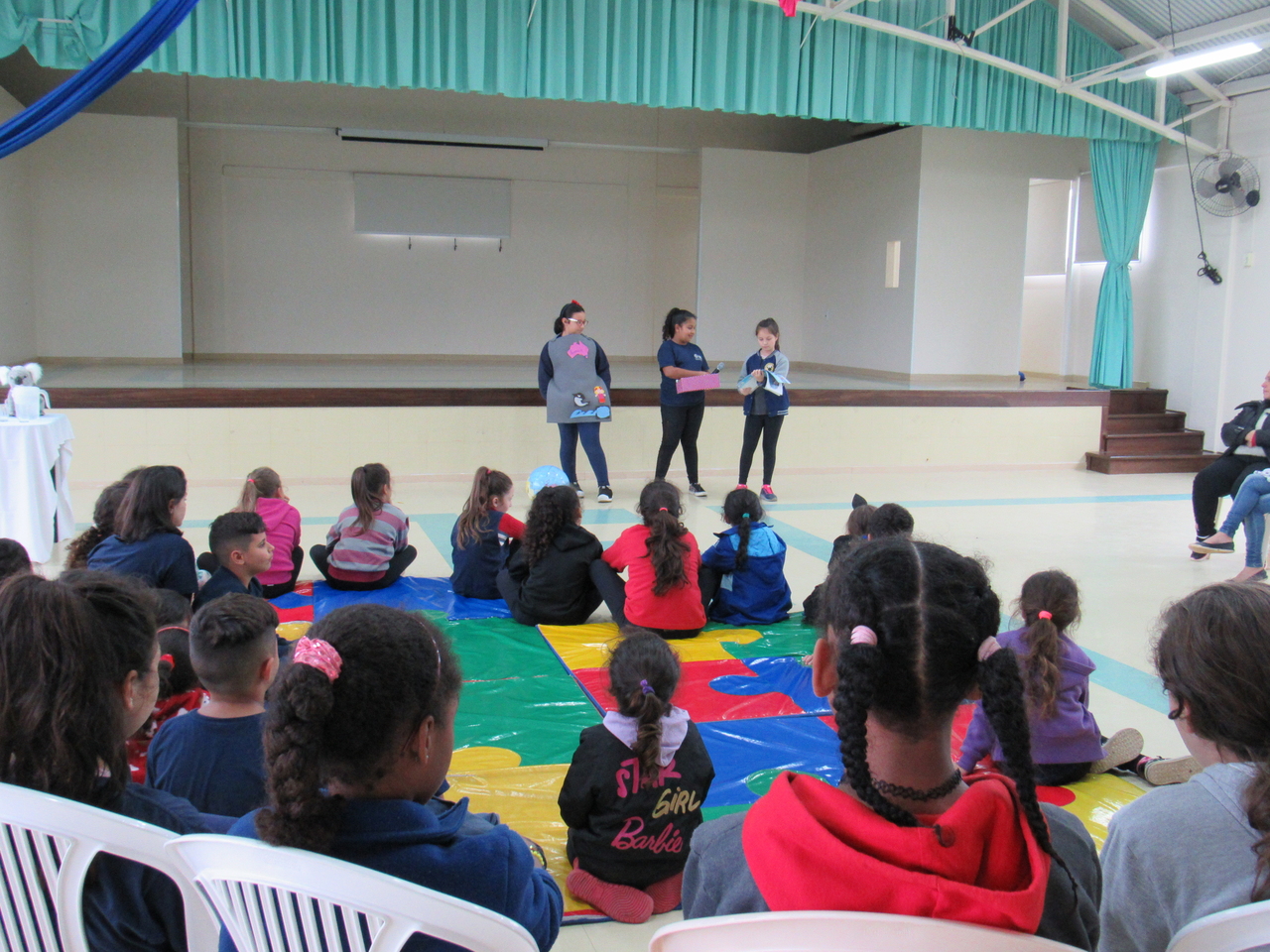 As crianças fizeram a leitura da história Koala Boss para o grande grupo, depois tivemos a roda de conversas para esclarecer algumas dúvidas sobre o livro e sobre a Austrália, que é onde o escritor mora atualmente e onde ele criou a obra.