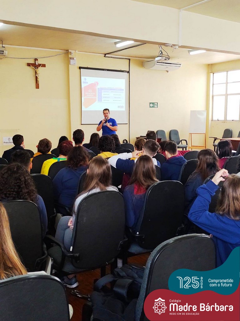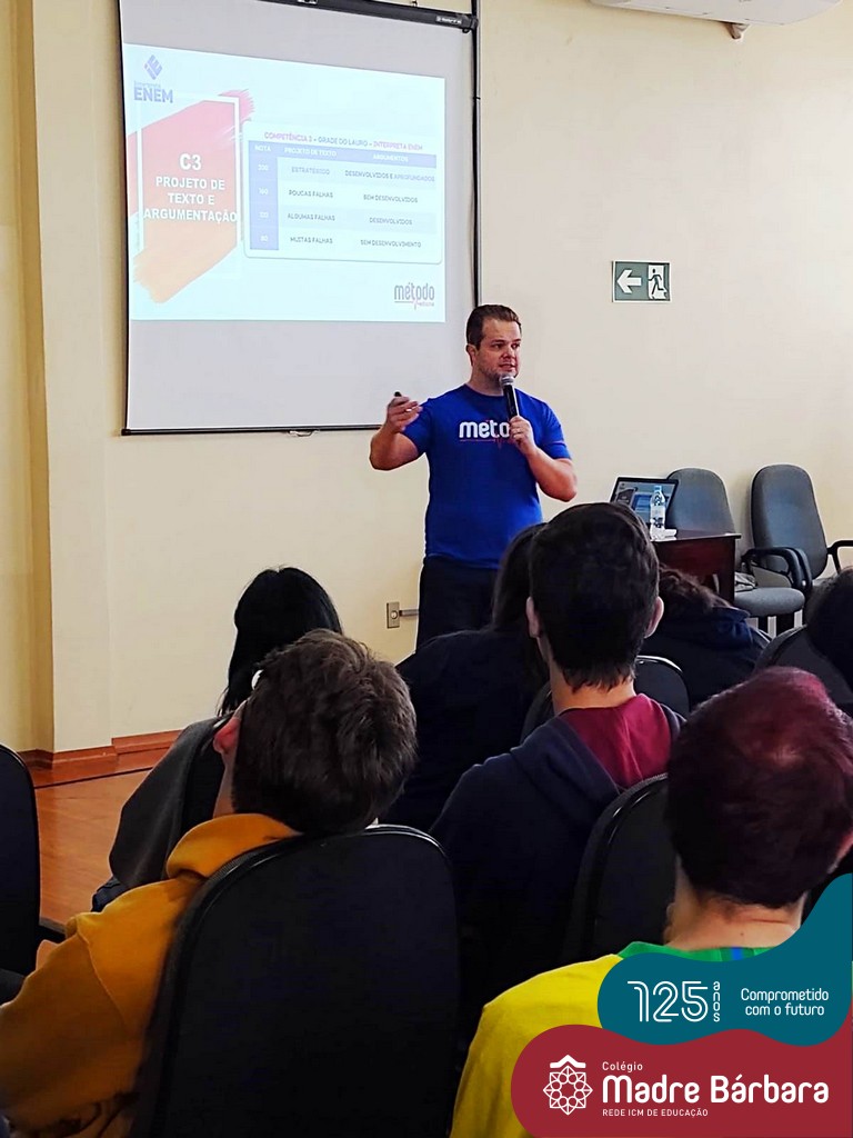 Na terça-feira (06.09), as turmas de 2ºs e 3ºs anos do Ensino Médio participaram da palestra sobre Redação ENEM, com o professor Lauro Lima, do Método Medicina. Um momento de dicas e estratégias de como elaborar uma redação e alcançar nota 1000.