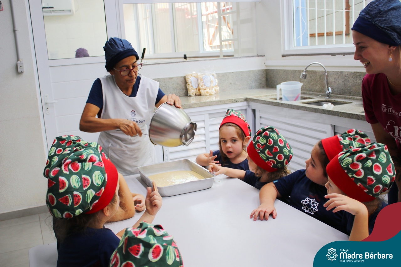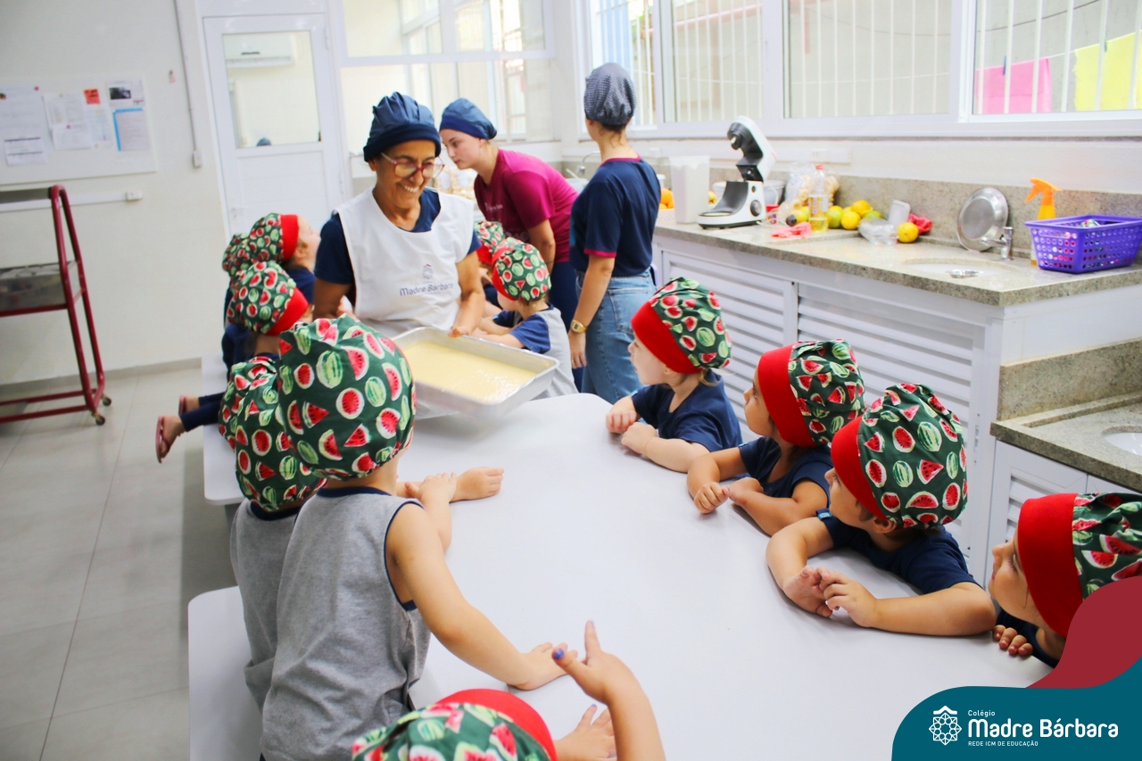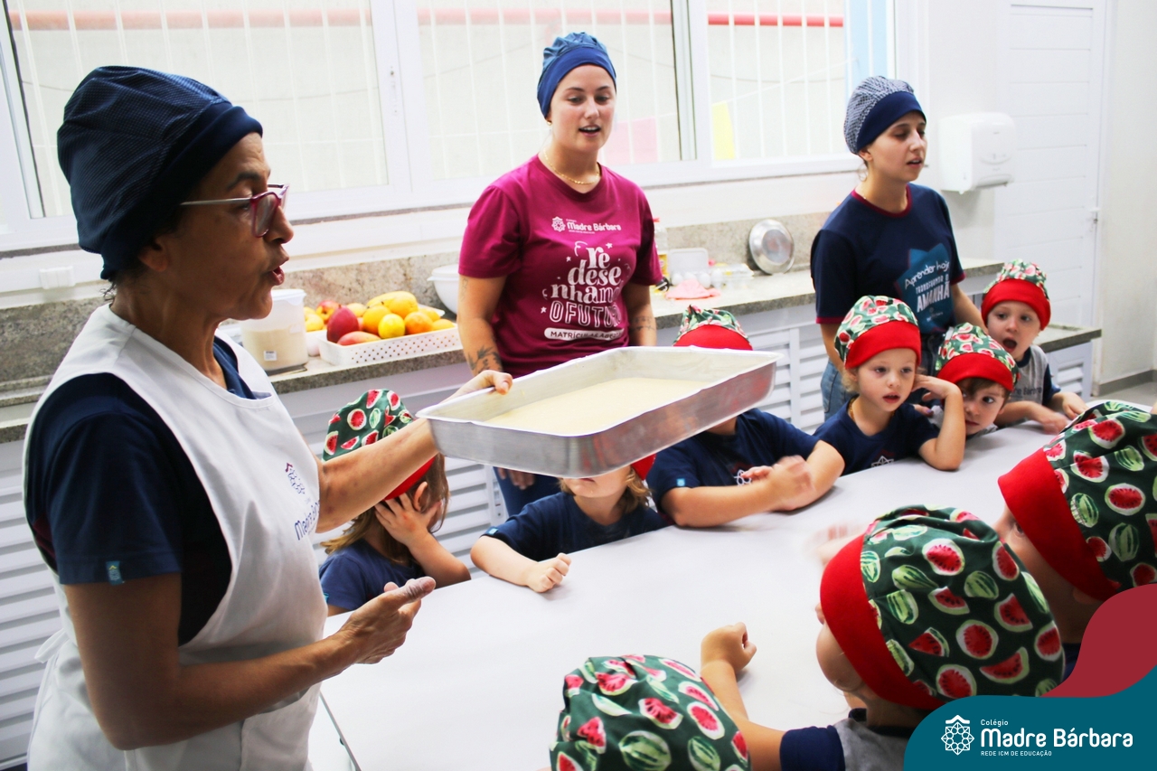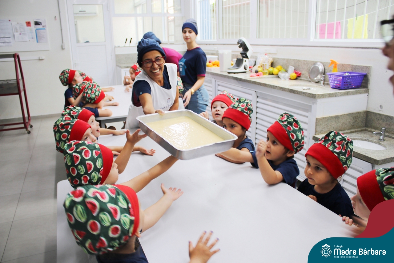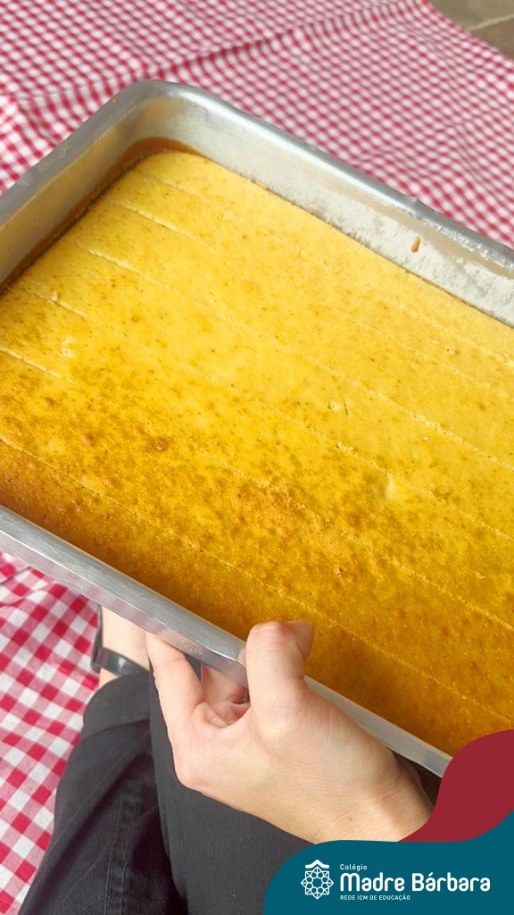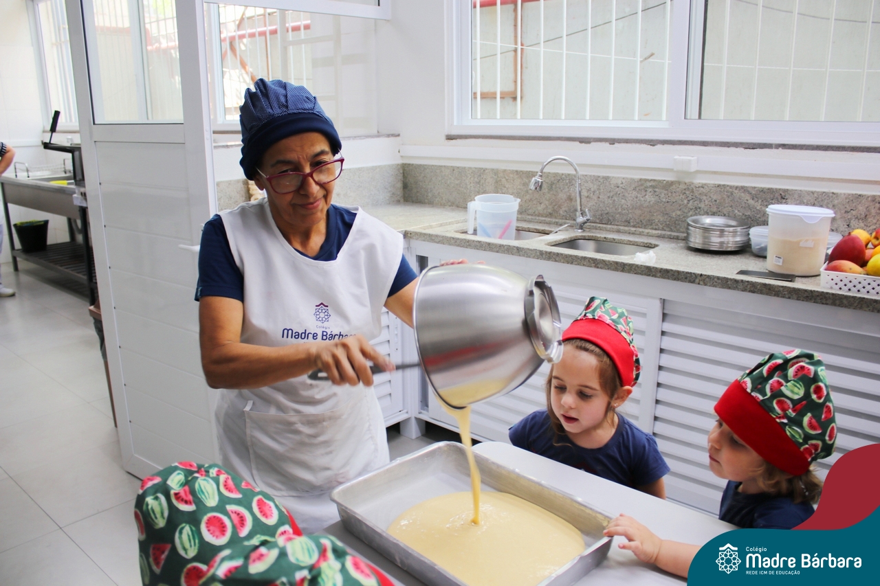 Depois do chazinho de laranja, as crianças fizeram, provaram e aprovaram o bolo de laranja, acompanhados das professoras e da tia Maria, cozinheira do refeitório da Educação Infantil! Além de terem uma alimentação saudável, as crianças puderam acompanhar as etapas que envolve todo o processo do bolo. Ainda estiveram no Laboratório de Ciências, observando o mofo que criou nas cascas de laranja que haviam guardado. Curiosidade, oralidade, imaginação e protagonismo não faltaram durante essa vivência!