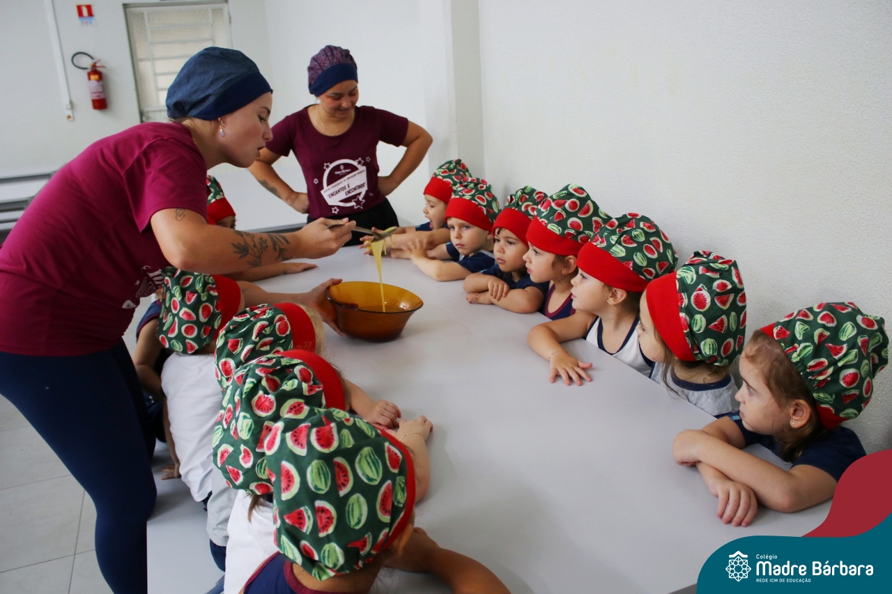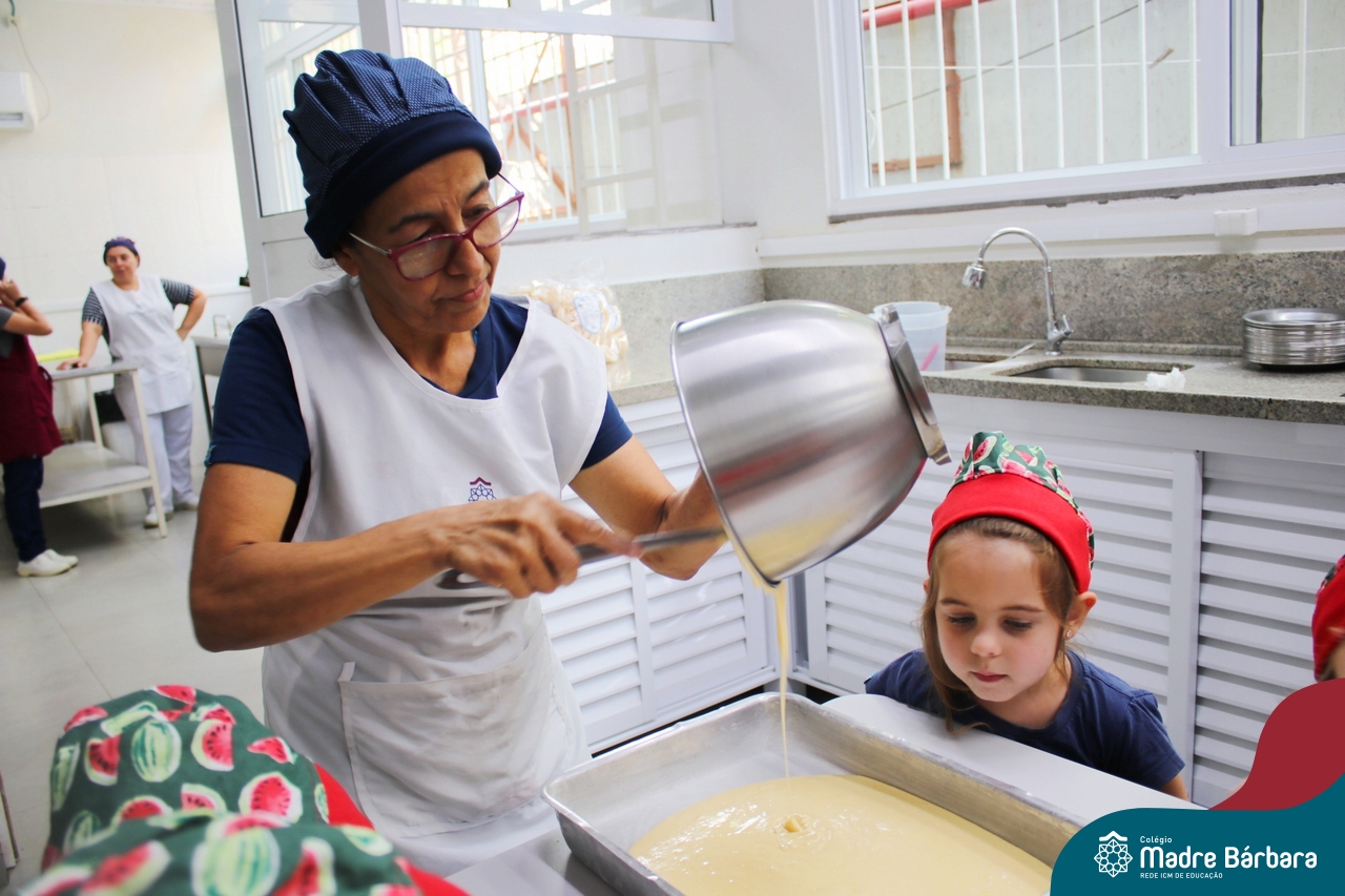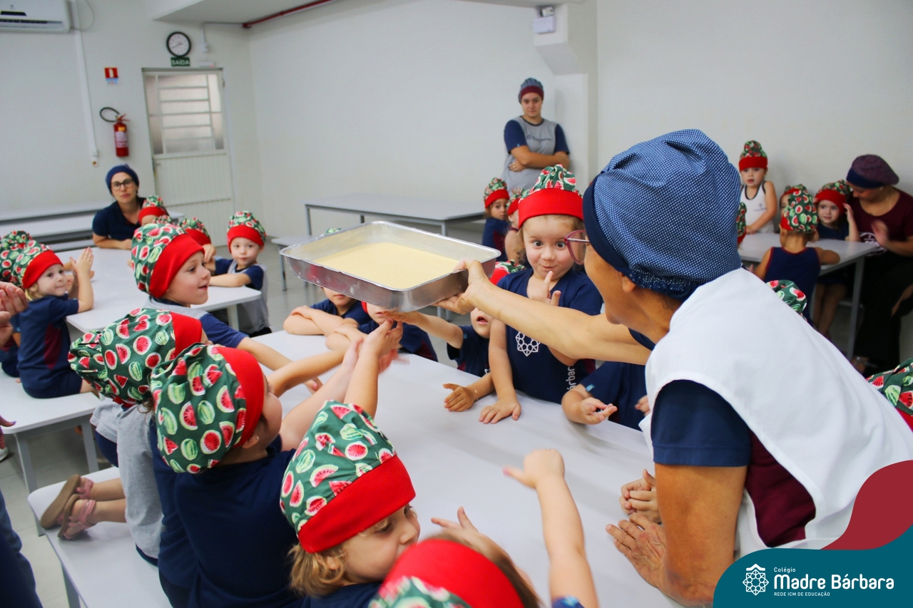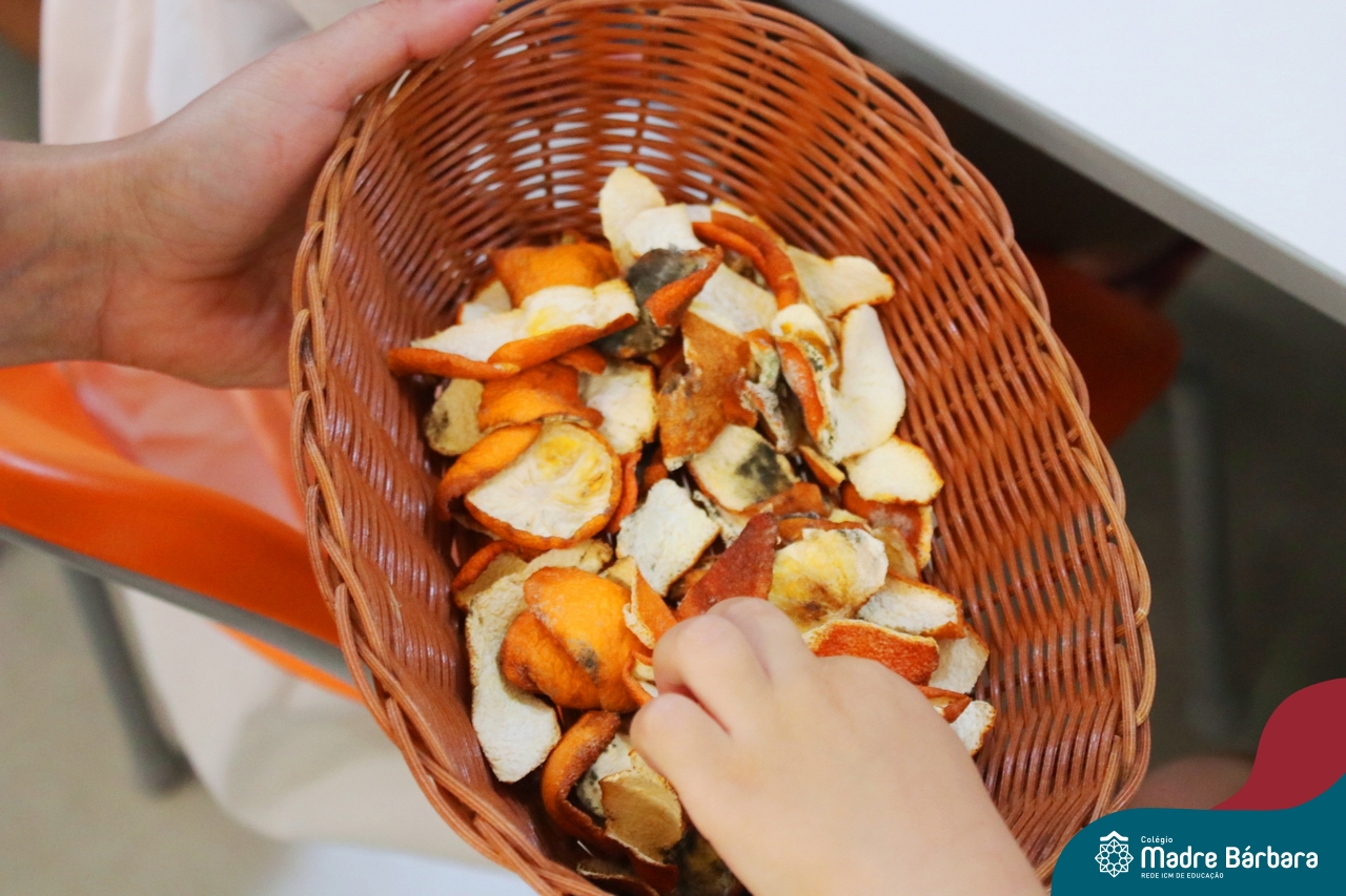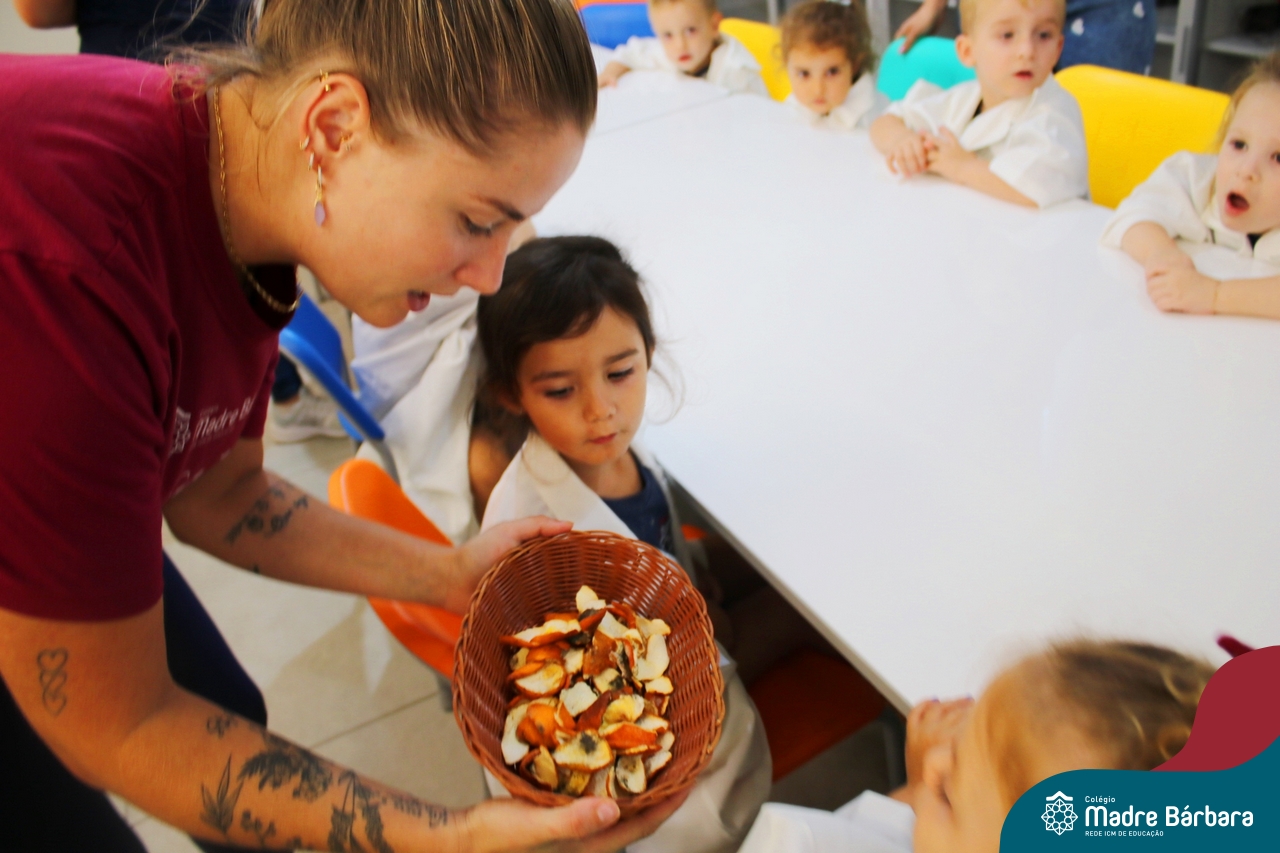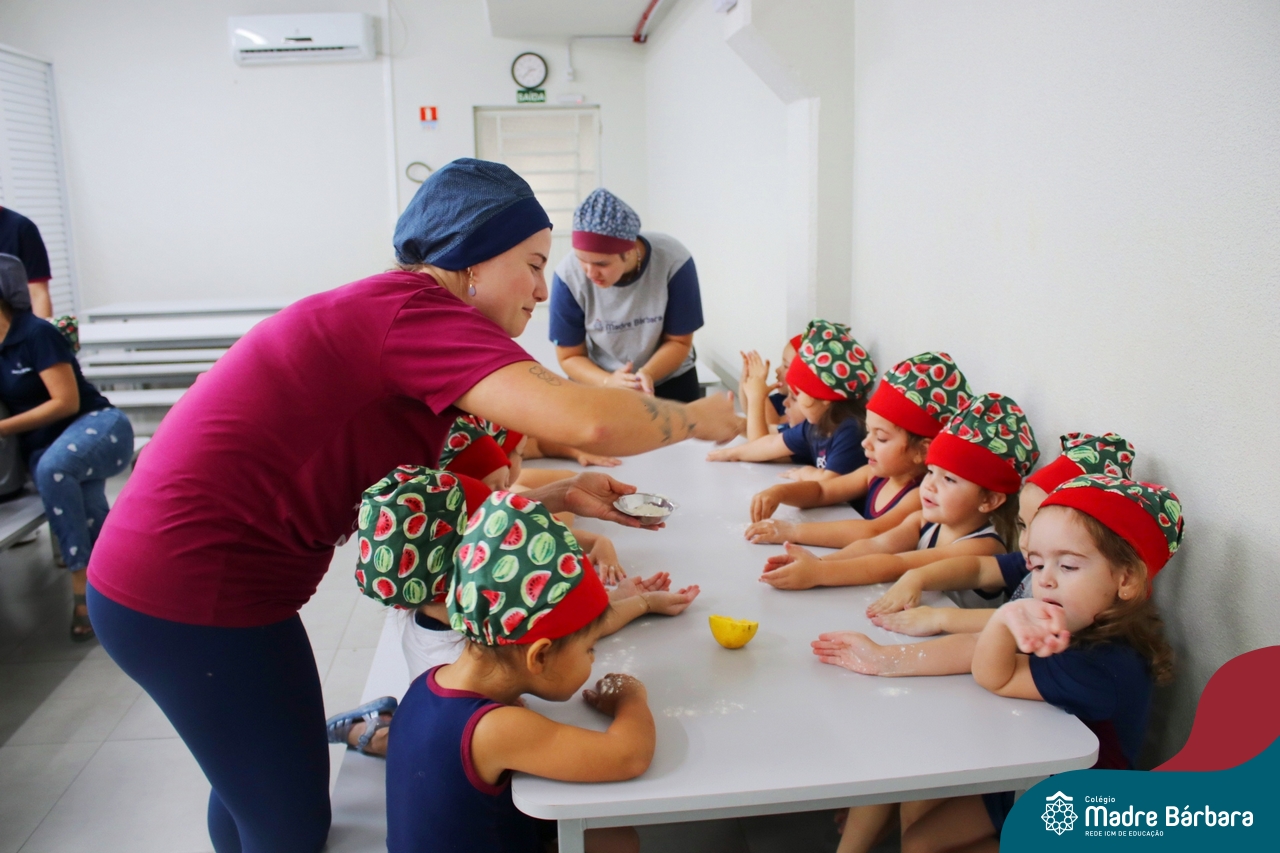 Depois do chazinho de laranja, as crianças fizeram, provaram e aprovaram o bolo de laranja, acompanhados das professoras e da tia Maria, cozinheira do refeitório da Educação Infantil! Além de terem uma alimentação saudável, as crianças puderam acompanhar as etapas que envolve todo o processo do bolo. Ainda estiveram no Laboratório de Ciências, observando o mofo que criou nas cascas de laranja que haviam guardado. Curiosidade, oralidade, imaginação e protagonismo não faltaram durante essa vivência!
