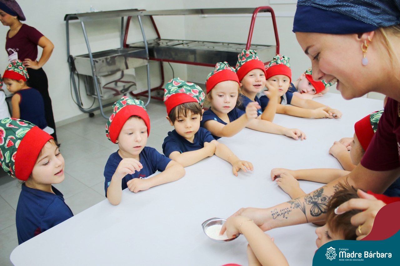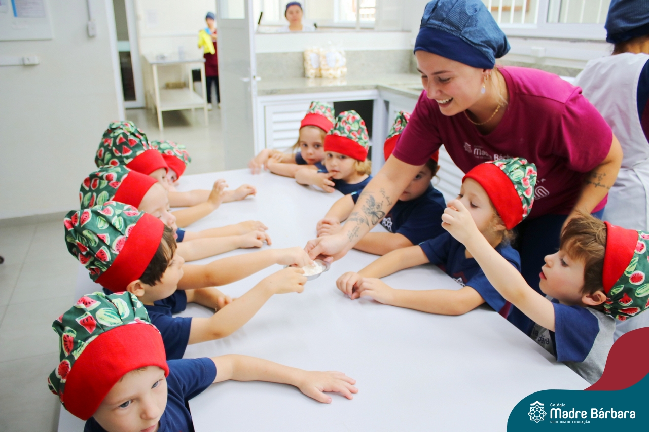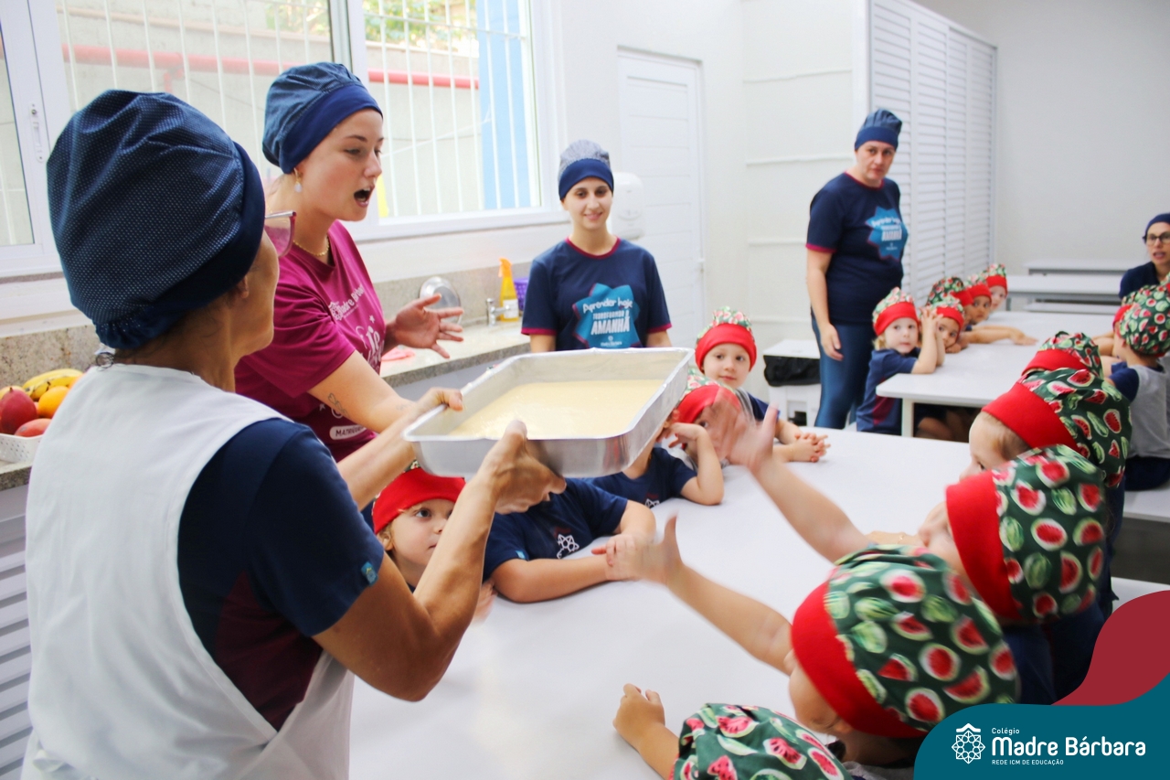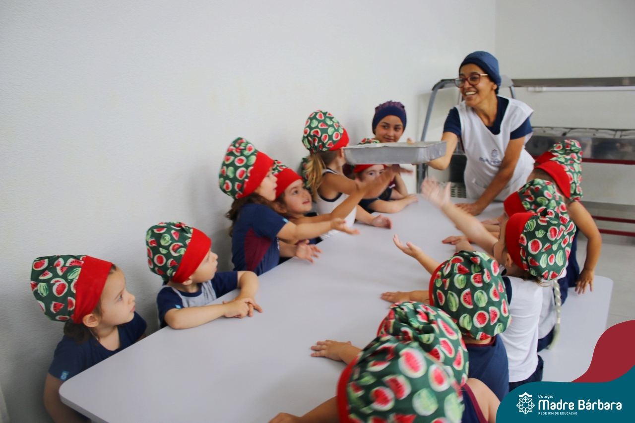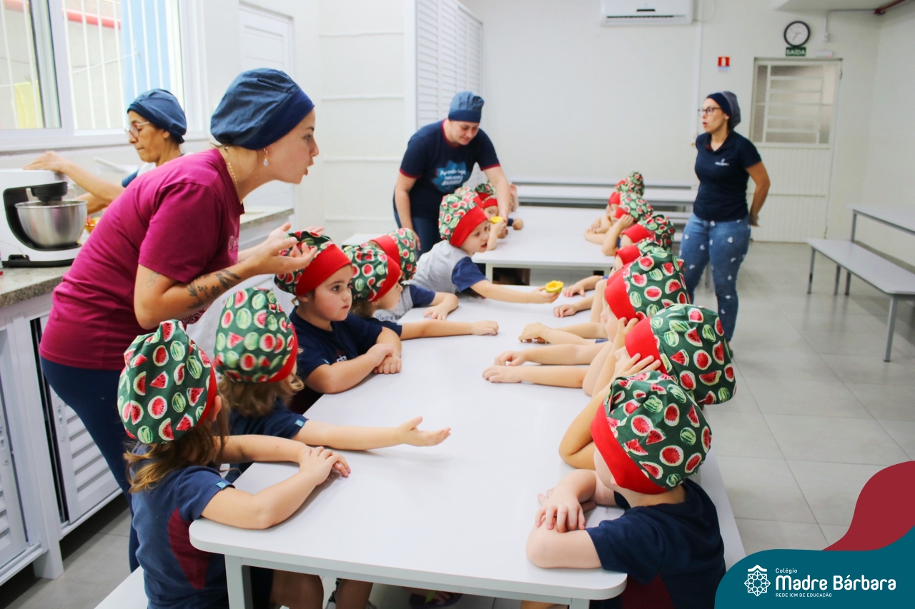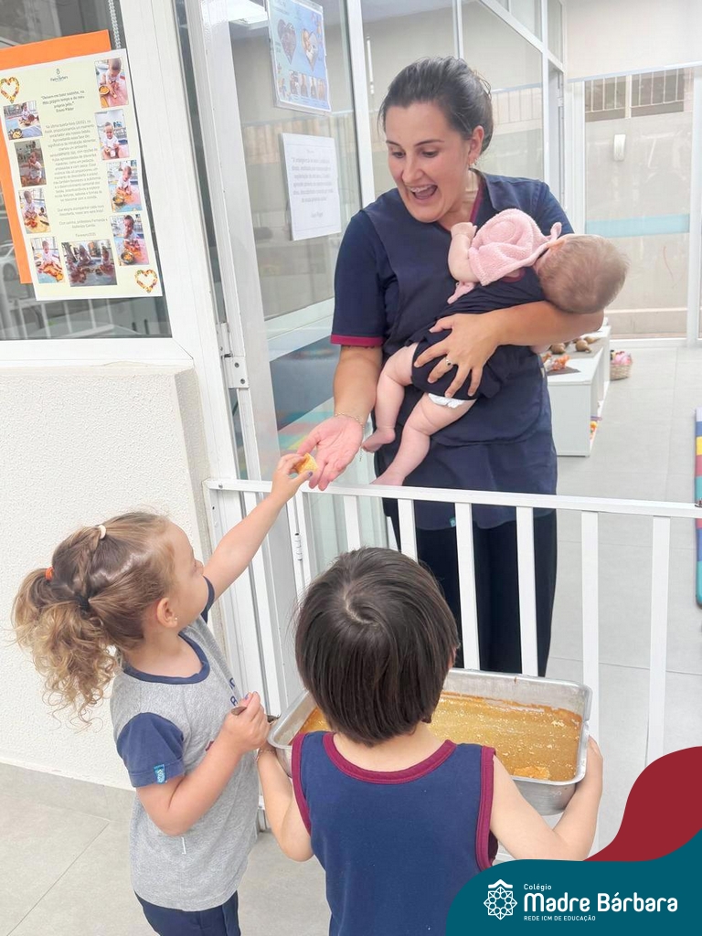 Depois do chazinho de laranja, as crianças fizeram, provaram e aprovaram o bolo de laranja, acompanhados das professoras e da tia Maria, cozinheira do refeitório da Educação Infantil! Além de terem uma alimentação saudável, as crianças puderam acompanhar as etapas que envolve todo o processo do bolo. Ainda estiveram no Laboratório de Ciências, observando o mofo que criou nas cascas de laranja que haviam guardado. Curiosidade, oralidade, imaginação e protagonismo não faltaram durante essa vivência!