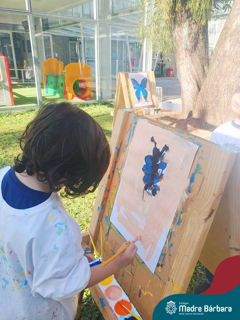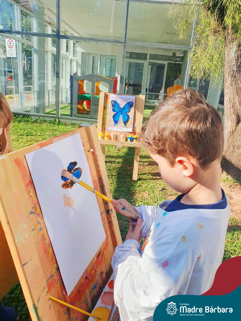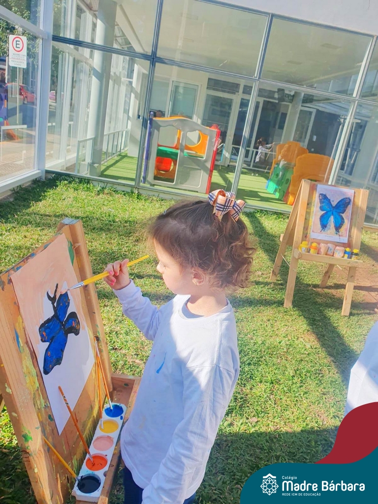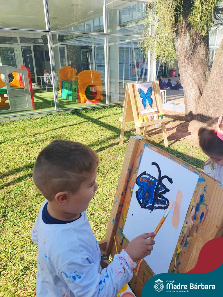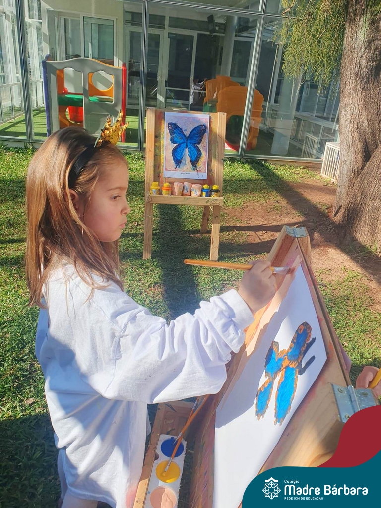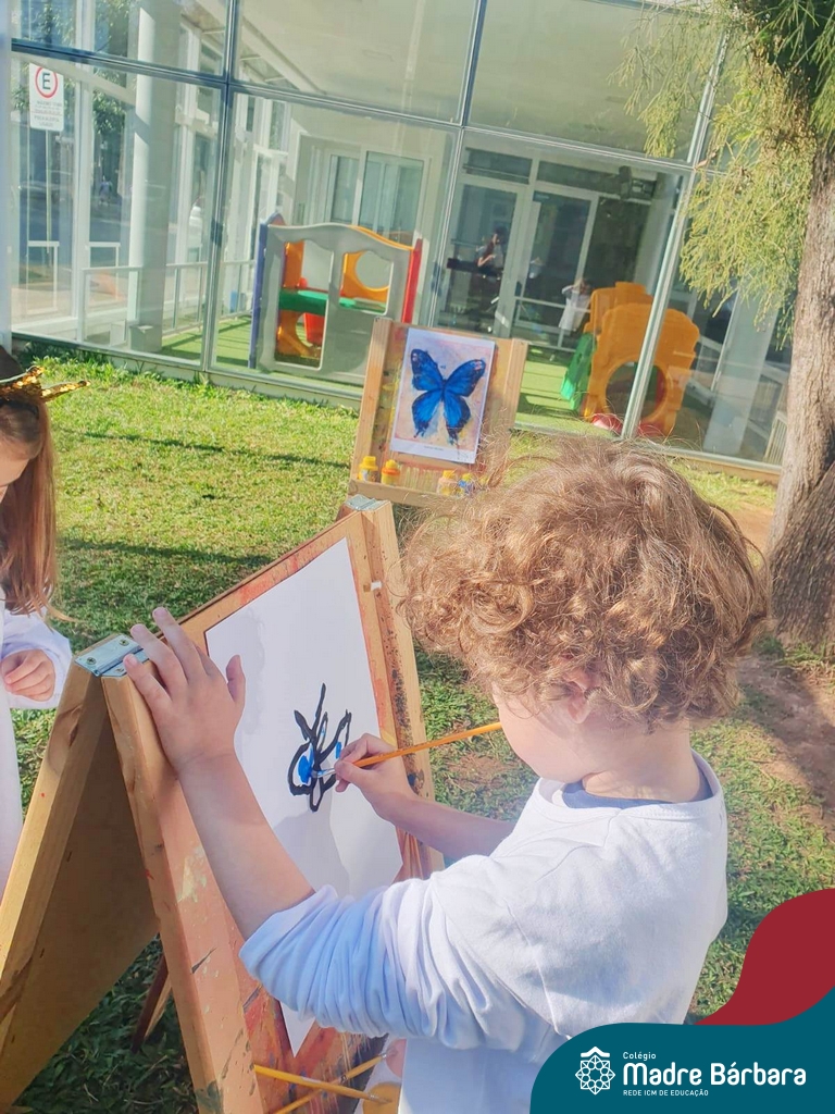Numa linda tarde ensolarada, com olhares atentos e muita concentração, as crianças do Nível 4C, juntamente com a professora Fabiani e monitoras Cristiane e Gabriele, realizaram a releitura da obra de Glenda Brown. Observando as formas, traços e cores desenharam uma linda borboleta azul. Essa situação de aprendizagem enriqueceu ainda mais o projeto da turma: “A magia da transformação: um voo pelo mundo encantado das borboletas.” Foi um momento muito significativo e especial!
