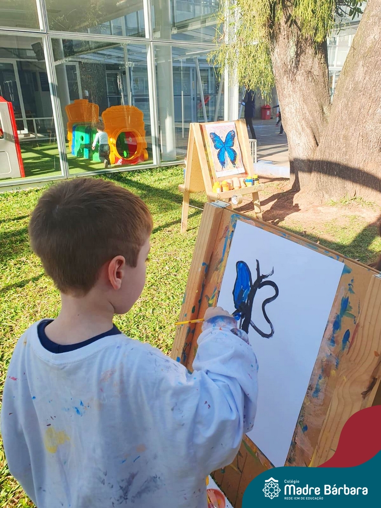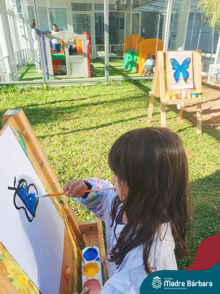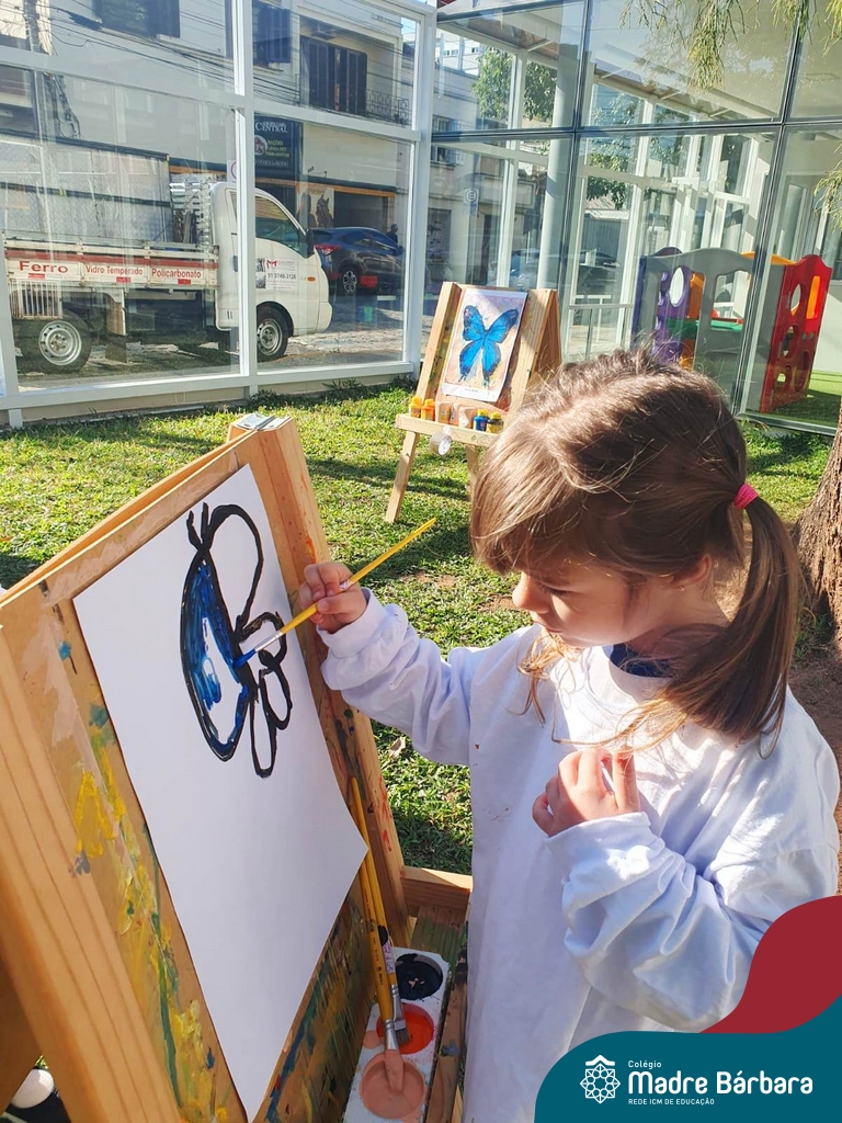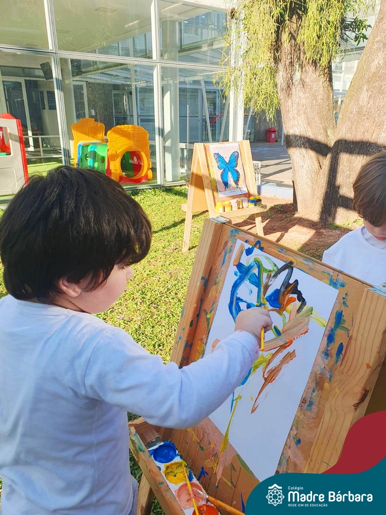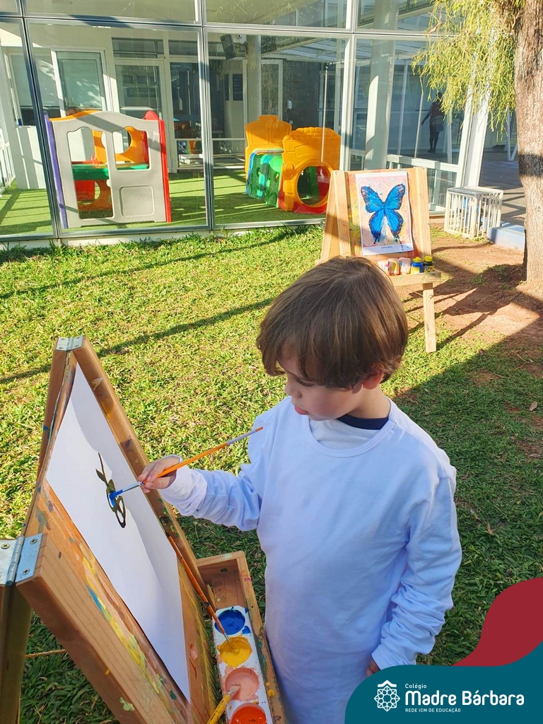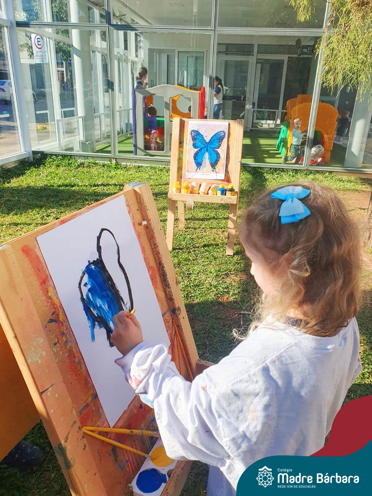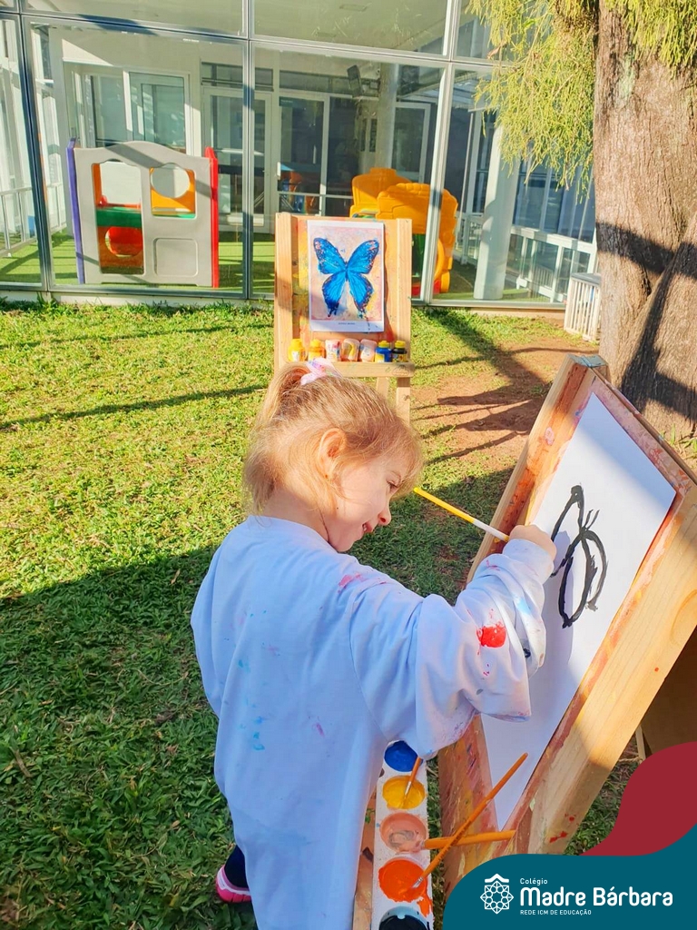 Numa linda tarde ensolarada, com olhares atentos e muita concentração, as crianças do Nível 4C, juntamente com a professora Fabiani e monitoras Cristiane e Gabriele, realizaram a releitura da obra de Glenda Brown. Observando as formas, traços e cores desenharam uma linda borboleta azul. Essa situação de aprendizagem enriqueceu ainda mais o projeto da turma: “A magia da transformação: um voo pelo mundo encantado das borboletas.” Foi um momento muito significativo e especial!
