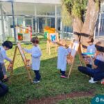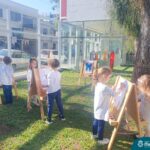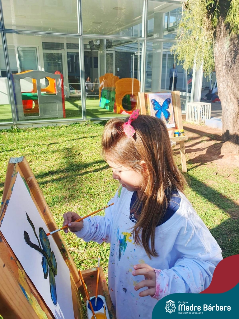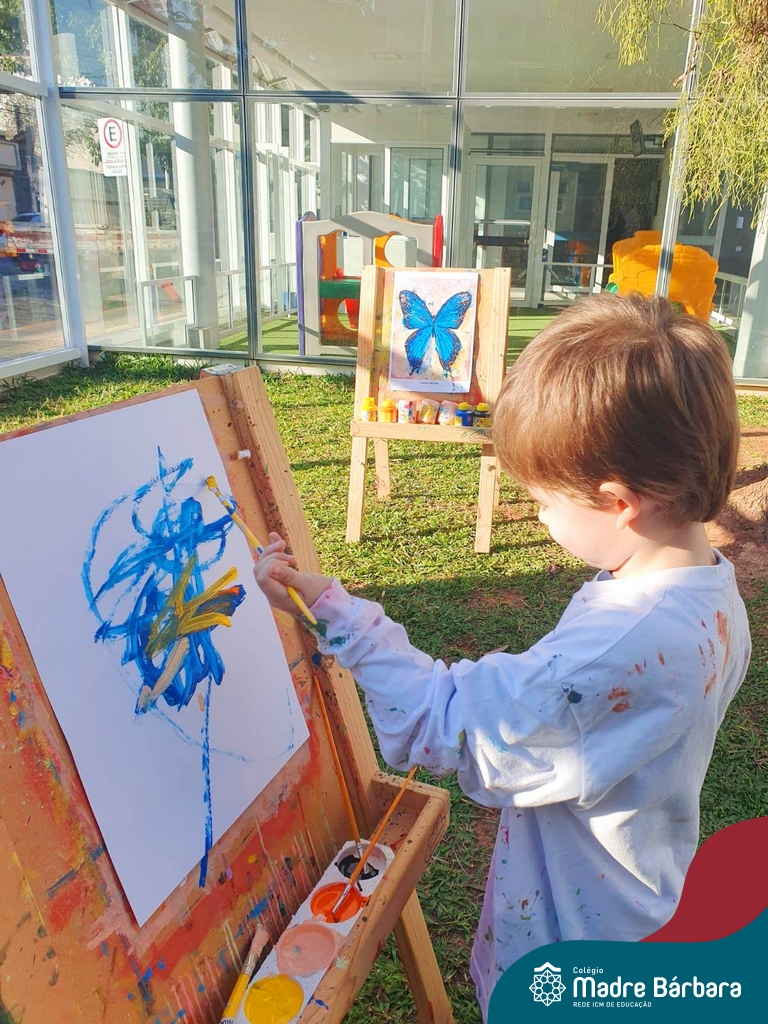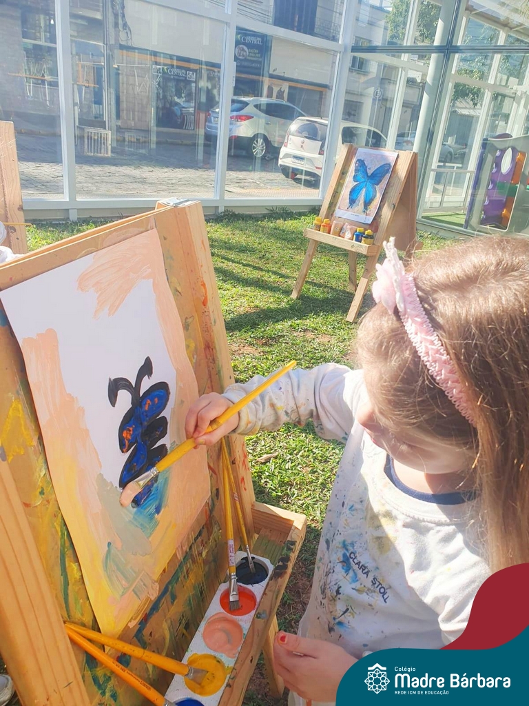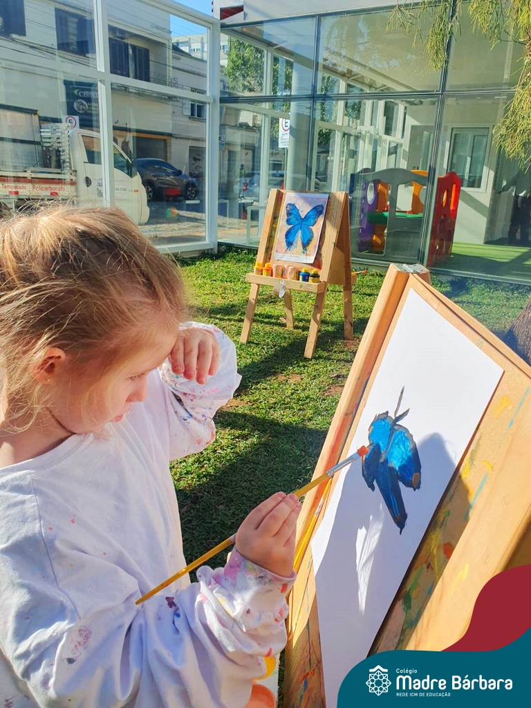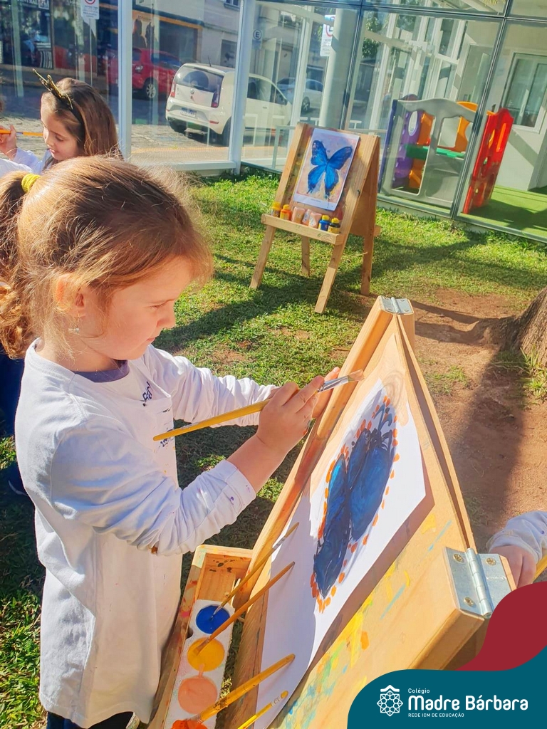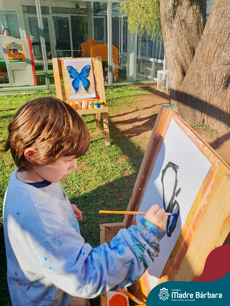 Numa linda tarde ensolarada, com olhares atentos e muita concentração, as crianças do Nível 4C, juntamente com a professora Fabiani e monitoras Cristiane e Gabriele, realizaram a releitura da obra de Glenda Brown. Observando as formas, traços e cores desenharam uma linda borboleta azul. Essa situação de aprendizagem enriqueceu ainda mais o projeto da turma: “A magia da transformação: um voo pelo mundo encantado das borboletas.” Foi um momento muito significativo e especial!
