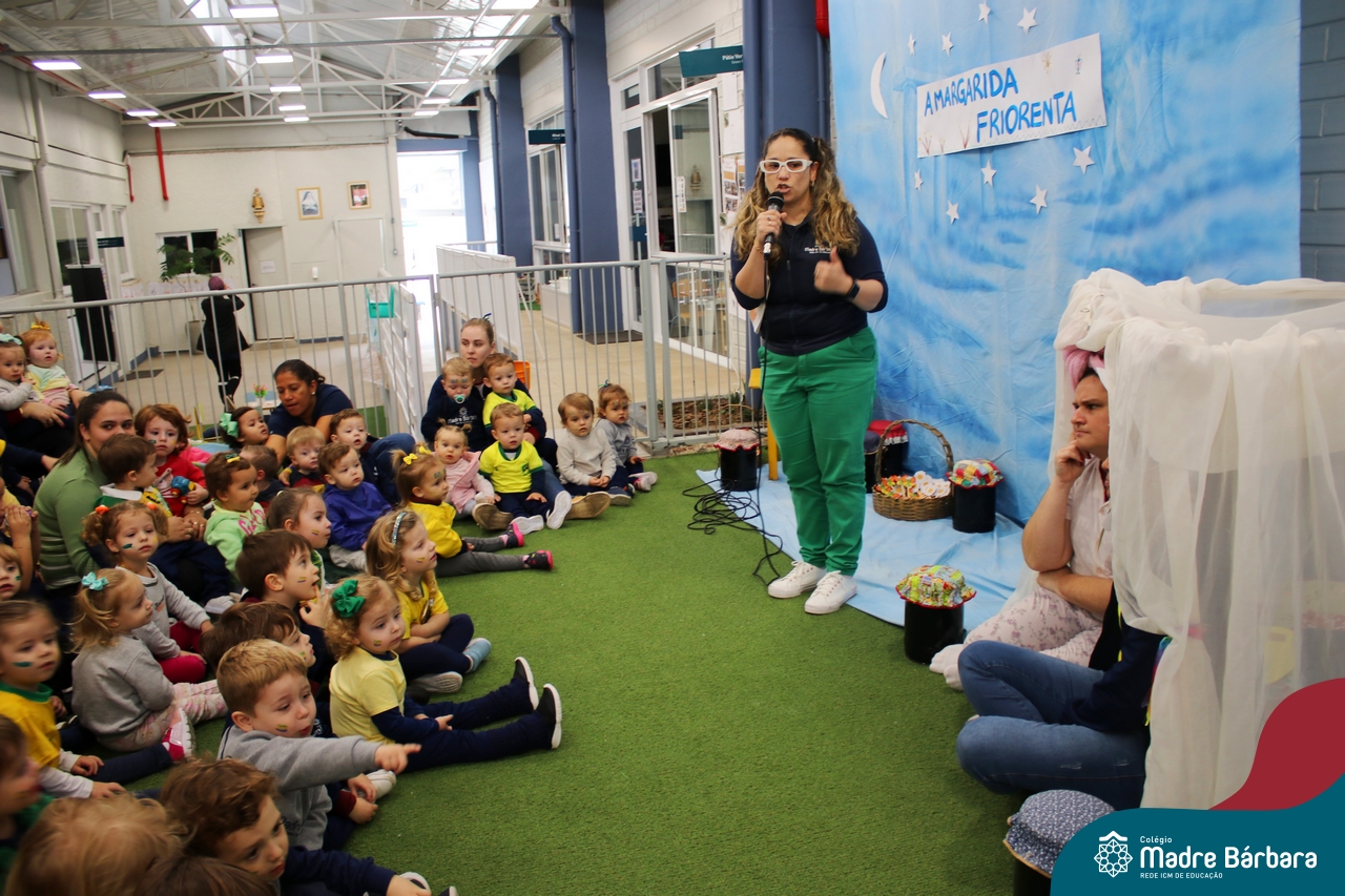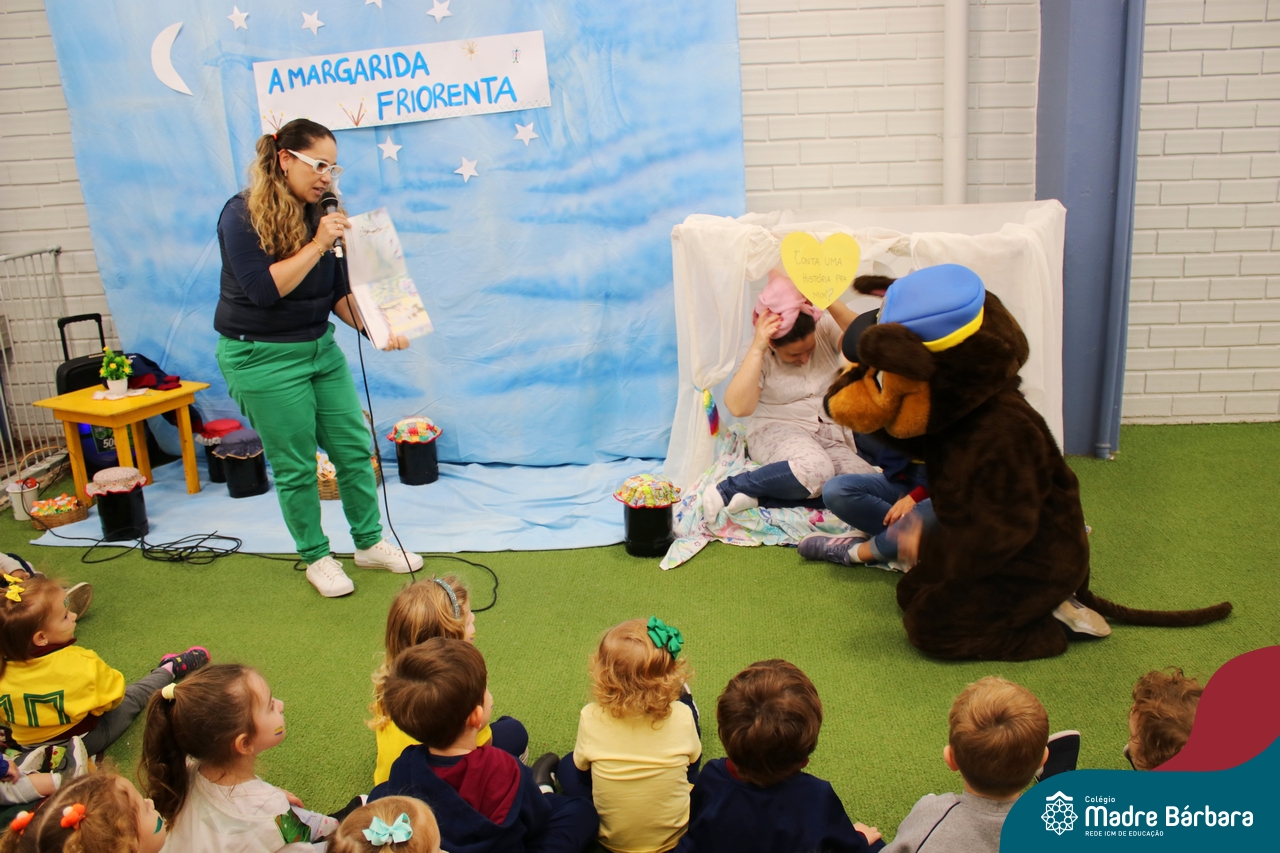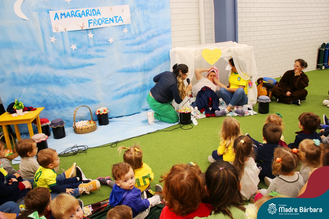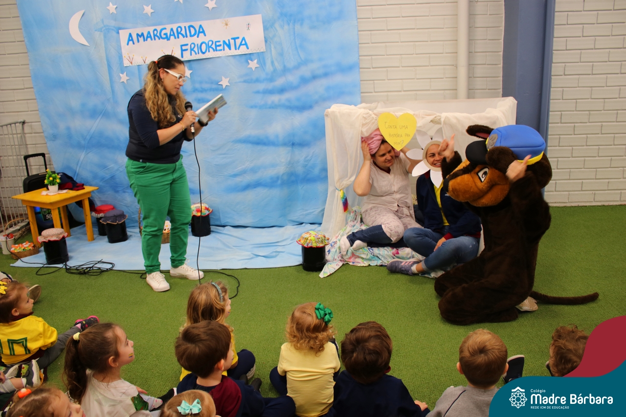 As crianças assistiram o teatro que envolveu a história: “A Margarida Friorenta”, de Fernanda Lopes de Almeida. As crianças ficaram encantadas com o desenrolar da história que teve o objetivo de trazer encantamento, carinho e afeto. Ao final da apresentação, assim como fez a Margarida, todos foram convidados a abraçar os colegas. Foi um momento lindo, repleto de carinho e amor.