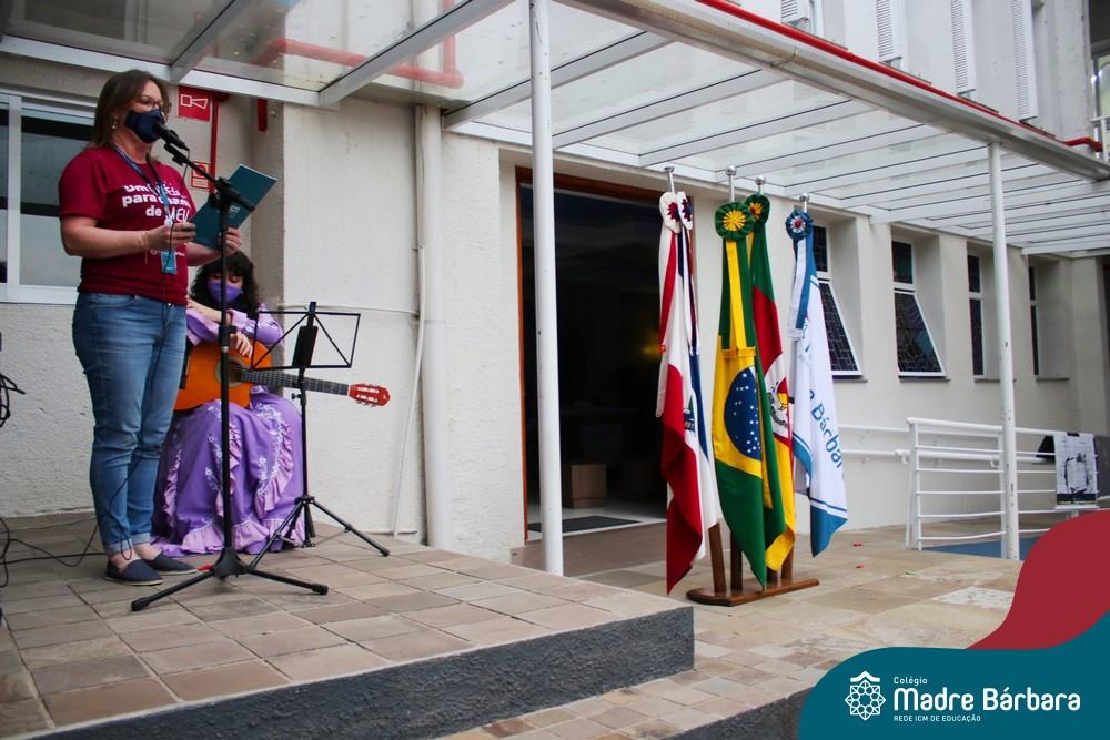Nesta segunda-feira (13.09) ocorreu a Abertura da Semana Farroupilha no Colégio Madre Bárbara – Rede ICM. Durante a manhã, após a fala da coordenadora pedagógica Justine Thomas, a aluna Tainá Bergamaschi esteve cantando músicas gauchescas, representando o CTG Bento Gonçalves. No turno da tarde, a coordenadora pedagógica Cláudia Rockenbach realizou a abertura que contou com a participação da professora Marina Fischer. Com todos os cuidados e prevenção pelo Covid-19, diversas serão as programações durante a Semana Farroupilha.