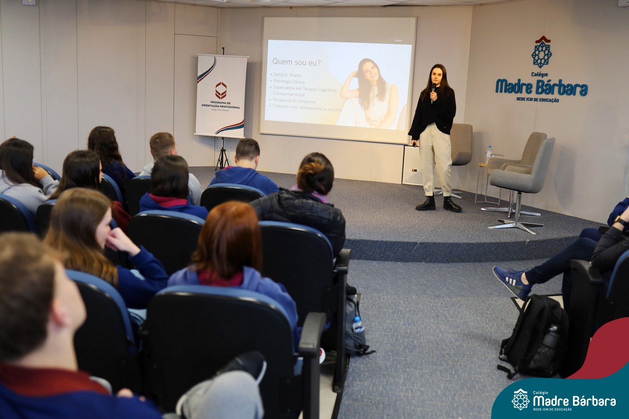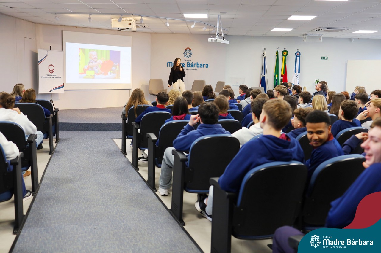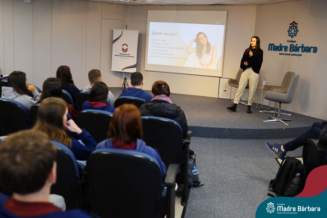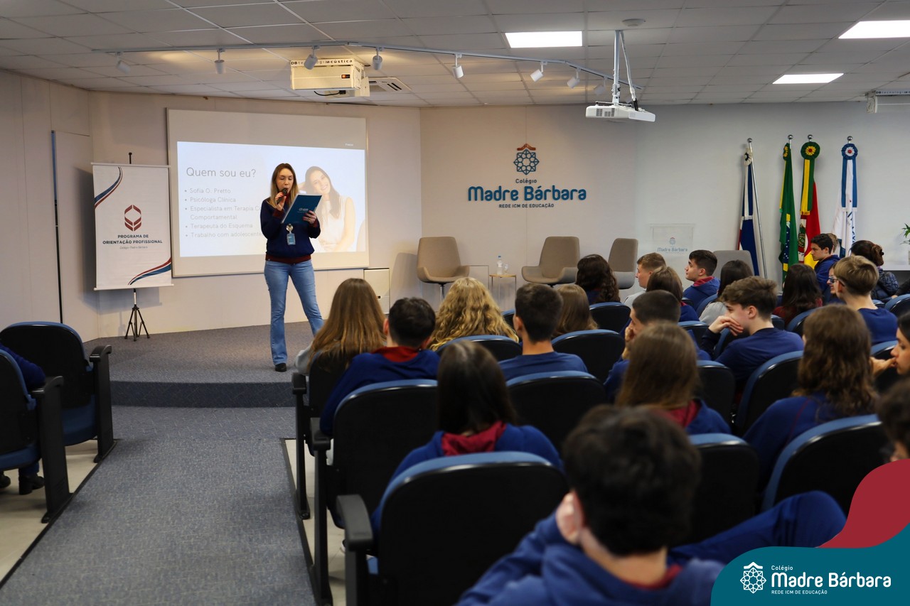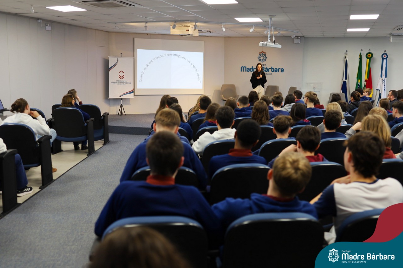A psicóloga convidada, Sofia Pretto, realizou diversas reflexões sobre características da geração Z, visão e análise sobre o mercado de trabalho, expectativas pessoais além de auxiliar os alunos com dicas para buscar identificar aptidões e reconhecimento sobre aquilo que traz satisfação e realização. O Colégio Madre Bárbara compreende que a realização pessoal no trabalho só se torna possível através da junção do maior número de informações e conhecimentos, para que escolham o caminho que vão trilhar, sendo que ele exige conhecer as oportunidades para auxiliar na escolha mais assertiva possível. A semana será intensa de atividades para reforçar este pensamento com os alunos.