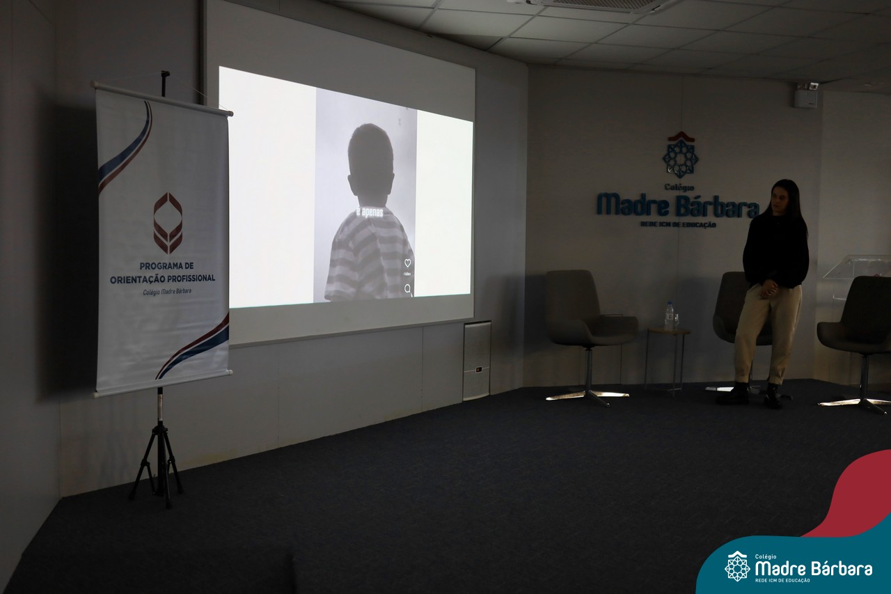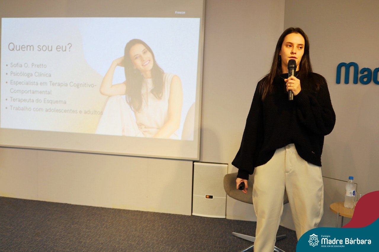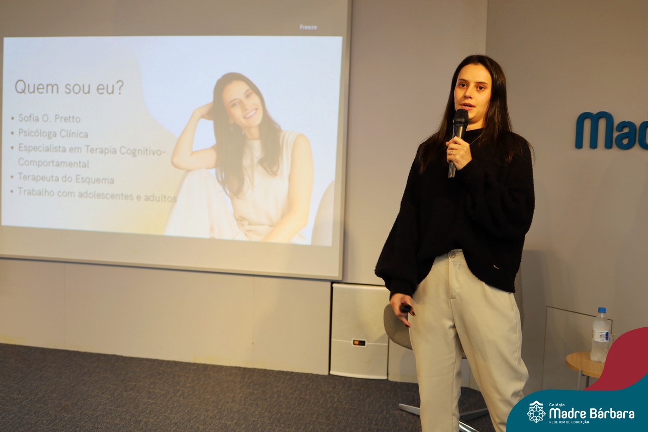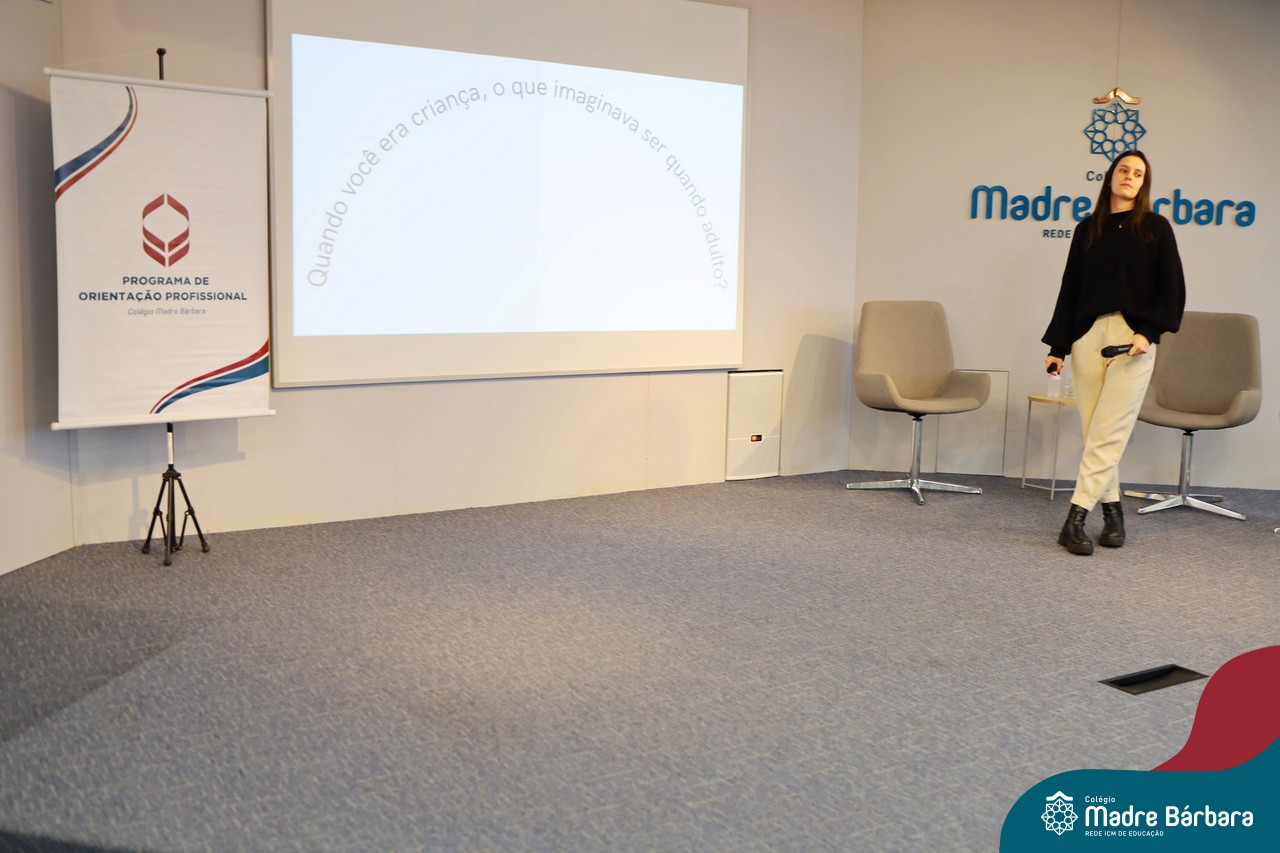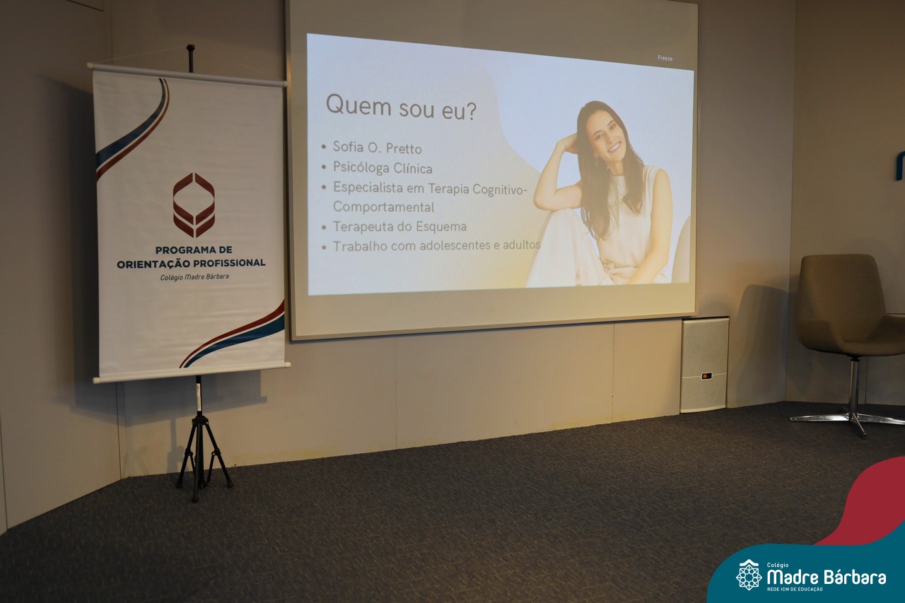 A psicóloga convidada, Sofia Pretto, realizou diversas reflexões sobre características da geração Z, visão e análise sobre o mercado de trabalho, expectativas pessoais além de auxiliar os alunos com dicas para buscar identificar aptidões e reconhecimento sobre aquilo que traz satisfação e realização. O Colégio Madre Bárbara compreende que a realização pessoal no trabalho só se torna possível através da junção do maior número de informações e conhecimentos, para que escolham o caminho que vão trilhar, sendo que ele exige conhecer as oportunidades para auxiliar na escolha mais assertiva possível. A semana será intensa de atividades para reforçar este pensamento com os alunos.