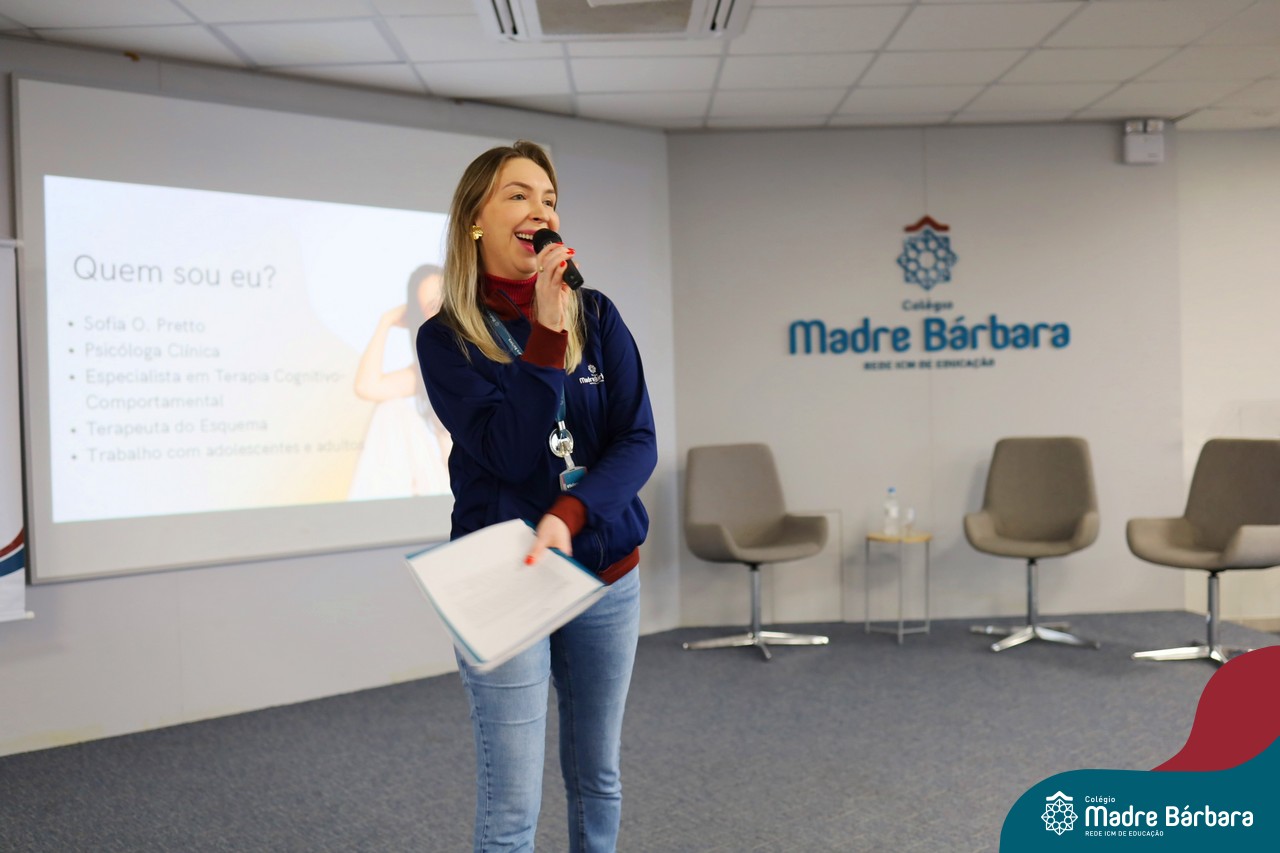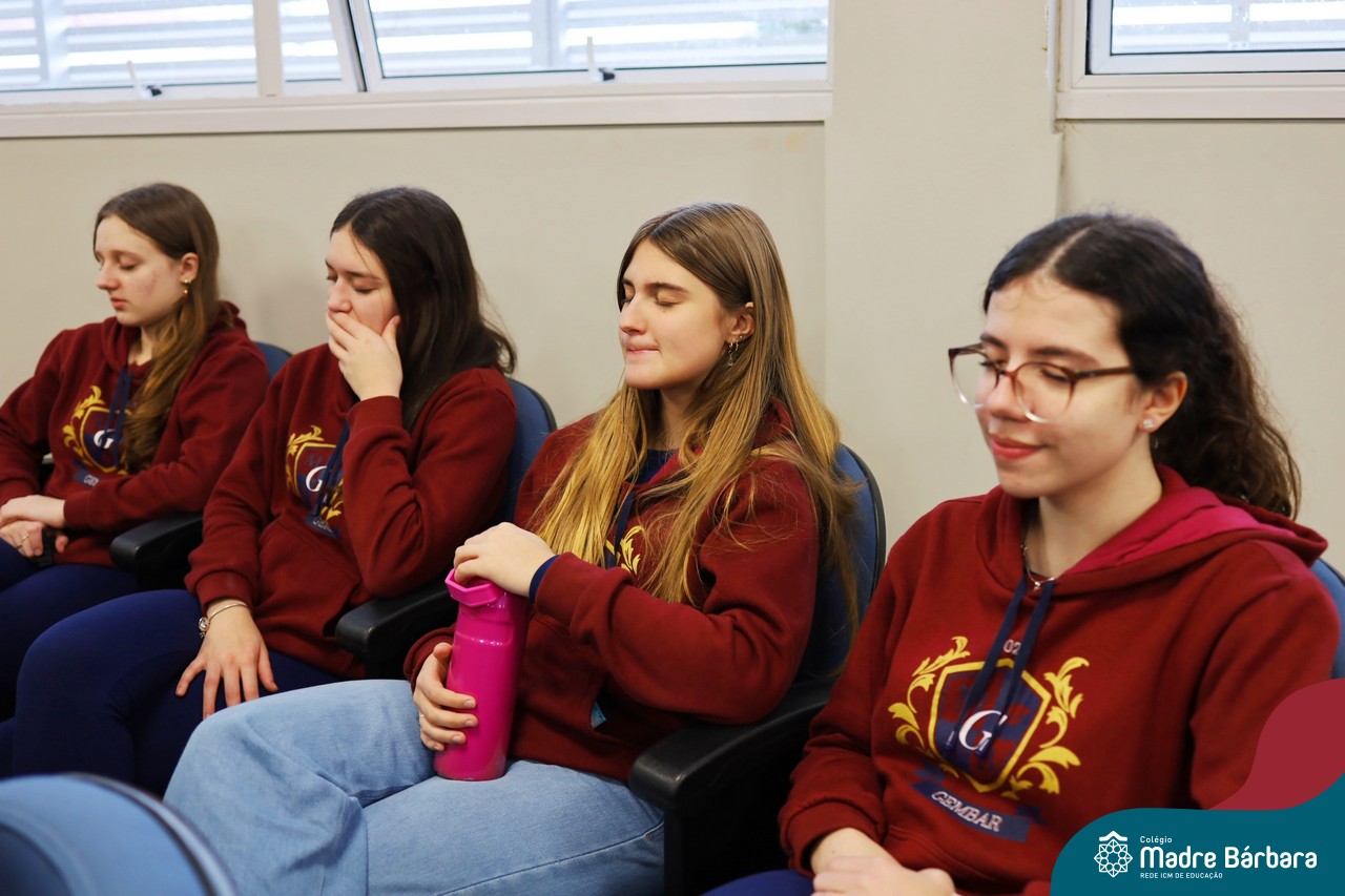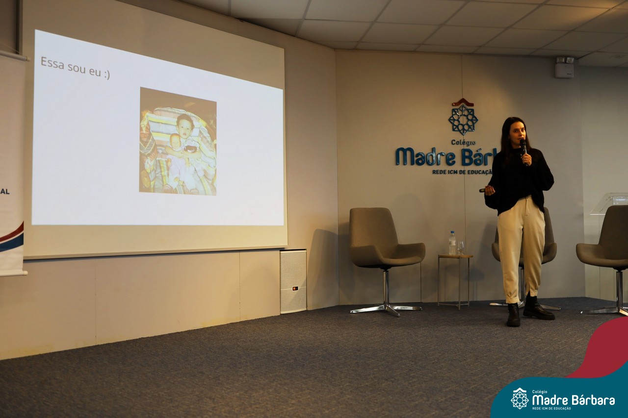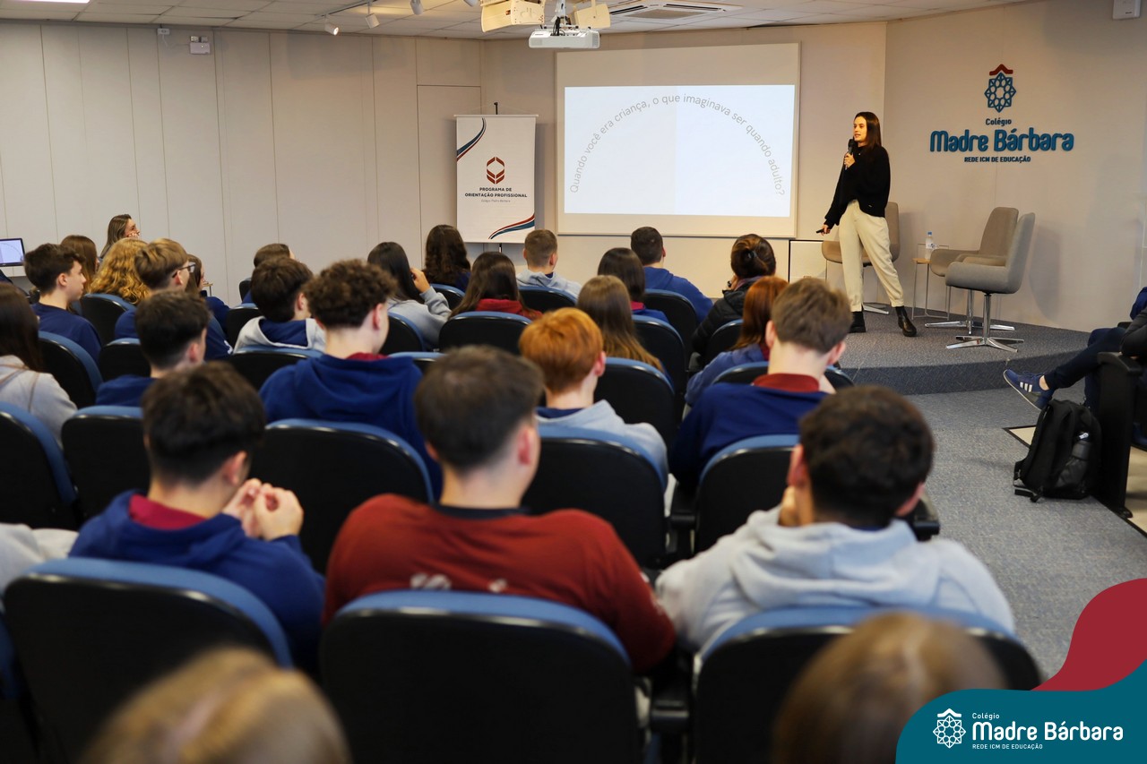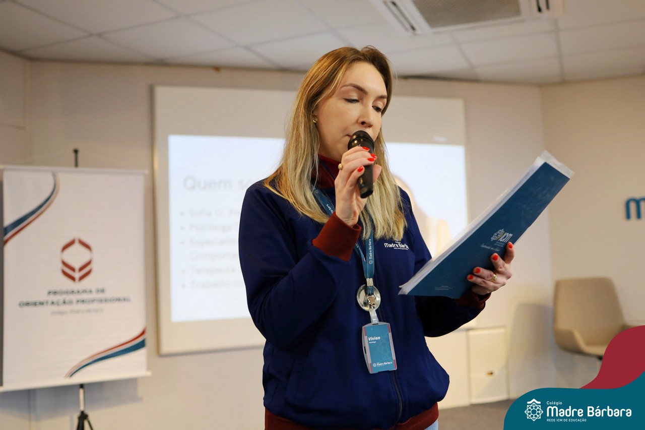 A psicóloga convidada, Sofia Pretto, realizou diversas reflexões sobre características da geração Z, visão e análise sobre o mercado de trabalho, expectativas pessoais além de auxiliar os alunos com dicas para buscar identificar aptidões e reconhecimento sobre aquilo que traz satisfação e realização. O Colégio Madre Bárbara compreende que a realização pessoal no trabalho só se torna possível através da junção do maior número de informações e conhecimentos, para que escolham o caminho que vão trilhar, sendo que ele exige conhecer as oportunidades para auxiliar na escolha mais assertiva possível. A semana será intensa de atividades para reforçar este pensamento com os alunos.