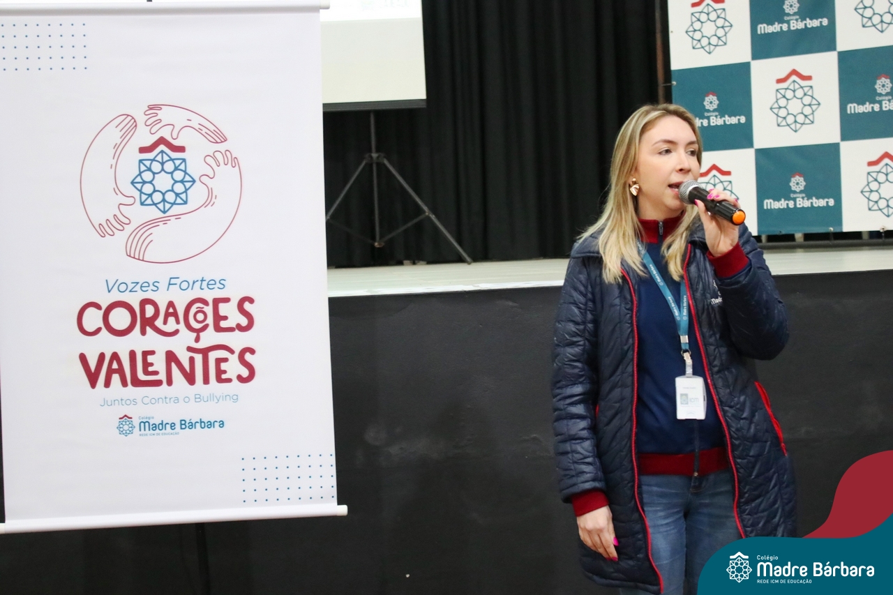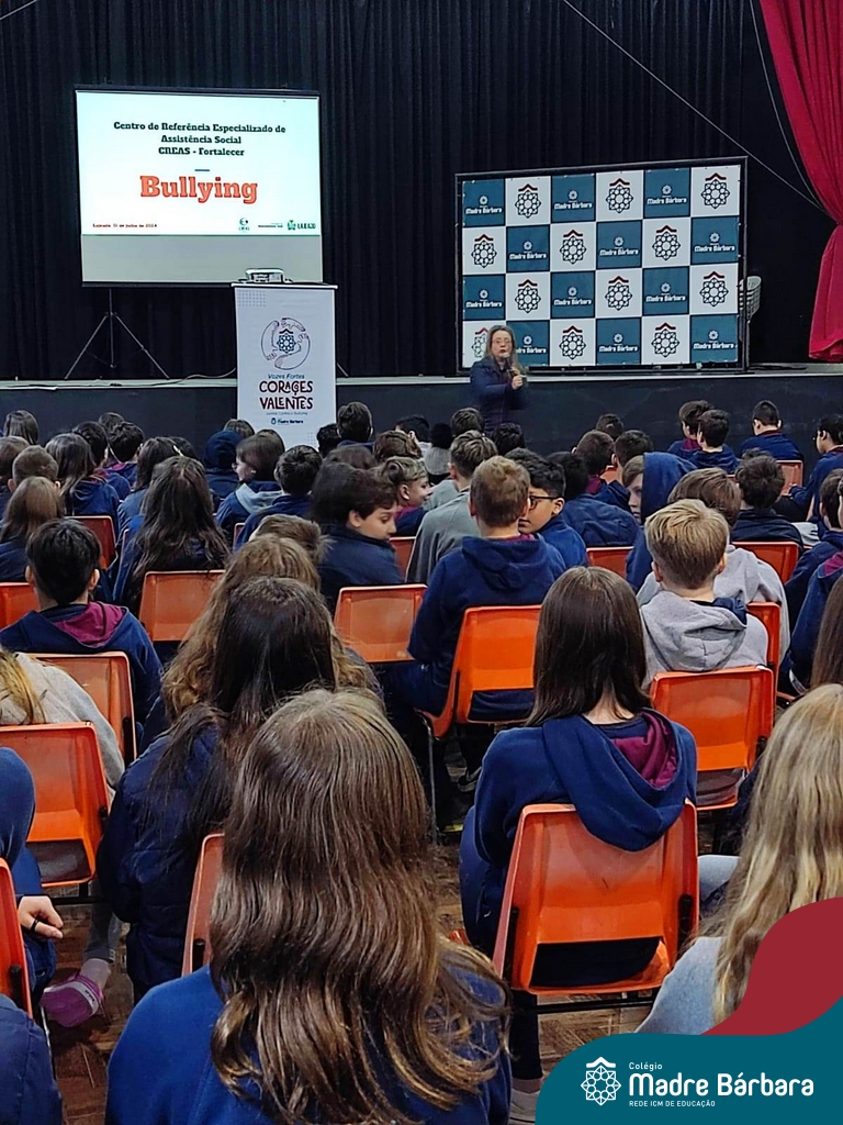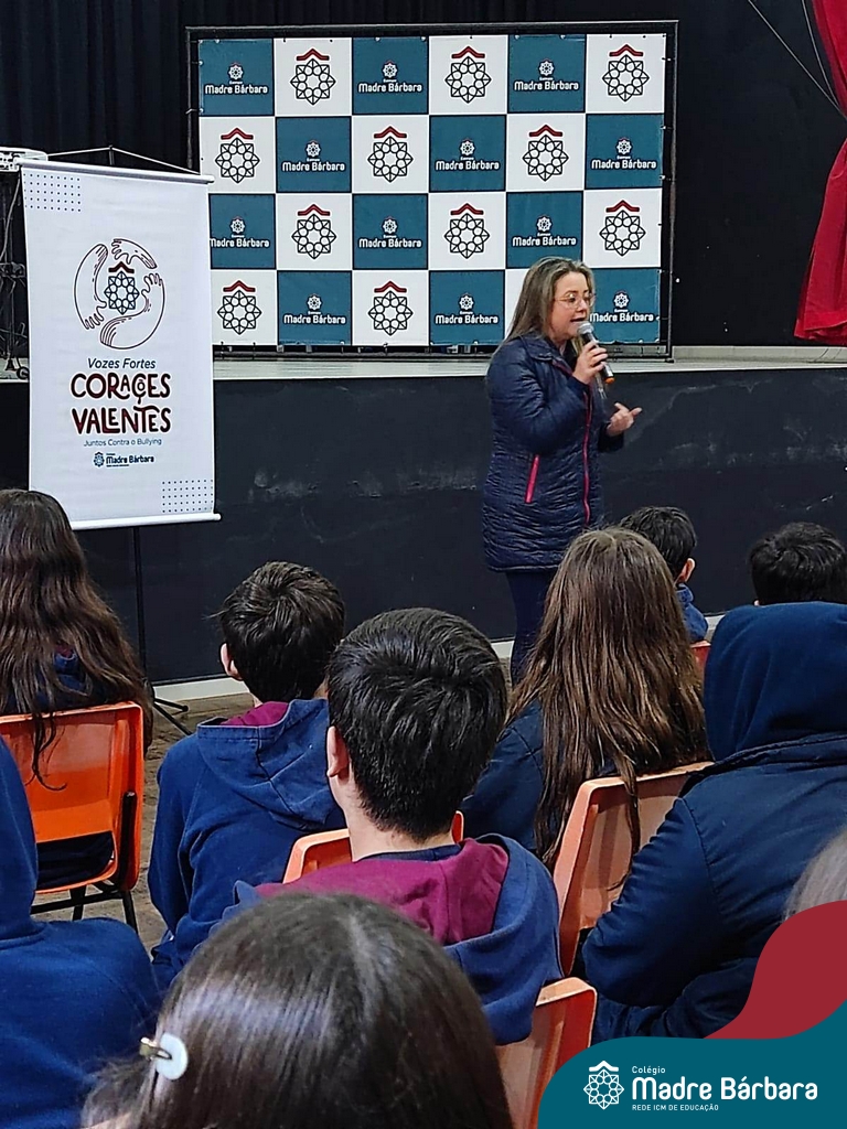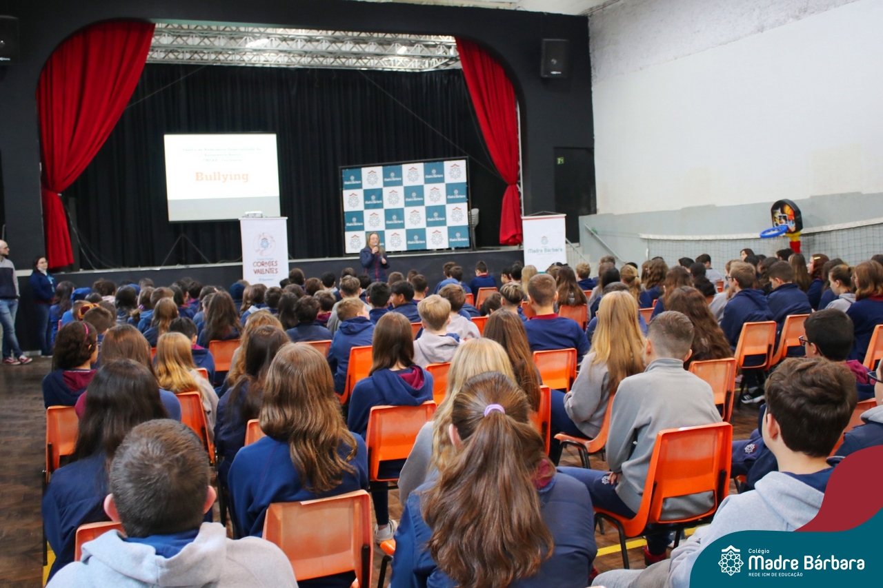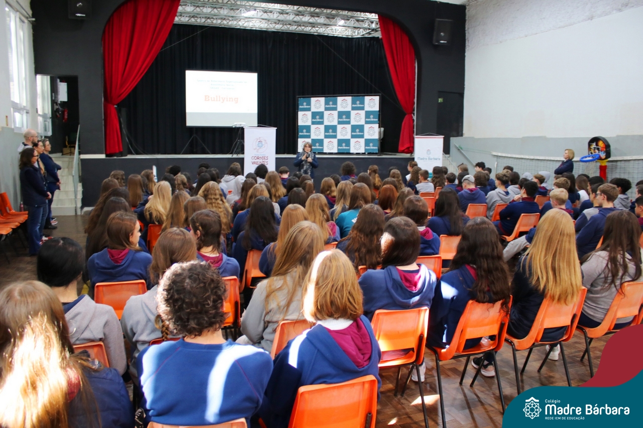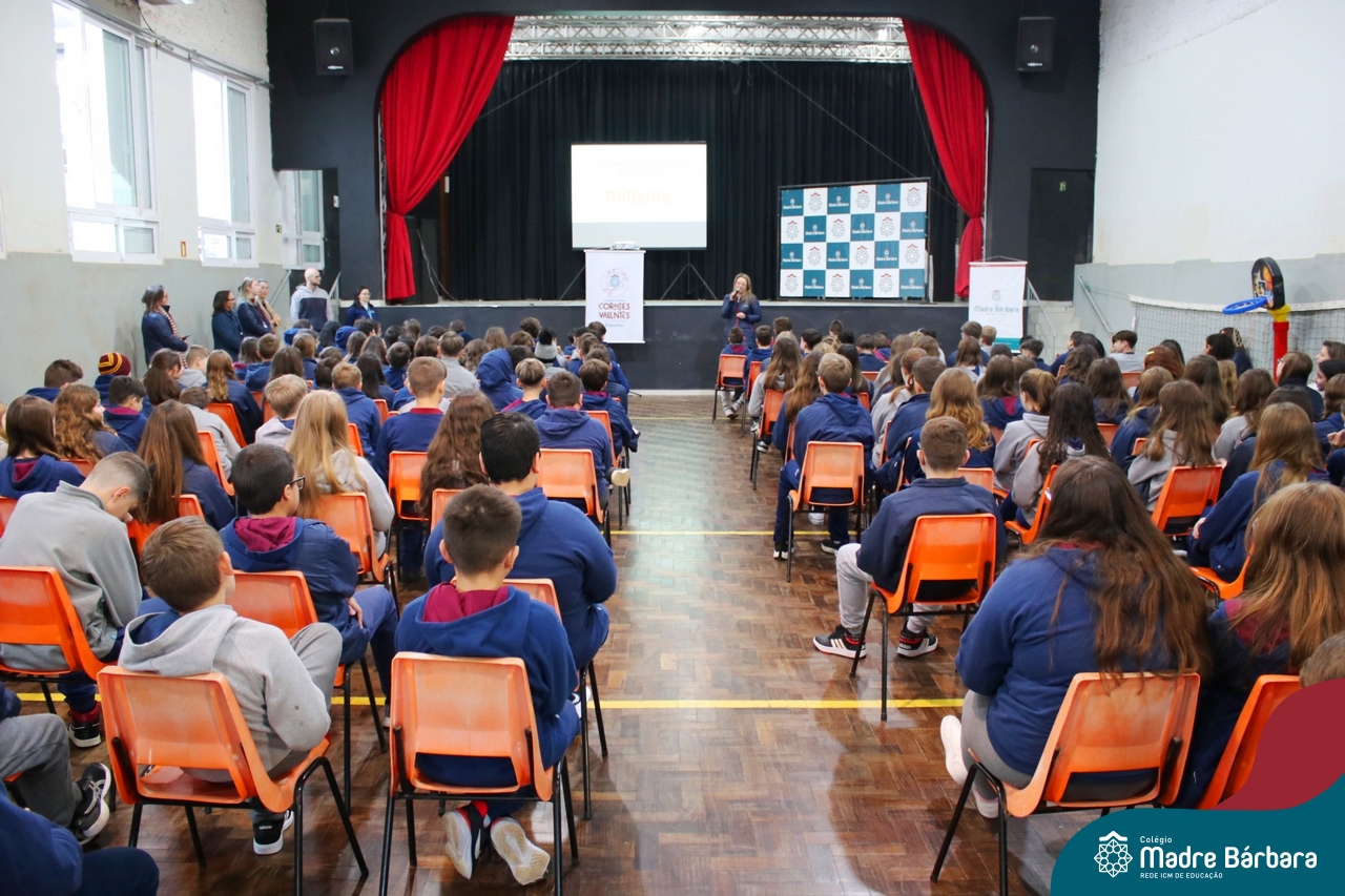Nesta manhã de quarta-feira (31), os Serviços de Psicologia Escolar, Orientação Educacional e Serviço Social do Colégio Madre Bárbara – Rede ICM, realizaram a Abertura do Programa de Prevenção e Enfrentamento ao Bullying com os estudantes do Ensino Fundamental, de 6º ao 9ª ano do Ensino Fundamental – Anos Finais. Neste ano, a equipe formalizou as ações que já vinham sendo desenvolvidas, através da elaboração de um programa permanente de Prevenção ao Bullying. Na oportunidade foi apresentado aos estudantes, a nova marca oficial do programa, criado pelo marketing da Rede ICM de Educação, com o slogan: “Vozes Fortes Corações Valentes – Juntos contra o bullying”.
