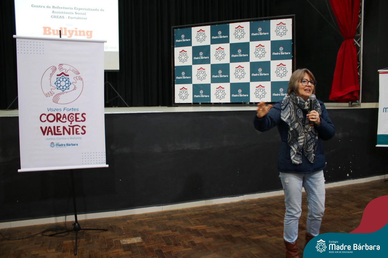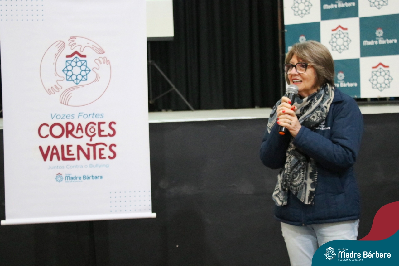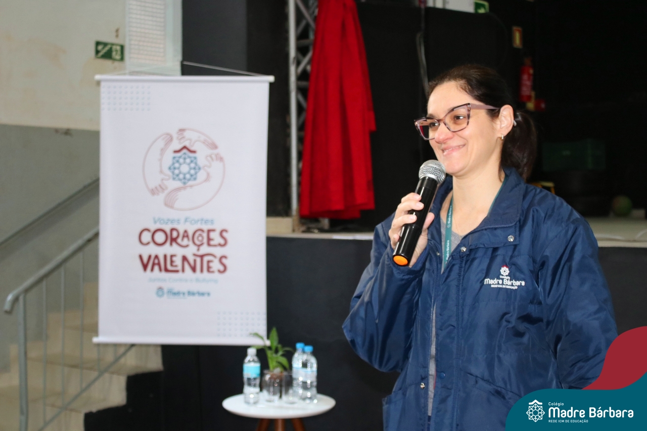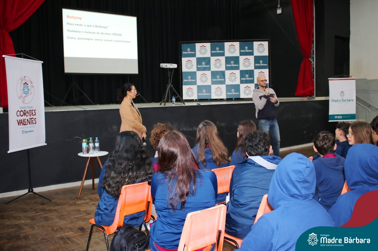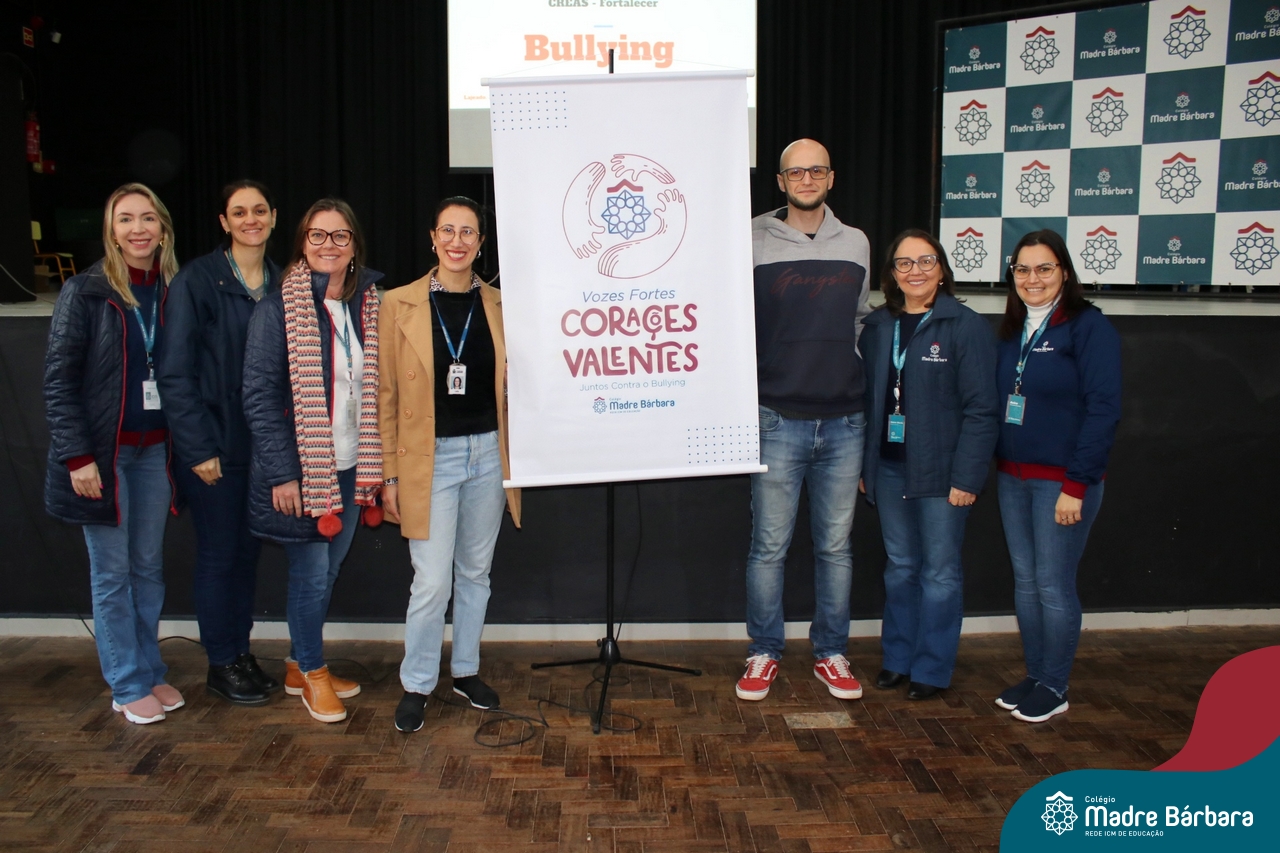 Nesta manhã de quarta-feira (31), os Serviços de Psicologia Escolar, Orientação Educacional e Serviço Social do Colégio Madre Bárbara – Rede ICM, realizaram a Abertura do Programa de Prevenção e Enfrentamento ao Bullying com os estudantes do Ensino Fundamental, de 6º ao 9ª ano do Ensino Fundamental – Anos Finais. Neste ano, a equipe formalizou as ações que já vinham sendo desenvolvidas, através da elaboração de um programa permanente de Prevenção ao Bullying. Na oportunidade foi apresentado aos estudantes, a nova marca oficial do programa, criado pelo marketing da Rede ICM de Educação, com o slogan: “Vozes Fortes Corações Valentes – Juntos contra o bullying”.