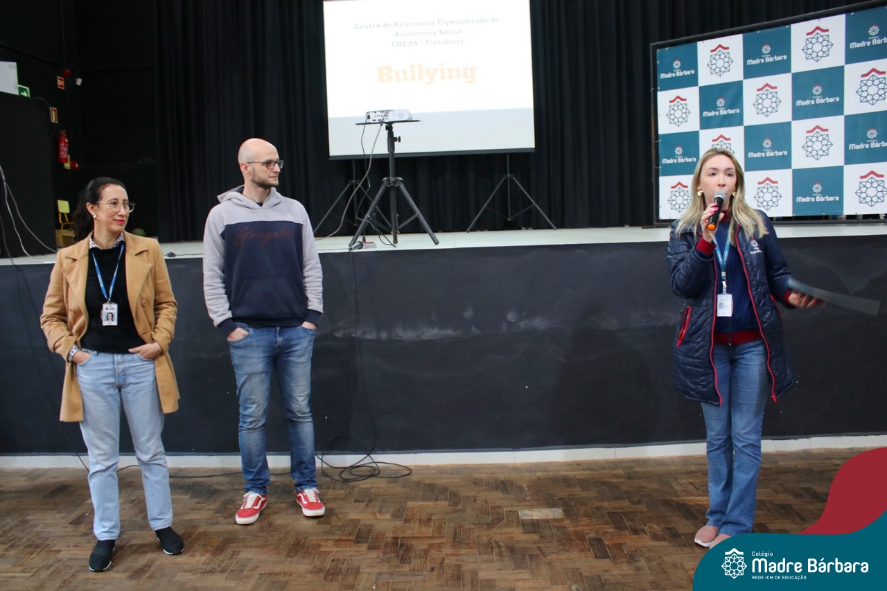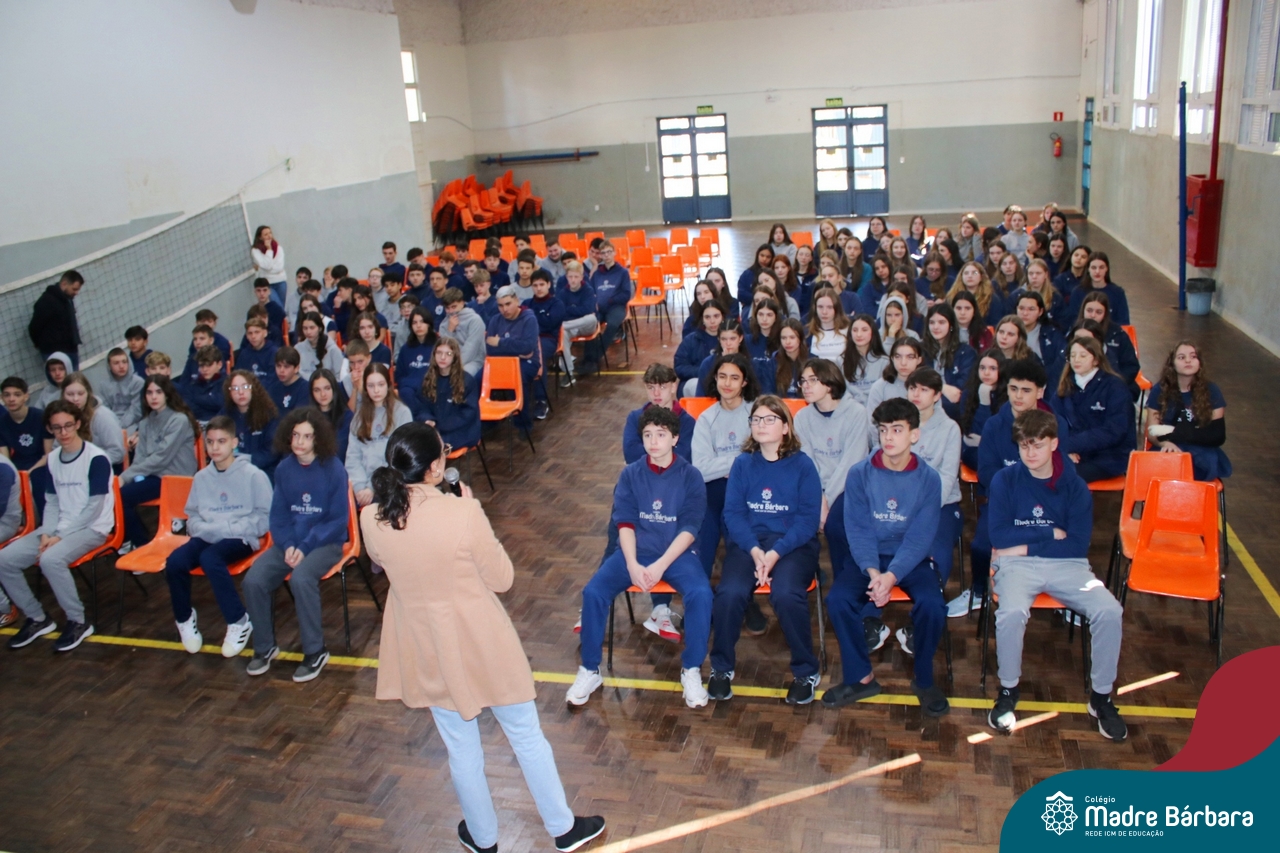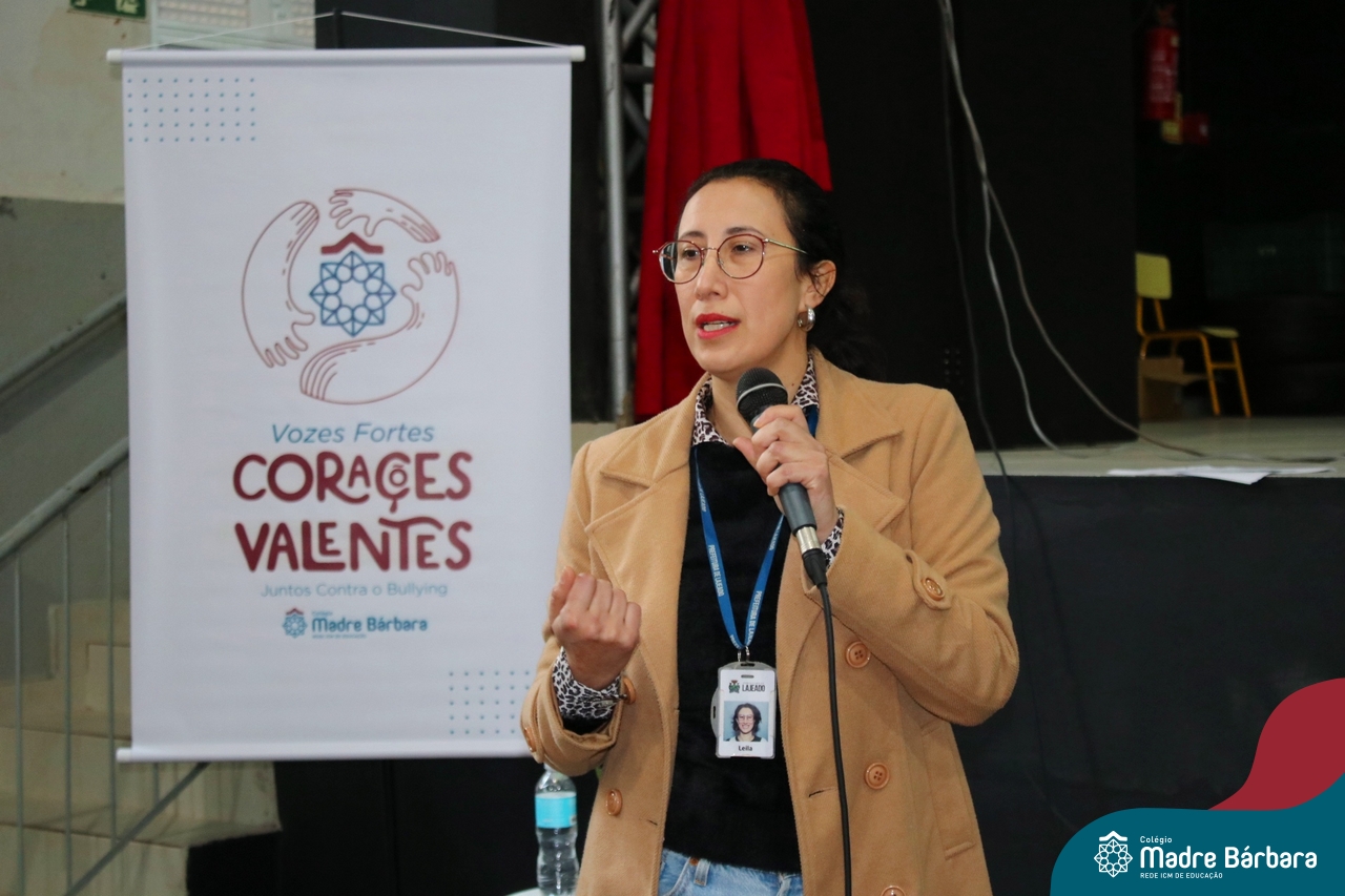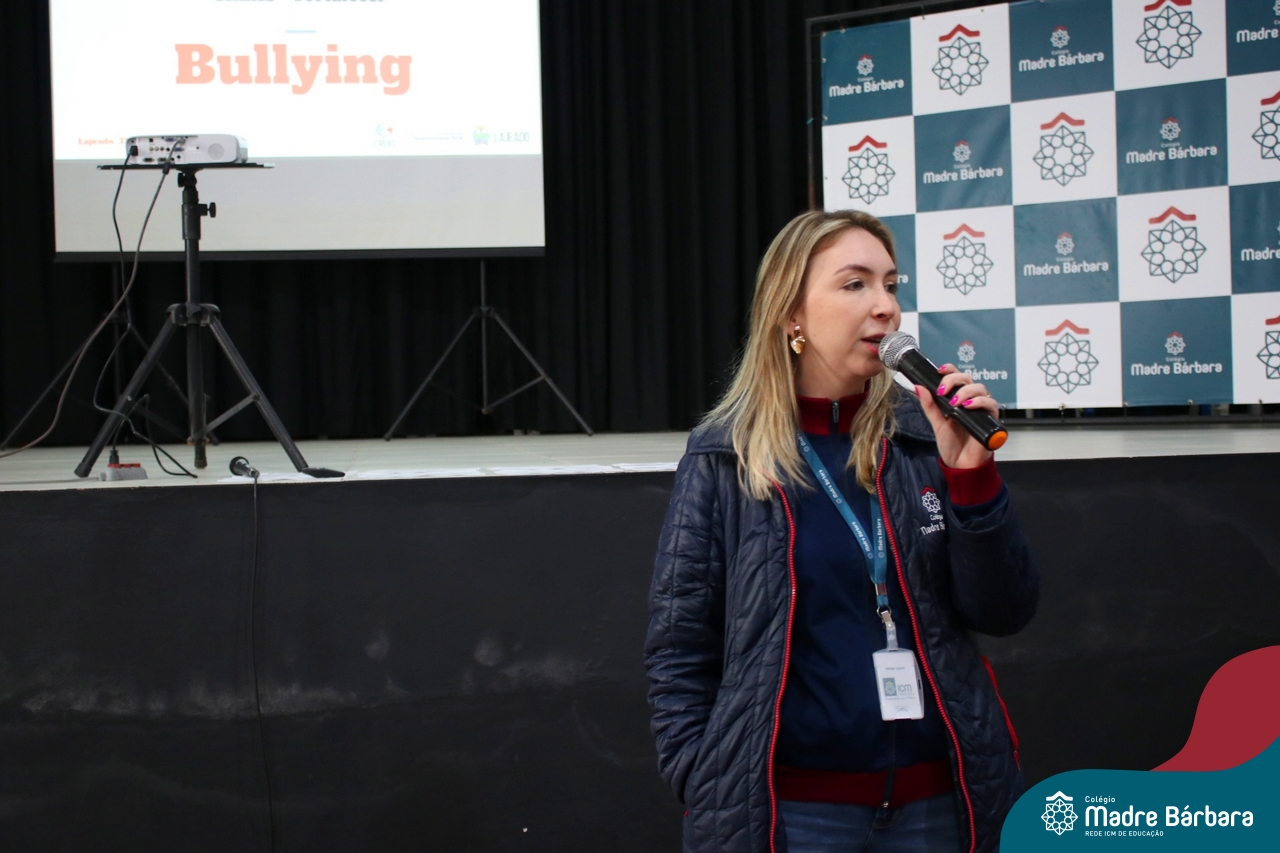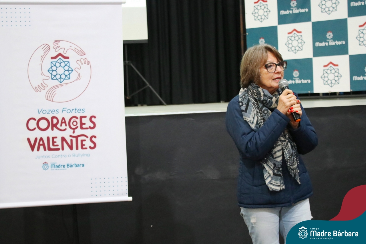 Nesta manhã de quarta-feira (31), os Serviços de Psicologia Escolar, Orientação Educacional e Serviço Social do Colégio Madre Bárbara – Rede ICM, realizaram a Abertura do Programa de Prevenção e Enfrentamento ao Bullying com os estudantes do Ensino Fundamental, de 6º ao 9ª ano do Ensino Fundamental – Anos Finais. Neste ano, a equipe formalizou as ações que já vinham sendo desenvolvidas, através da elaboração de um programa permanente de Prevenção ao Bullying. Na oportunidade foi apresentado aos estudantes, a nova marca oficial do programa, criado pelo marketing da Rede ICM de Educação, com o slogan: “Vozes Fortes Corações Valentes – Juntos contra o bullying”.