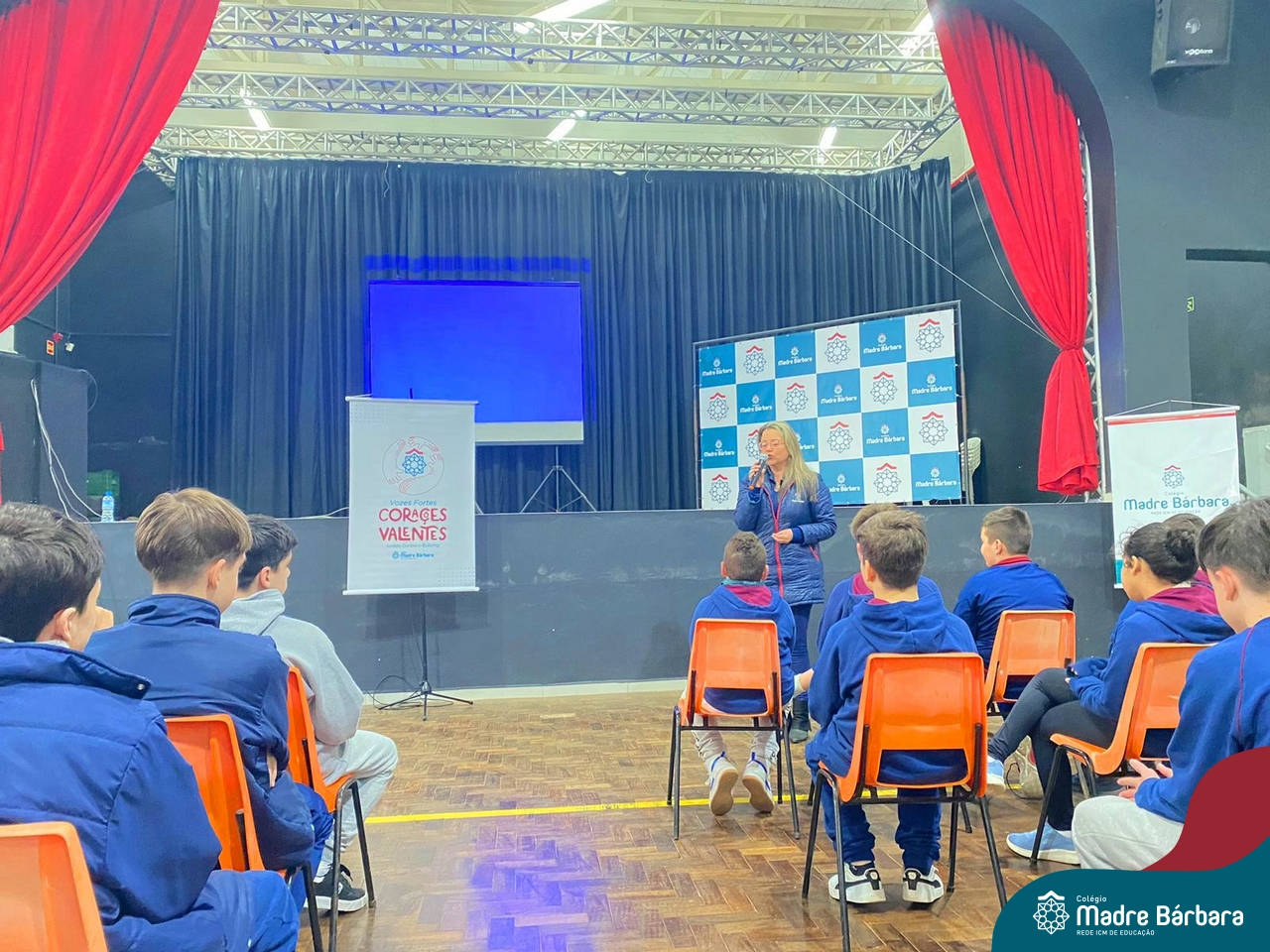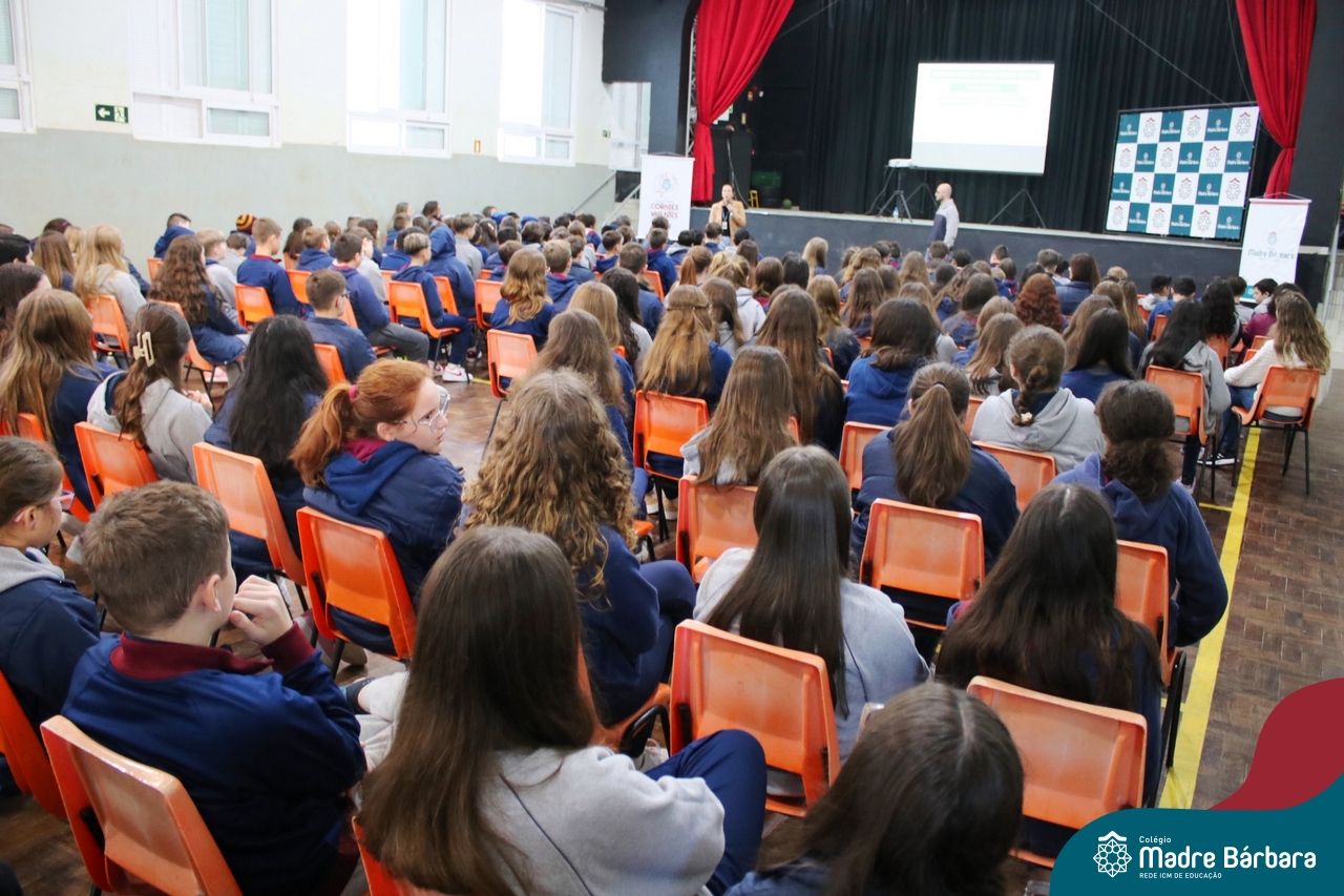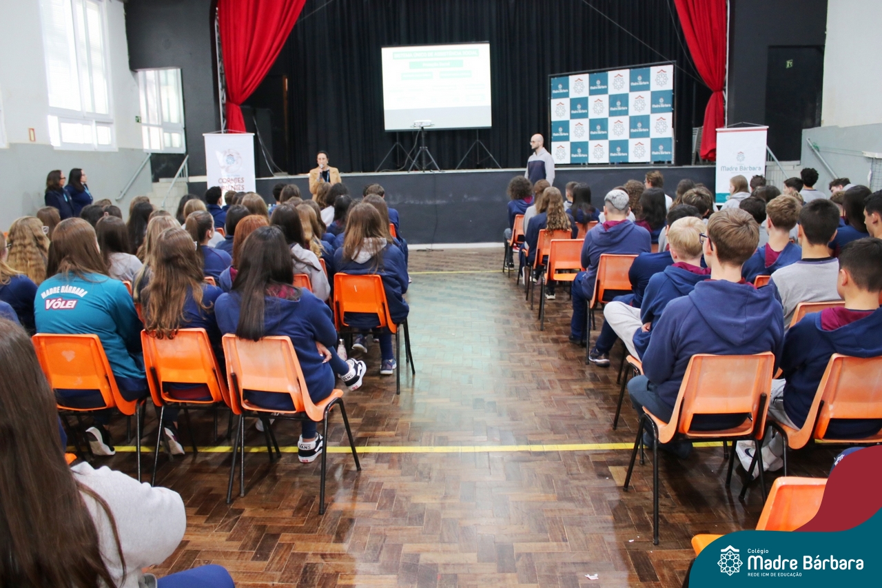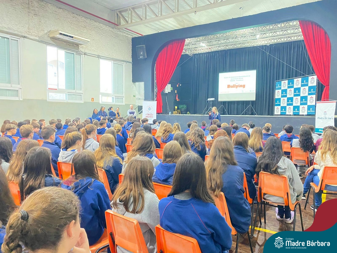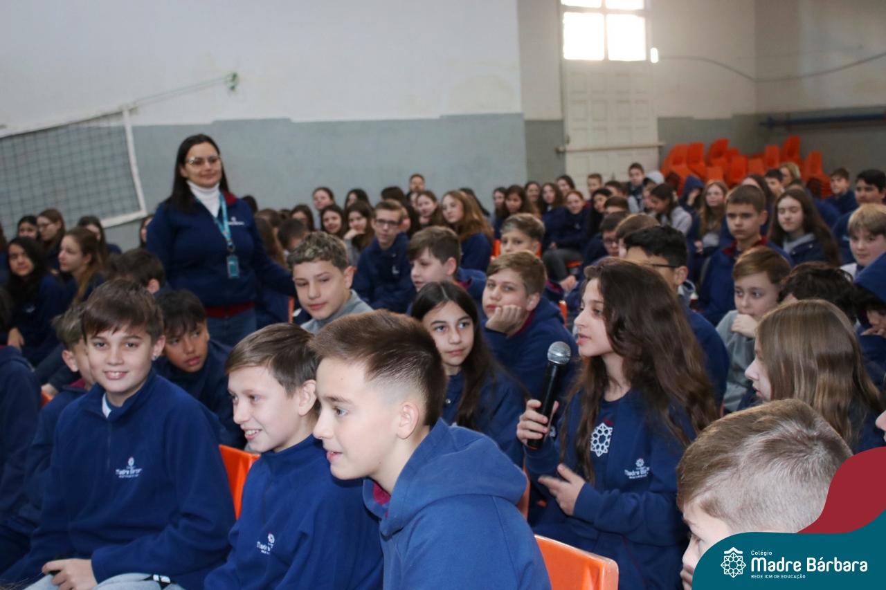 Nesta manhã de quarta-feira (31), os Serviços de Psicologia Escolar, Orientação Educacional e Serviço Social do Colégio Madre Bárbara – Rede ICM, realizaram a Abertura do Programa de Prevenção e Enfrentamento ao Bullying com os estudantes do Ensino Fundamental, de 6º ao 9ª ano do Ensino Fundamental – Anos Finais. Neste ano, a equipe formalizou as ações que já vinham sendo desenvolvidas, através da elaboração de um programa permanente de Prevenção ao Bullying. Na oportunidade foi apresentado aos estudantes, a nova marca oficial do programa, criado pelo marketing da Rede ICM de Educação, com o slogan: “Vozes Fortes Corações Valentes – Juntos contra o bullying”.