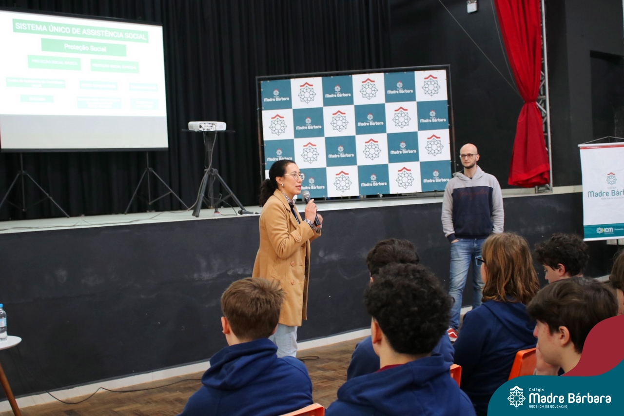 Contamos com a parceria do Psicólogo Afonso Wenneker Roveda, especialista em saúde da família e mestre em Psicologia Social e Institucional, e Leila Ponciano coordenadora do CREAS Fortalecer de Lajeado, Assistente Social e especialista em Gestão Pública, para refletir sobre esta temática com nossos estudantes. Os palestrantes refletiram sobre o que é o bullying, as formas e as consequências aplicadas conforme a faixa etária, os direitos e deveres e também sobre as legislações vigentes. A equipe multidisciplinar da instituição, reforçou sobre a importância de desenvolver e implementar programas educativos e de conscientização sobre bullying para os estudantes, suas famílias e professores, buscando aumentar o entendimento sobre o tema e promover uma cultura escolar mais inclusiva e respeitosa de prevenção e combate ao bullying.