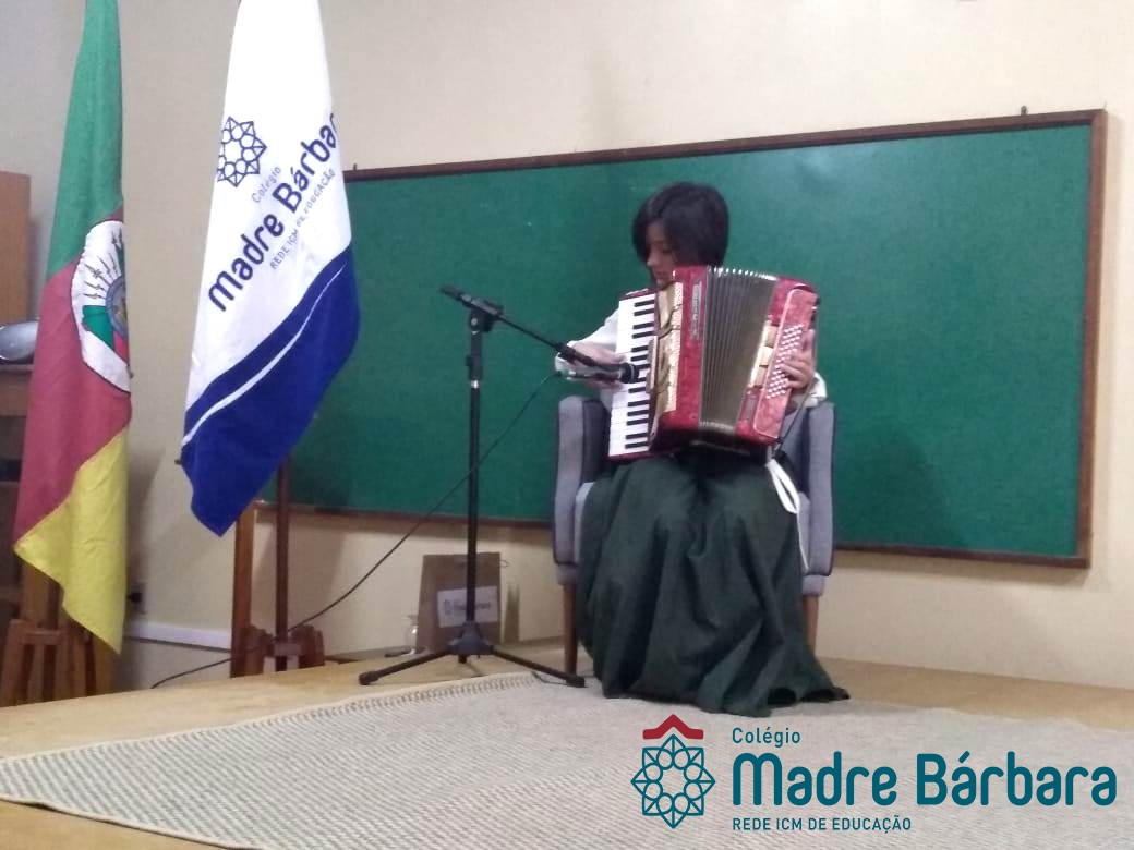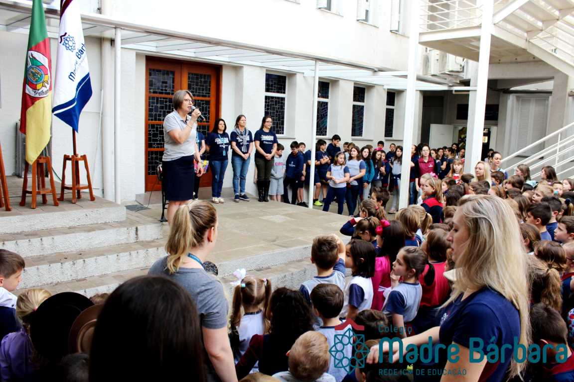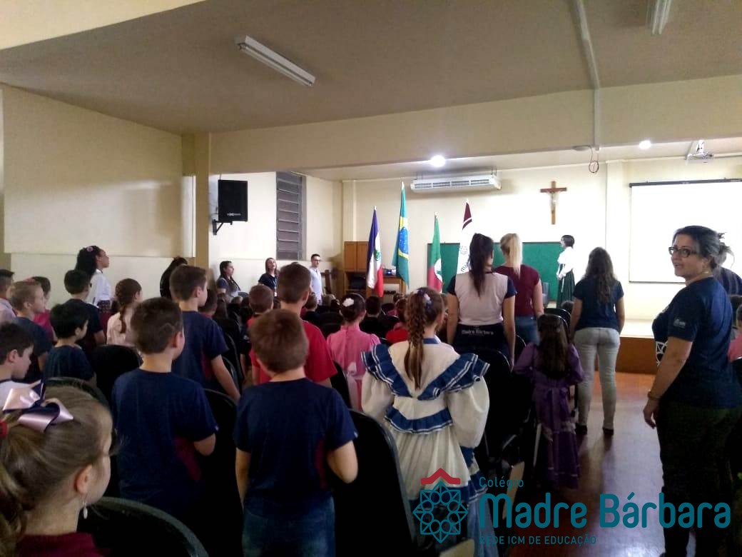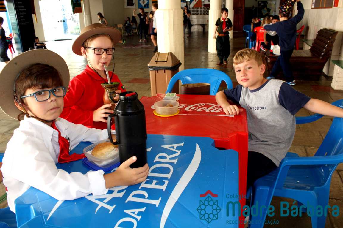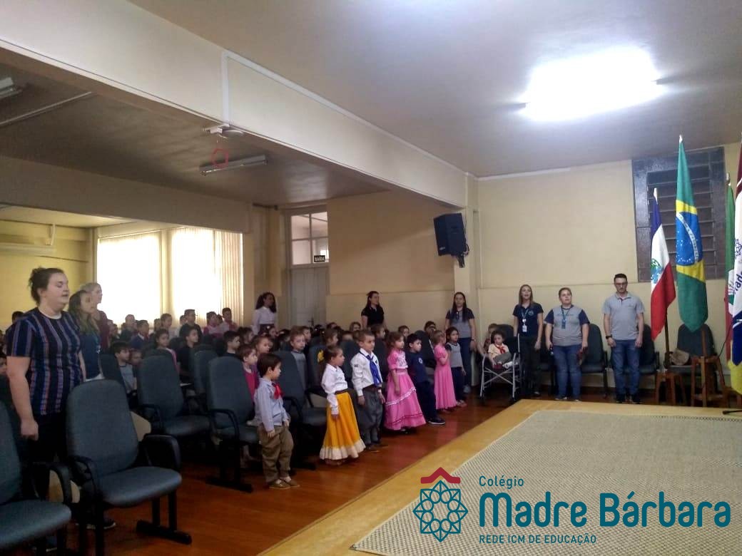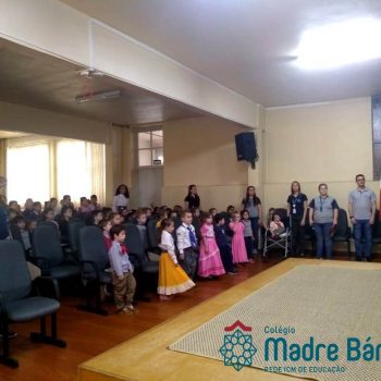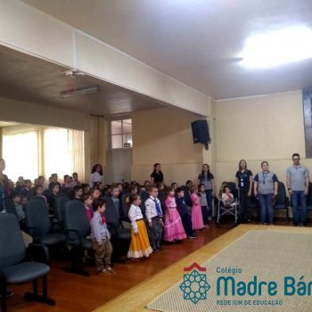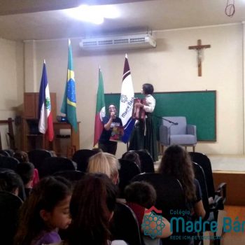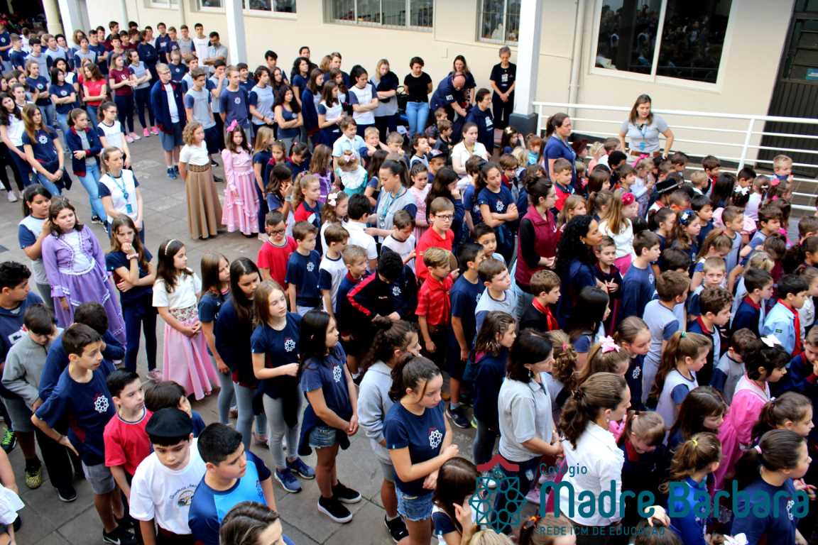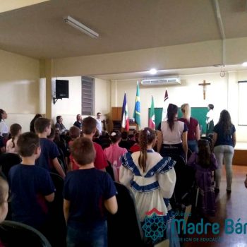 Na manhã dessa segunda-feira (16.09) os alunos, professores e funcionários do Colégio Madre Bárbara – Rede ICM participaram da Abertura da Semana Farroupilha. No primeiro momento, todos cantaram o hino rio-grandense e após a mensagem da professora de história Juciane Sehn, a aluna Amanda Medeiros tocou músicas gauchescas com a gaita. A presidente do Grêmio Estudantil, Laura Prass Schossler falou sobre o Concurso do Gembar que está sendo realizado durante a Semana Farroupilha e premiará a melhor prenda, o melhor gaúcho, a melhor cuia ornamentada e também a melhor fotografia. Durante a manhã também aconteceu a mateada das turmas, nas salas de aula e no pátio.