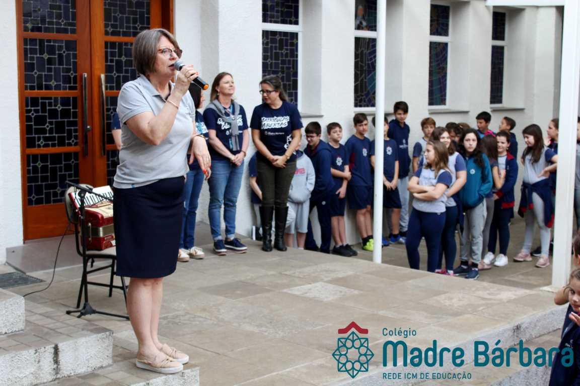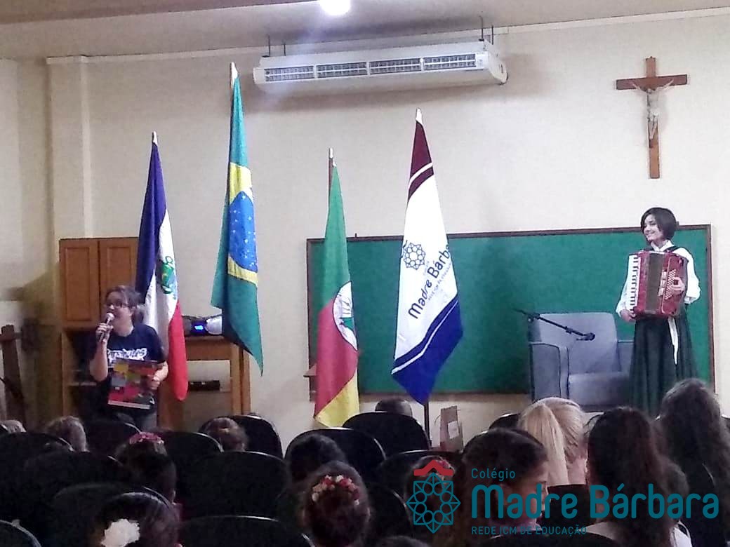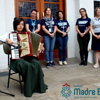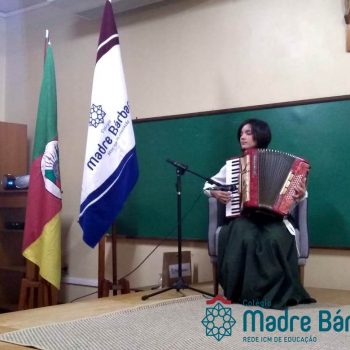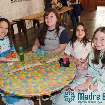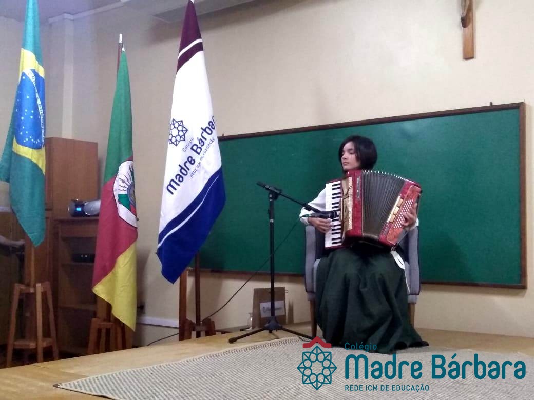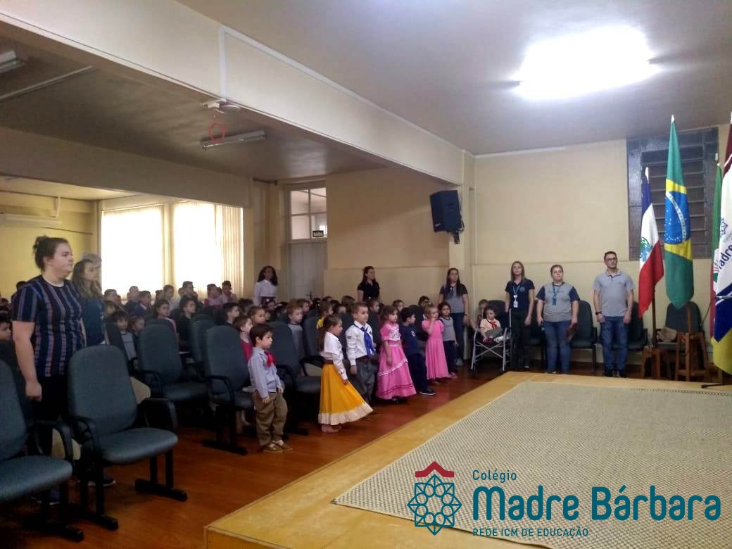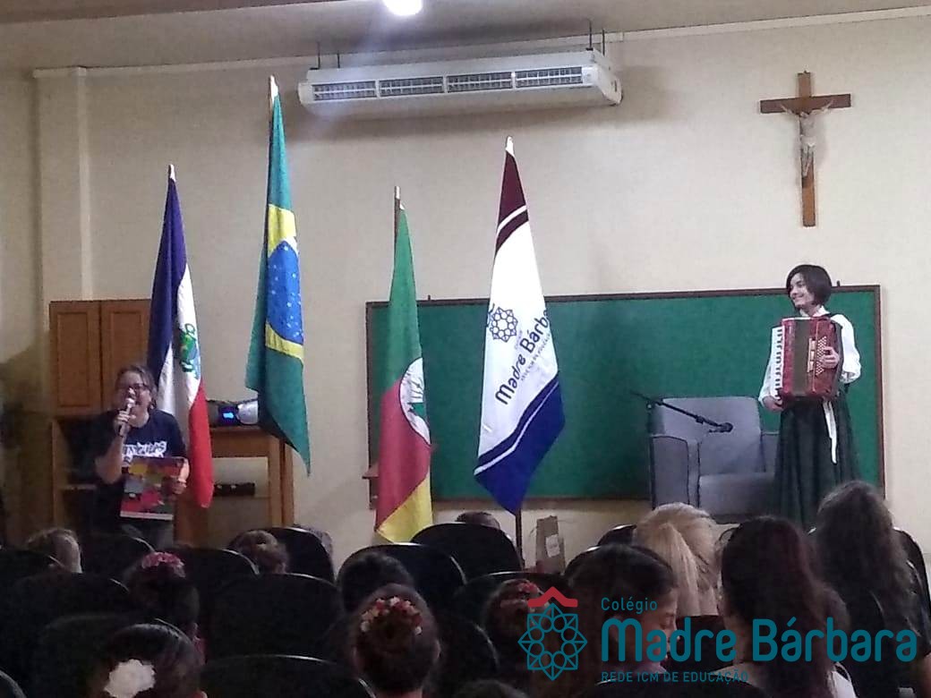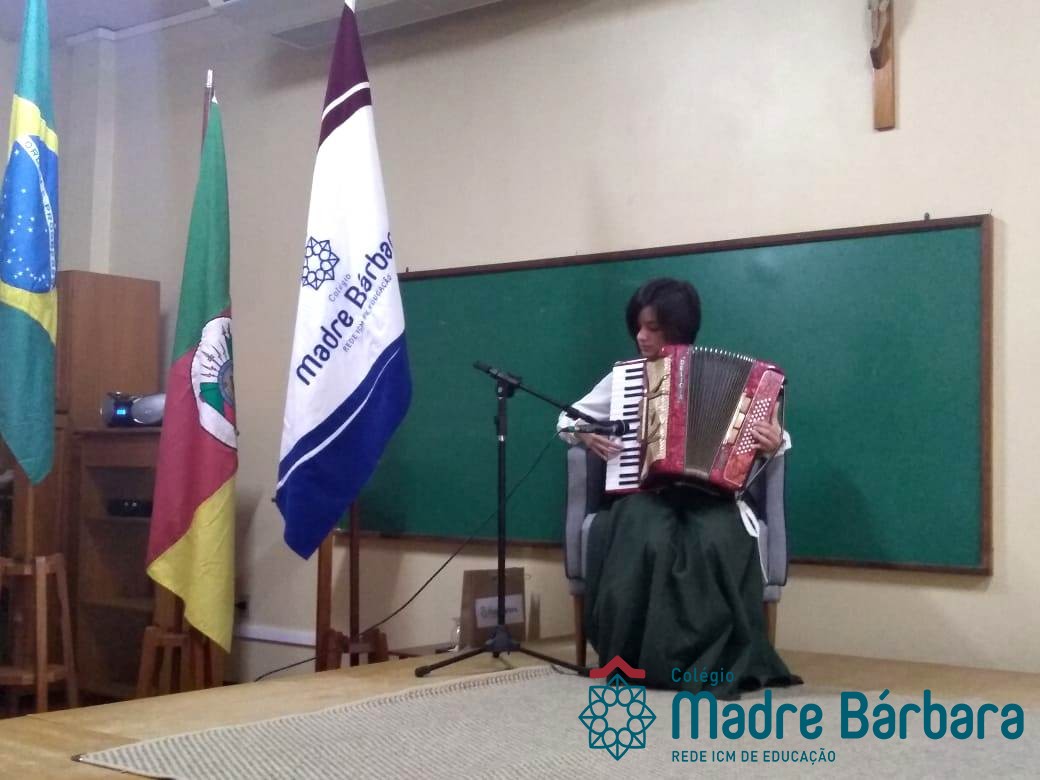 Na manhã dessa segunda-feira (16.09) os alunos, professores e funcionários do Colégio Madre Bárbara – Rede ICM participaram da Abertura da Semana Farroupilha. No primeiro momento, todos cantaram o hino rio-grandense e após a mensagem da professora de história Juciane Sehn, a aluna Amanda Medeiros tocou músicas gauchescas com a gaita. A presidente do Grêmio Estudantil, Laura Prass Schossler falou sobre o Concurso do Gembar que está sendo realizado durante a Semana Farroupilha e premiará a melhor prenda, o melhor gaúcho, a melhor cuia ornamentada e também a melhor fotografia. Durante a manhã também aconteceu a mateada das turmas, nas salas de aula e no pátio.