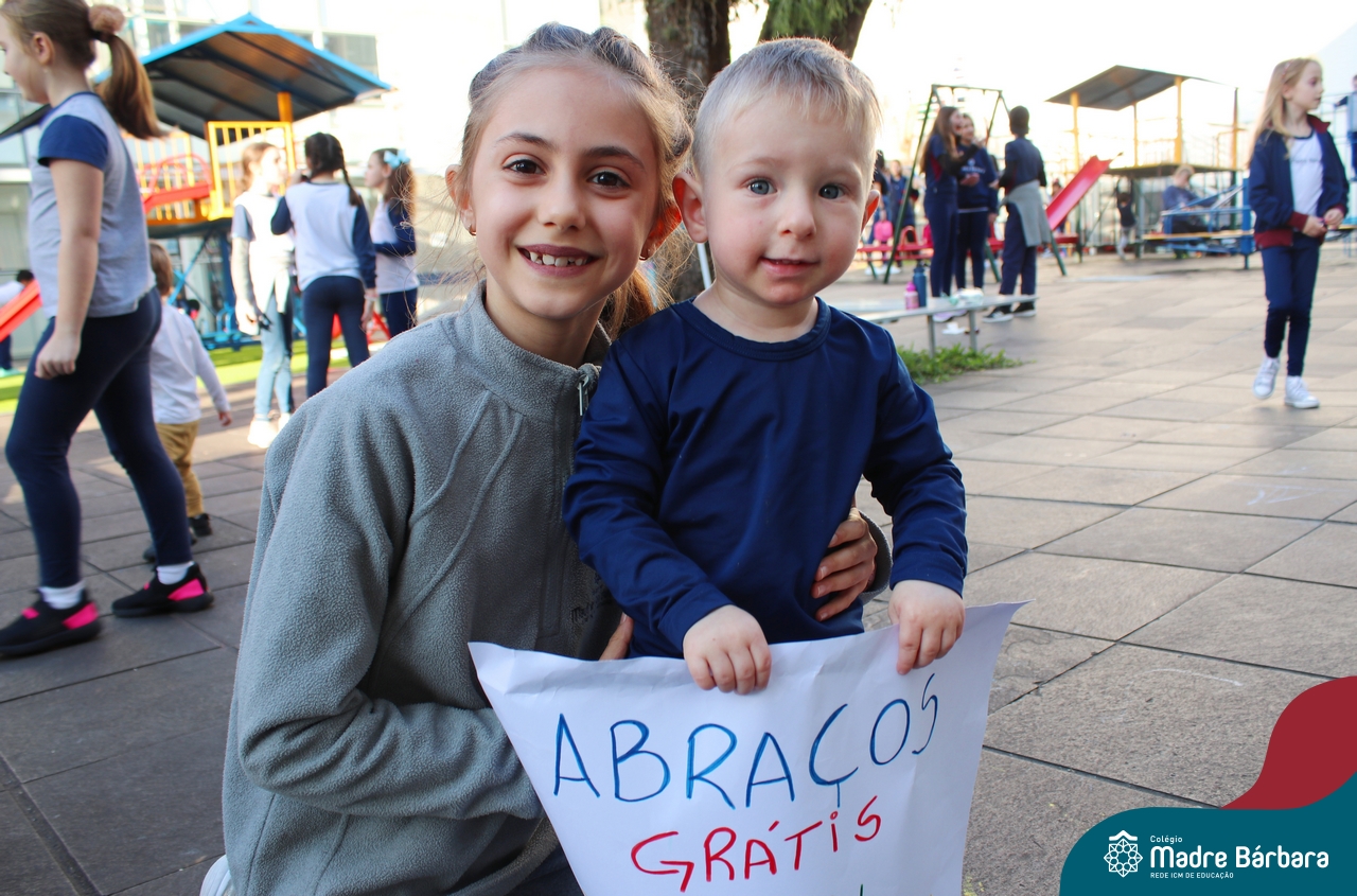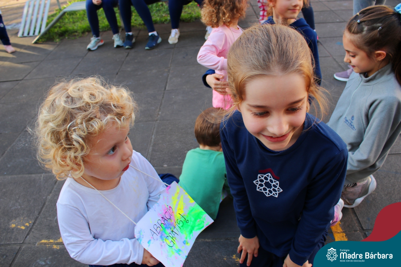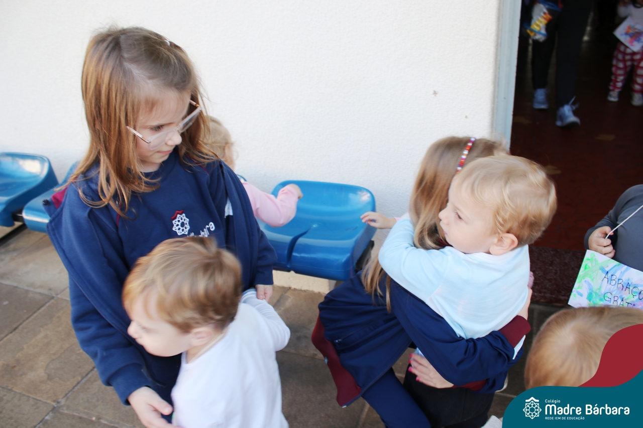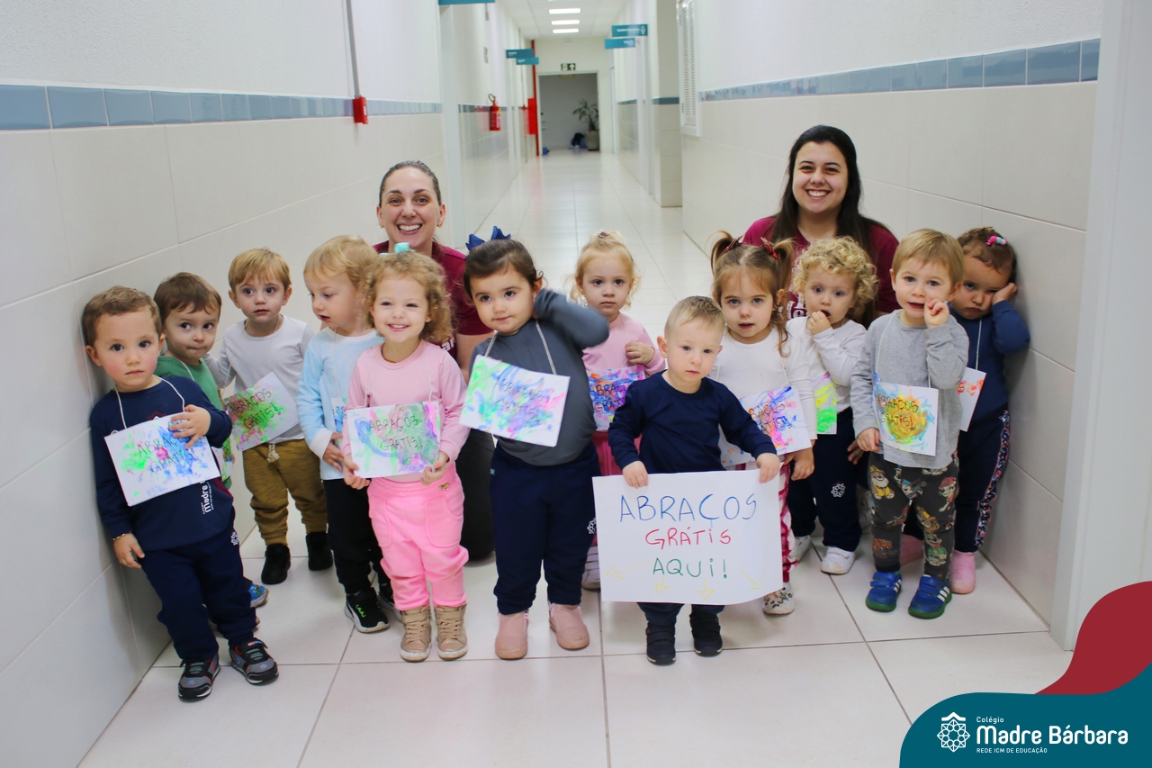 A partir do projeto “O que meu corpinho consegue fazer?” as crianças do nível 1D, turno da tarde, passearam por todo o Colégio Madre Bárbara – Rede ICM distribuindo “Abraços grátis”! Foram diversos dias em que alunos, professores e funcionários se encantaram em receber abraços carinhosos e as crianças puderam demonstrar carinho, amor e felicidade. Afinal, nosso corpinho pode ser muito afetuoso.