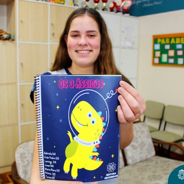 A aluna do 1º ano do Ensino Médio Maria Clara Rodrigues (15) adorou a experiência de criar um livro de história. “Pensamos o que gostávamos quando crianças, o que nos chamava mais atenção e escolhemos criar uma história com fatos reais, mesclada com a fantasia”. O grupo de Maria Clara teve como tema principal o período jurássico para atrair a curiosidade das crianças. “Fazer um trabalho prático nos permite aprender o conteúdo de uma forma diferente, facilitando ainda mais nosso aprendizado”.
